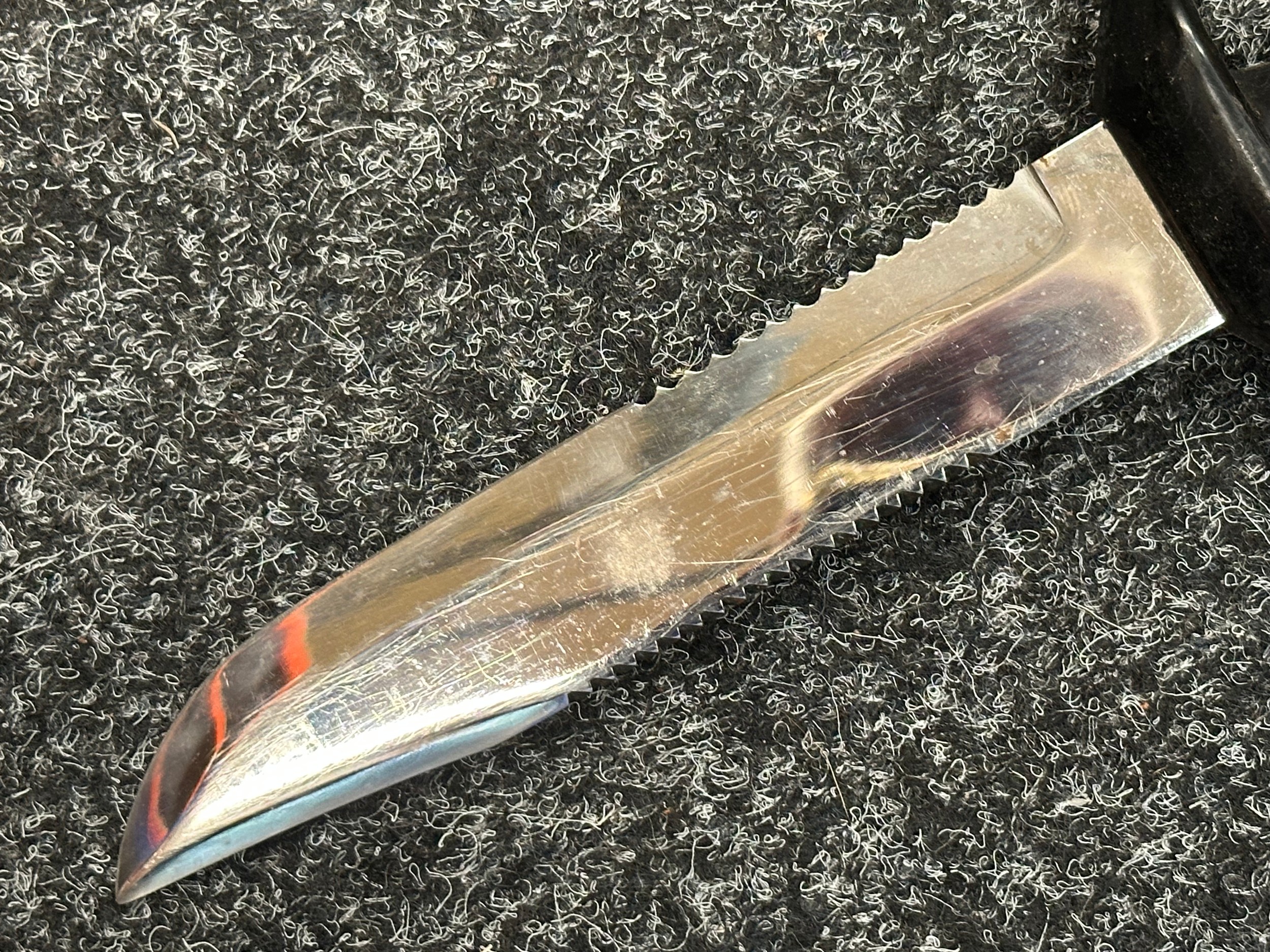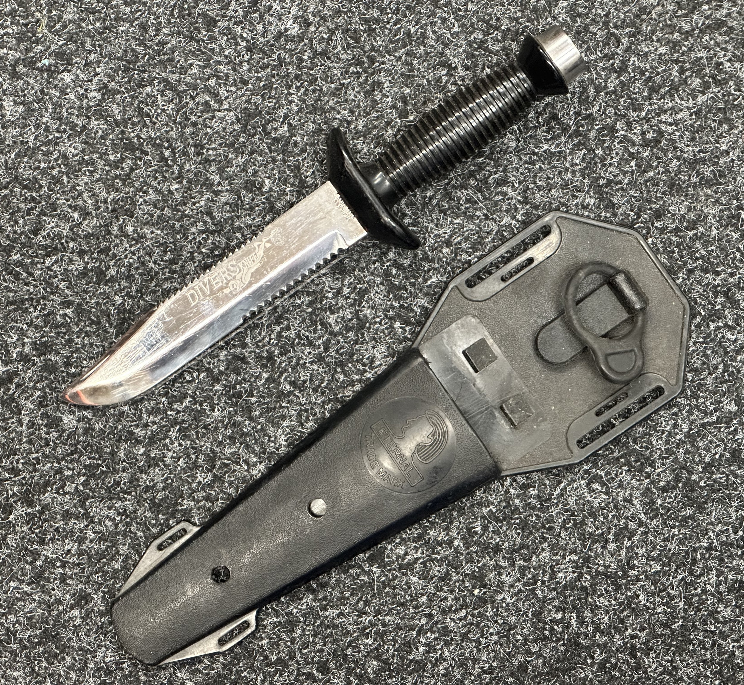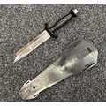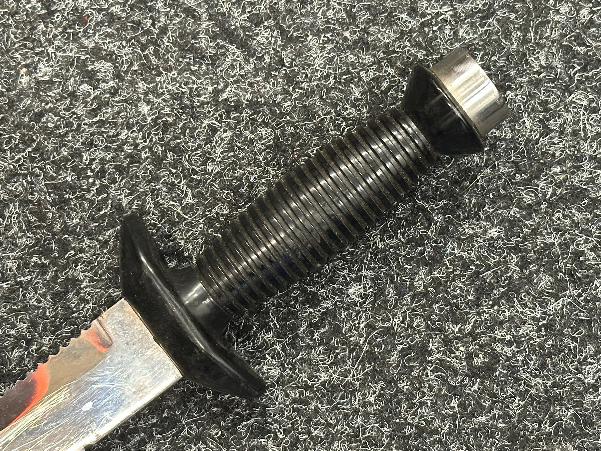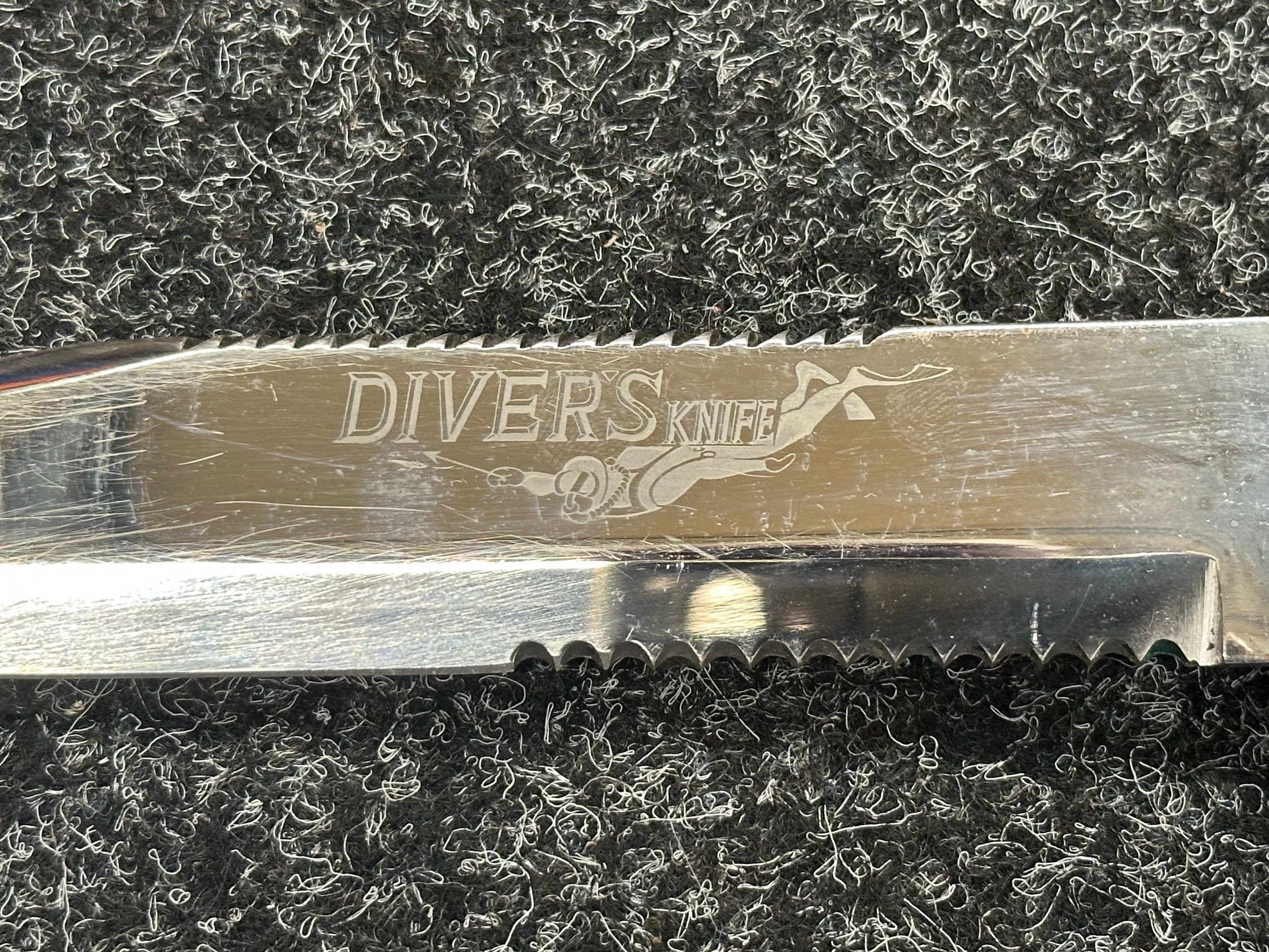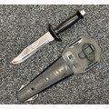 Divers Knife with Bowie Style Stainless Steel Blade 175mm in length. Moulded black plastic grip. Overall length 310mm. Japanese made. Complete with black plastic "Eternal" trademark scabbard.