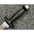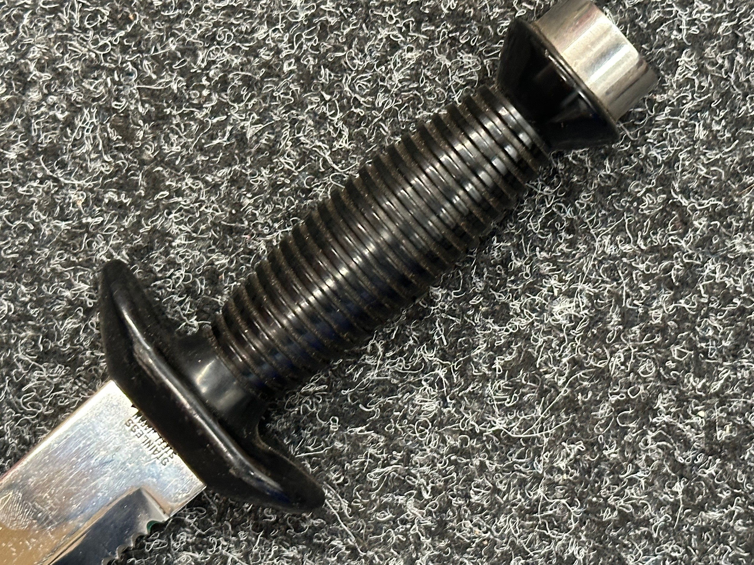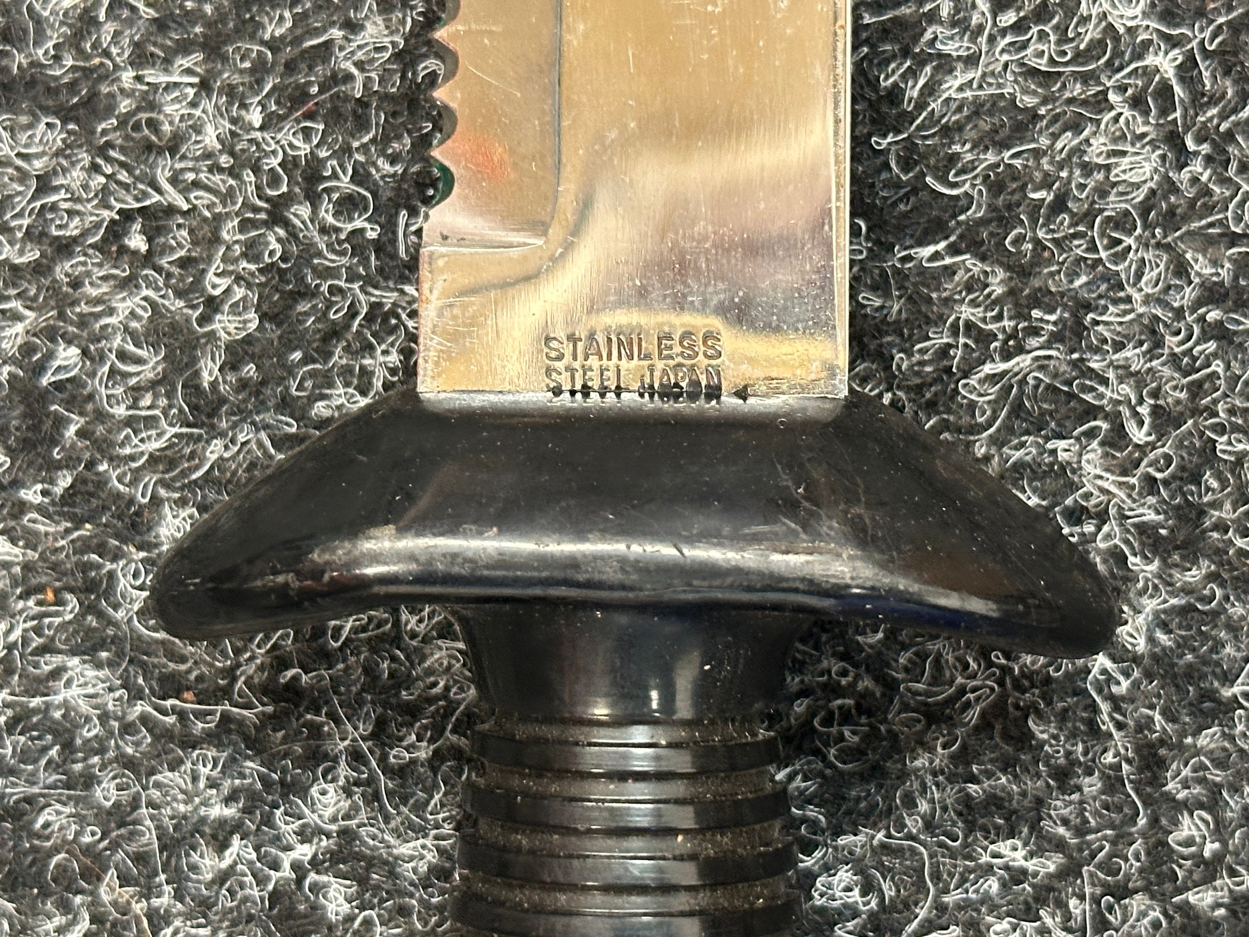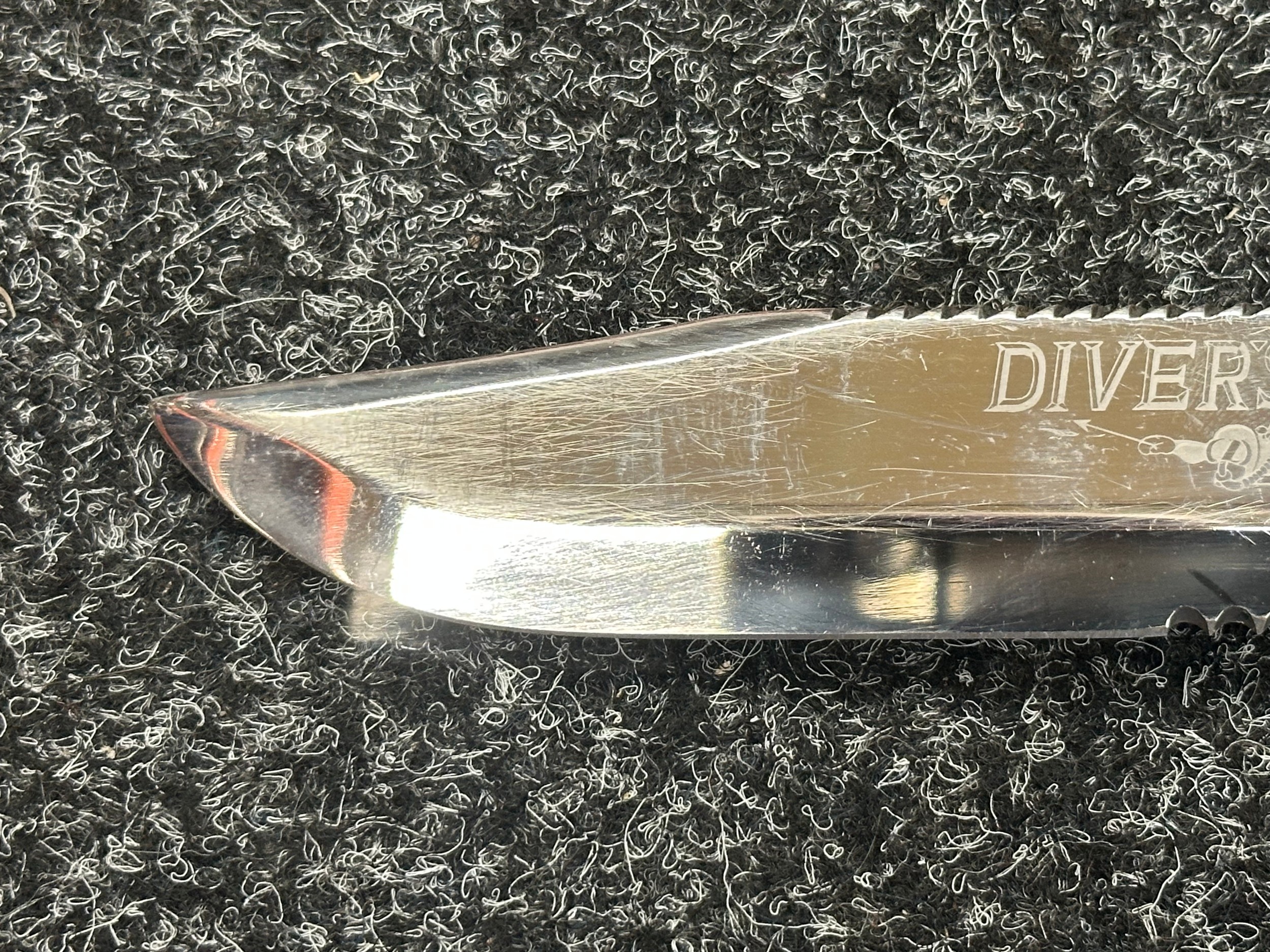 Divers Knife with Bowie Style Stainless Steel Blade 175mm in length. Moulded black plastic grip. Overall length 310mm. Japanese made. Complete with black plastic "Eternal" trademark scabbard.