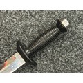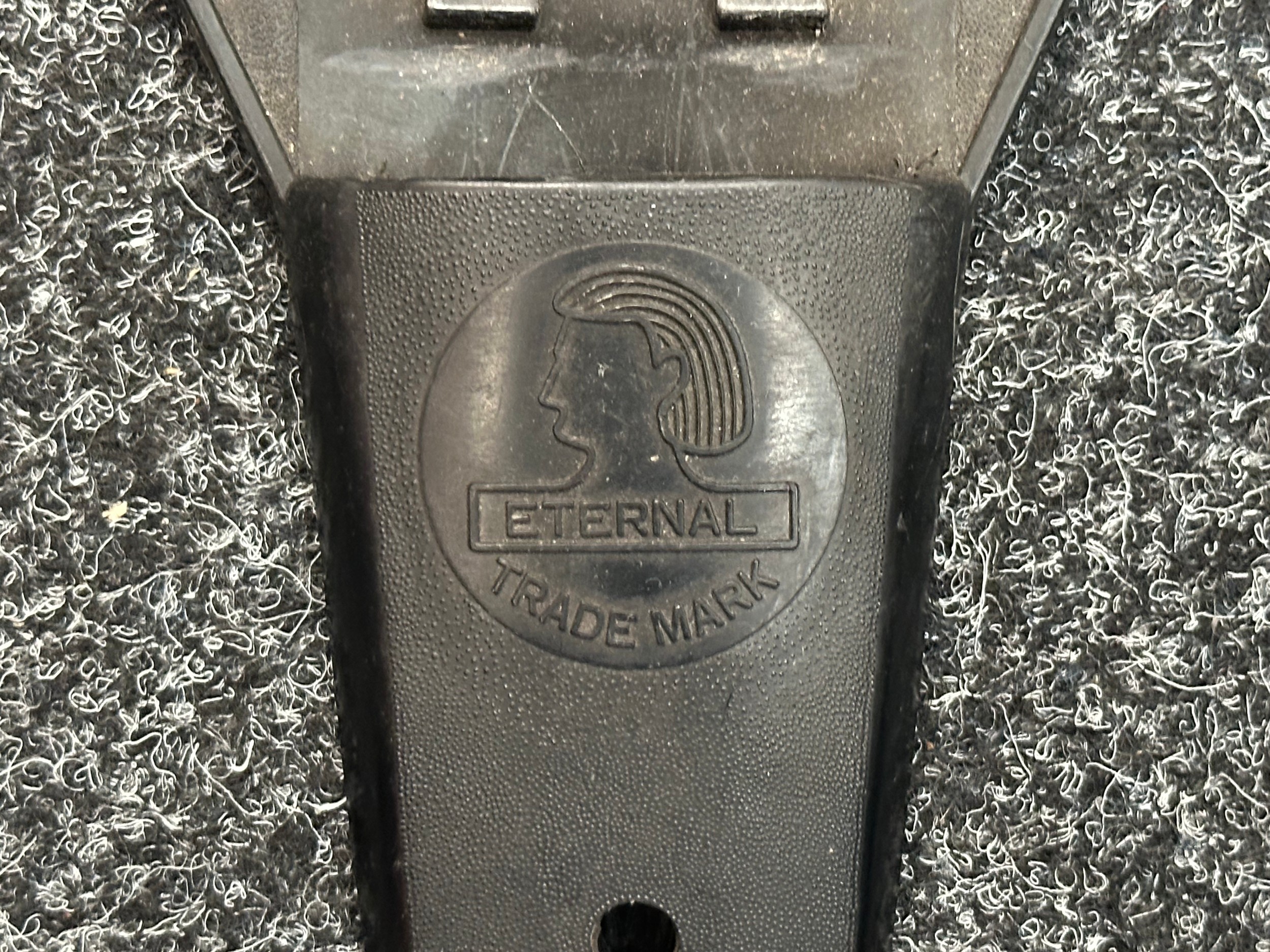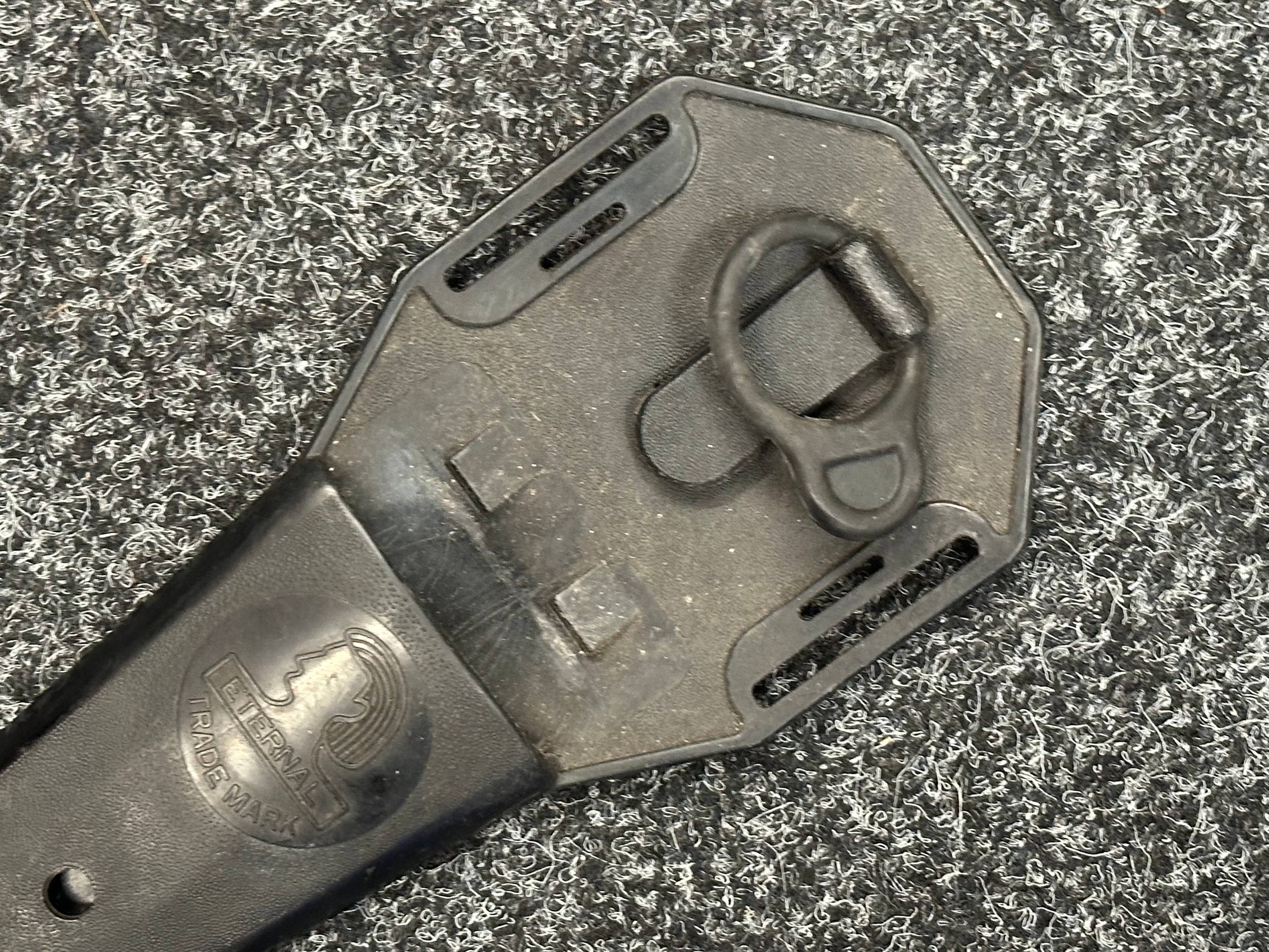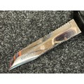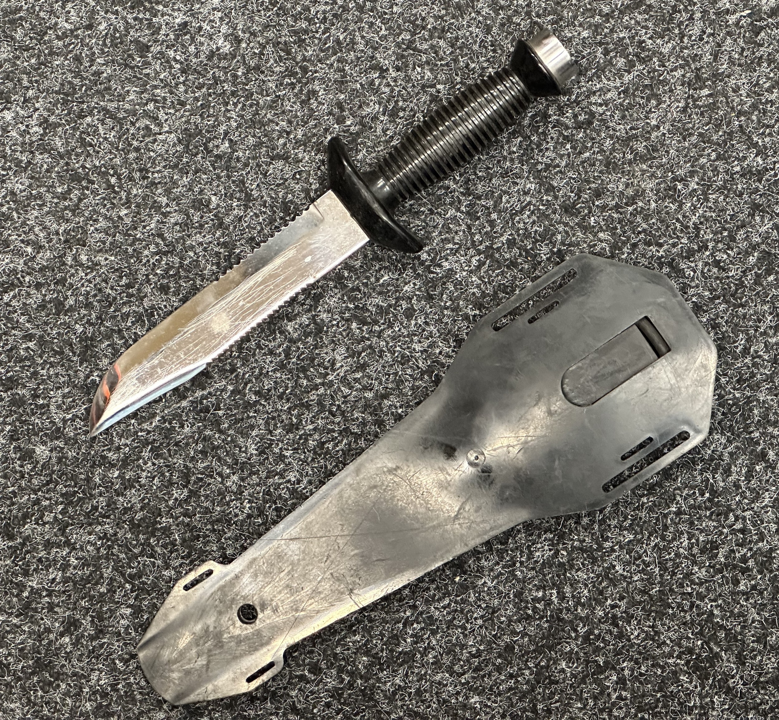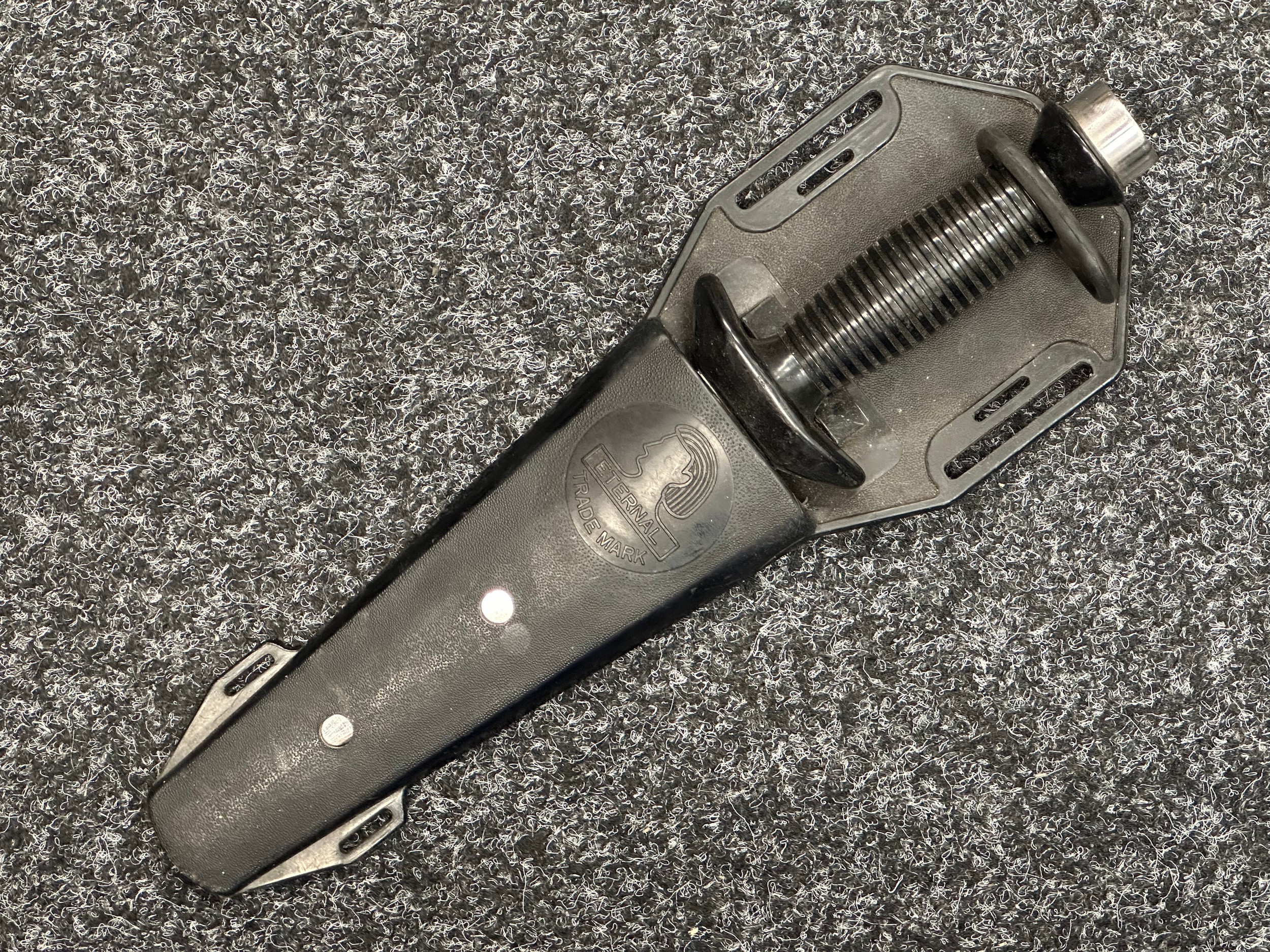 Divers Knife with Bowie Style Stainless Steel Blade 175mm in length. Moulded black plastic grip. Overall length 310mm. Japanese made. Complete with black plastic "Eternal" trademark scabbard.