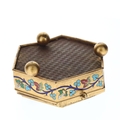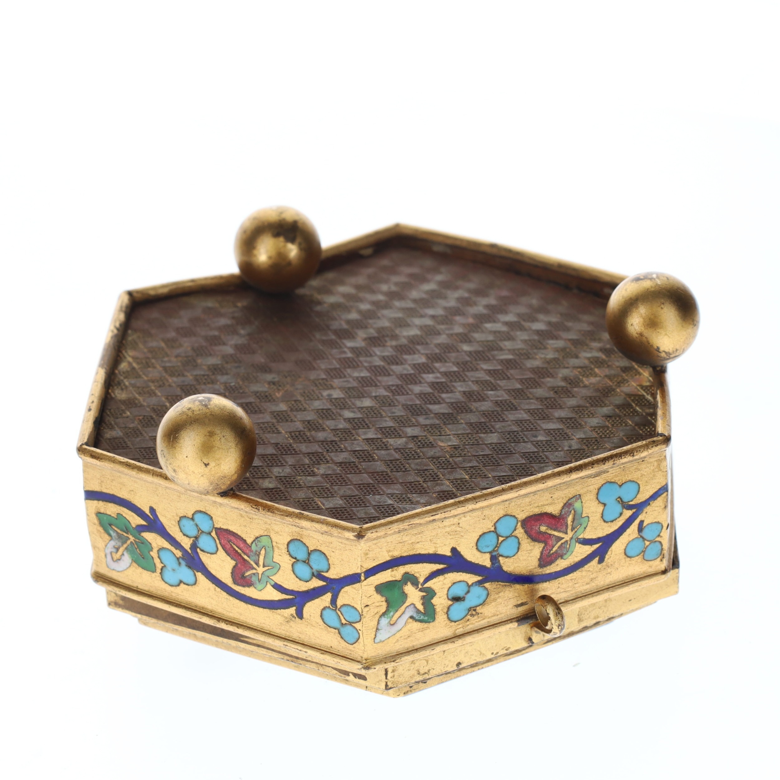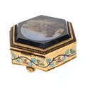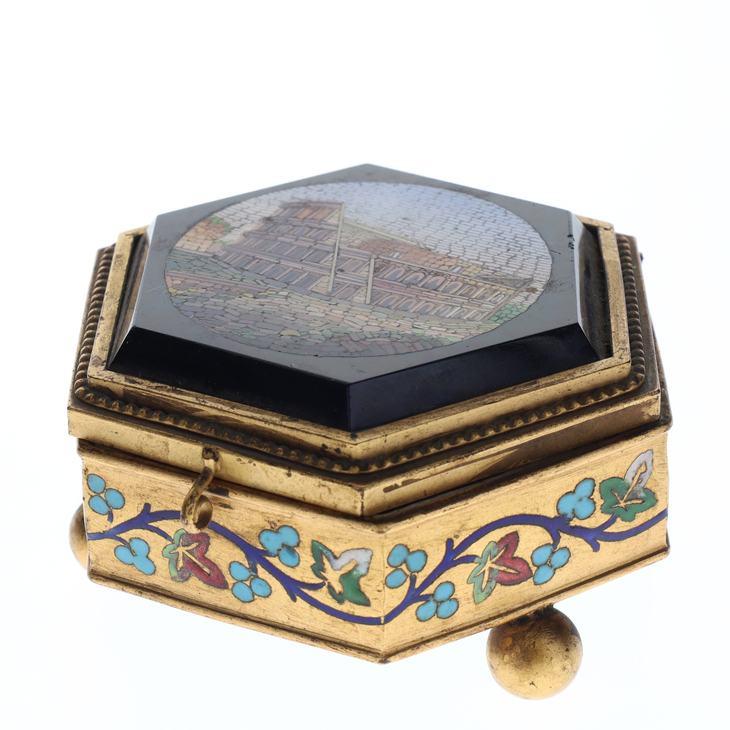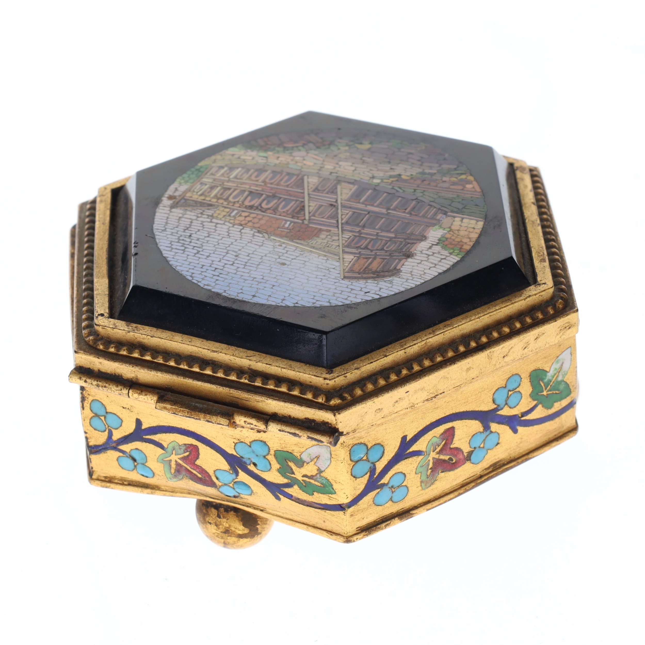Antique Micro Mosaic Gilt Box Depicting Roman Colosseum. An antique gilt box with enamel decorations, ball feet, and a micro mosaic top depicting the Roman Colosseum. The box has a cream satin interior with the maker, Cesare Roccheggiani, credited on the inner lid. The box's hinges are slightly damaged, making the lid close slightly off-centre. There is additional minor damage and tarnishing to the gilt exterior and enamel flowers, and the interior would benefit from general cleaning.
