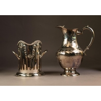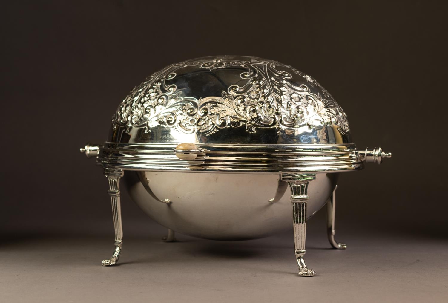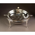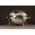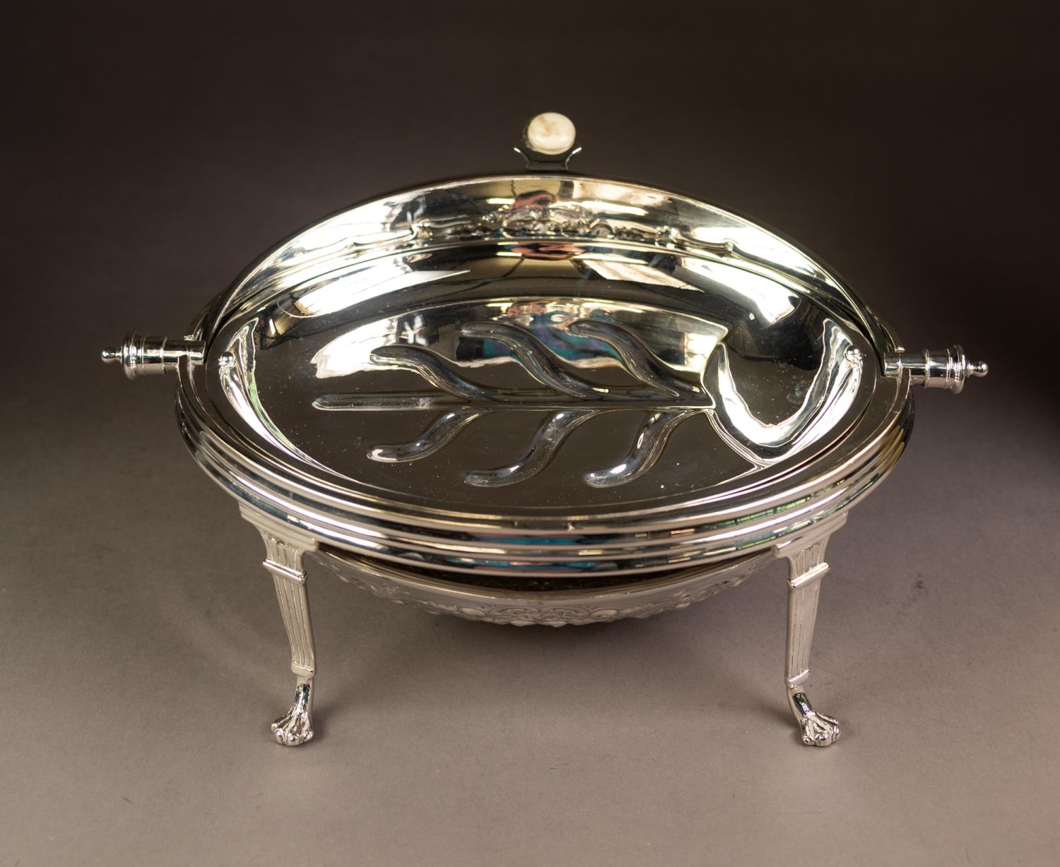 ELECTROPLATED OVAL BREAKFAST DISH, with embossed scroll decoration to the revolving cover, removable liner, and flat, fluted supports with paw feet, 8” (20.3cm) high