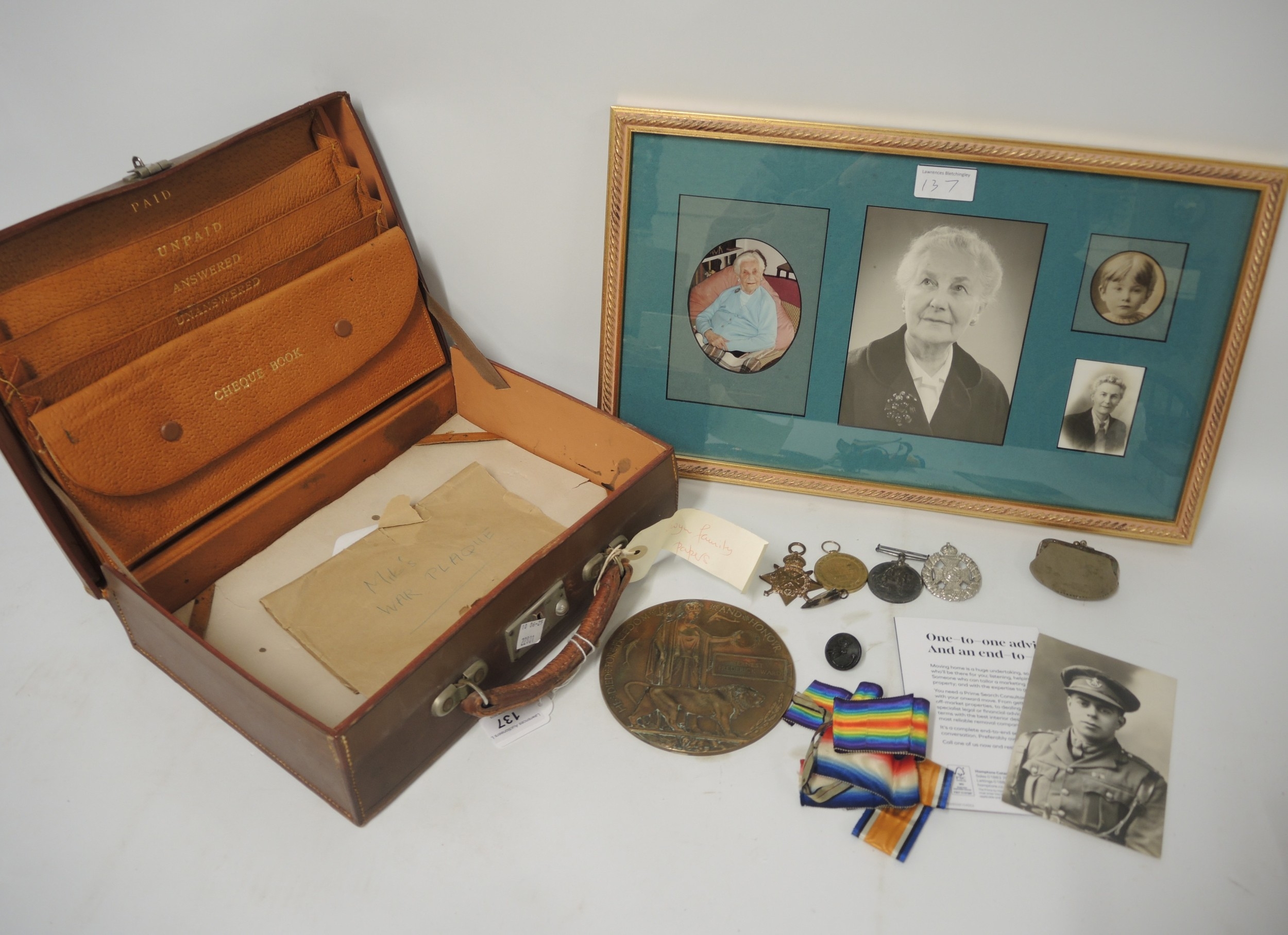 World War I three medal group awarded to Private E.P. Ward, later Lance Corporal, Third Rifle Brigade, together with bronze death plaque
