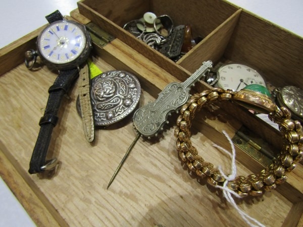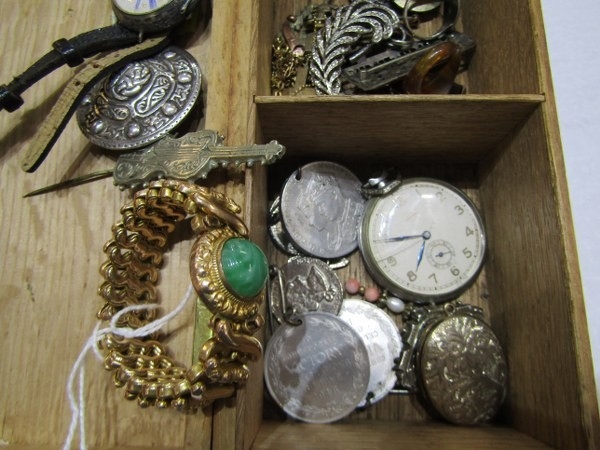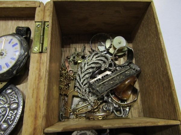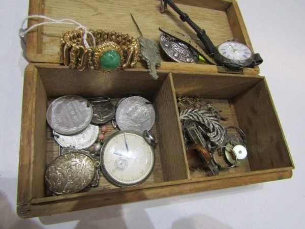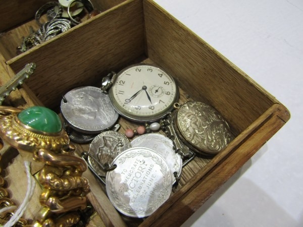 SILVER & COSTUME JEWELLERY, wooden casket containing silver jewellery brooches and pendants, medallions, silver cased wrist watch, etc