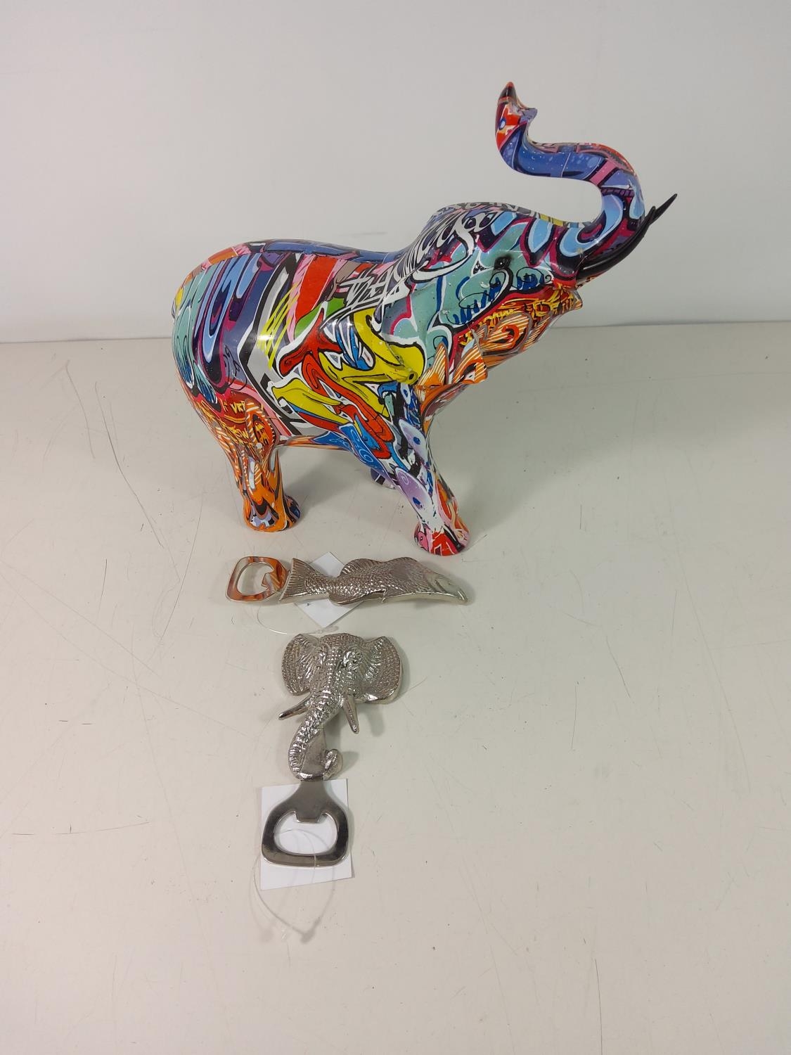 2 bottle openers in the form of animals and a graffiti elephant