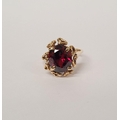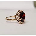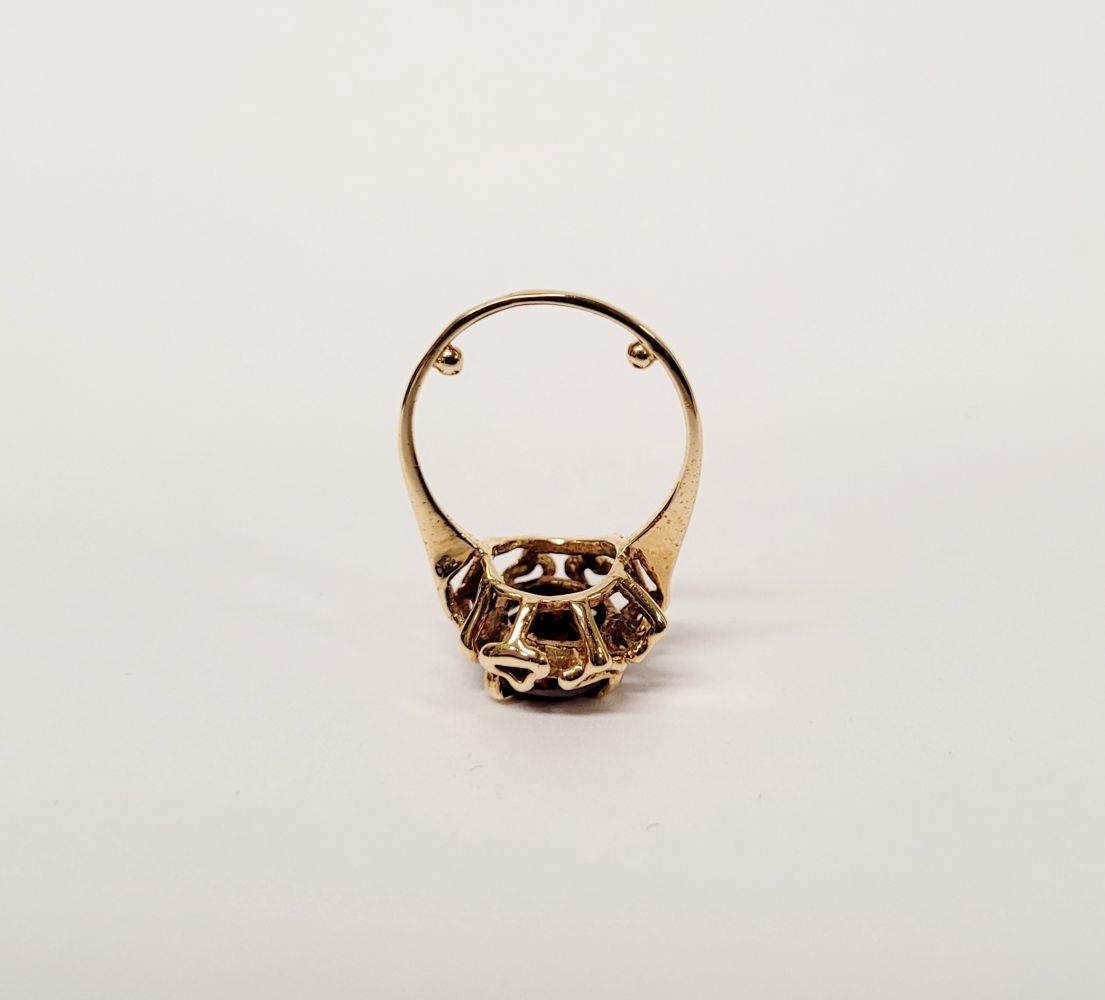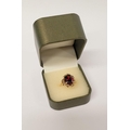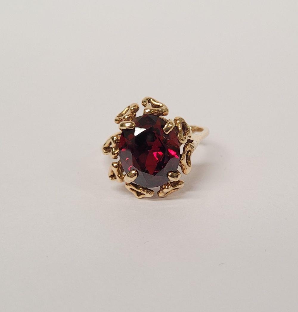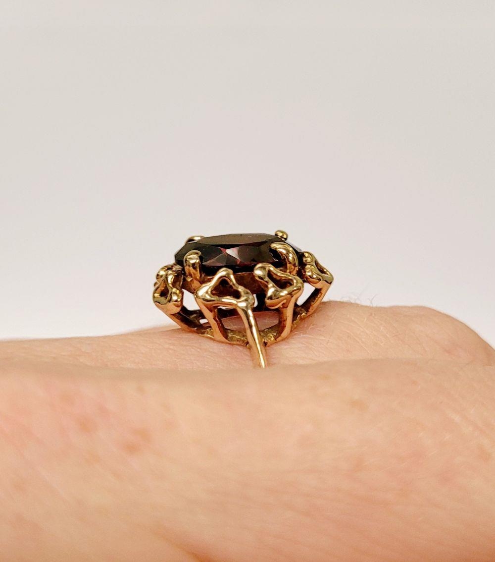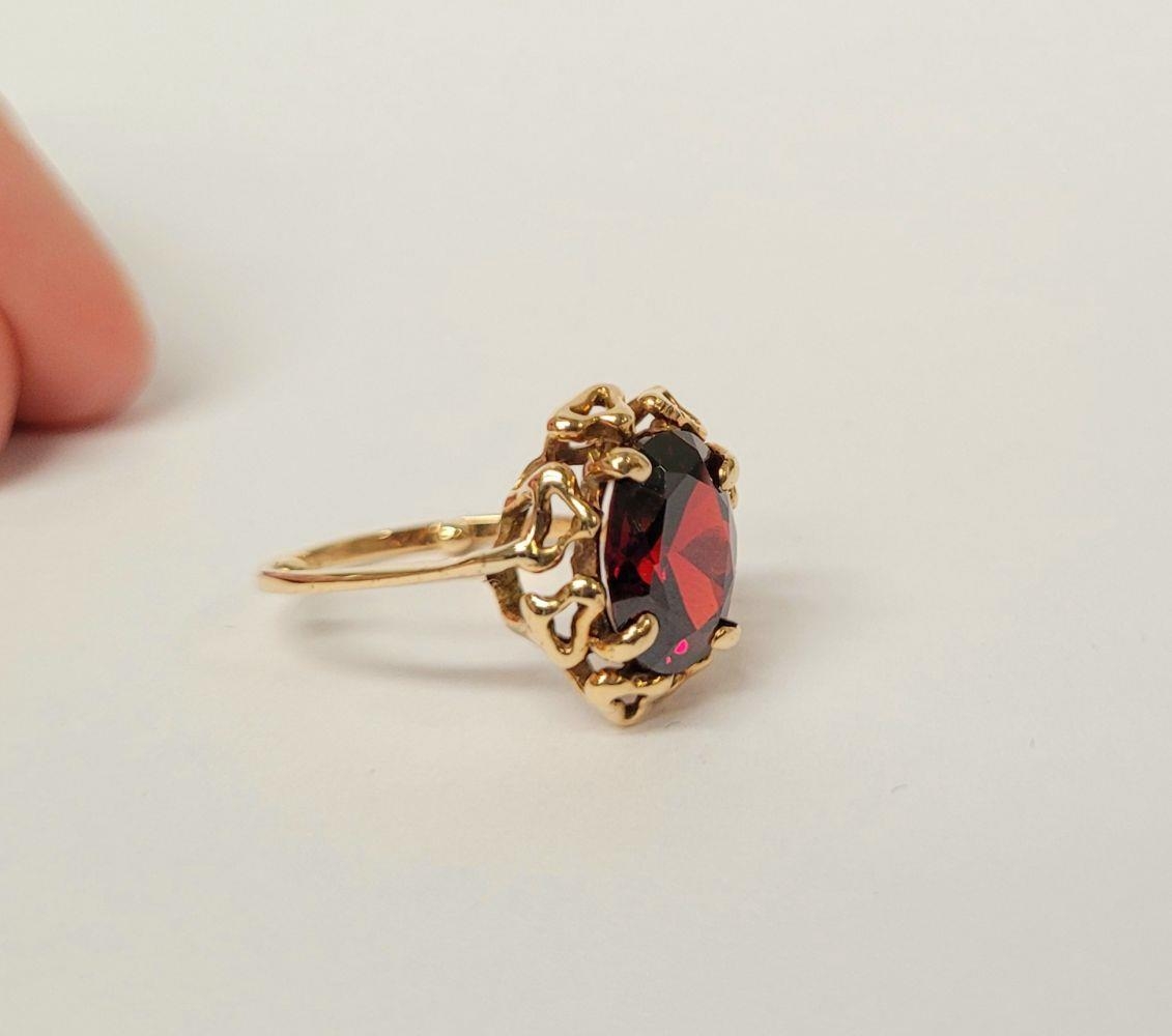 A BEAUTIFUL YELLOW GOLD & GARNET RING, with an open work edge that holds the large oval shaped garnet stone to the centre, the hallmarks are rubbed and there are re-size balls added at some stage that also seem to cover a hallmark. Possibly 9ct yellow gold. Ring size: K ½.