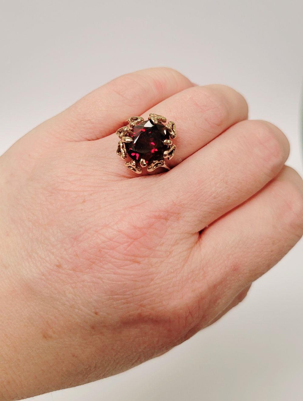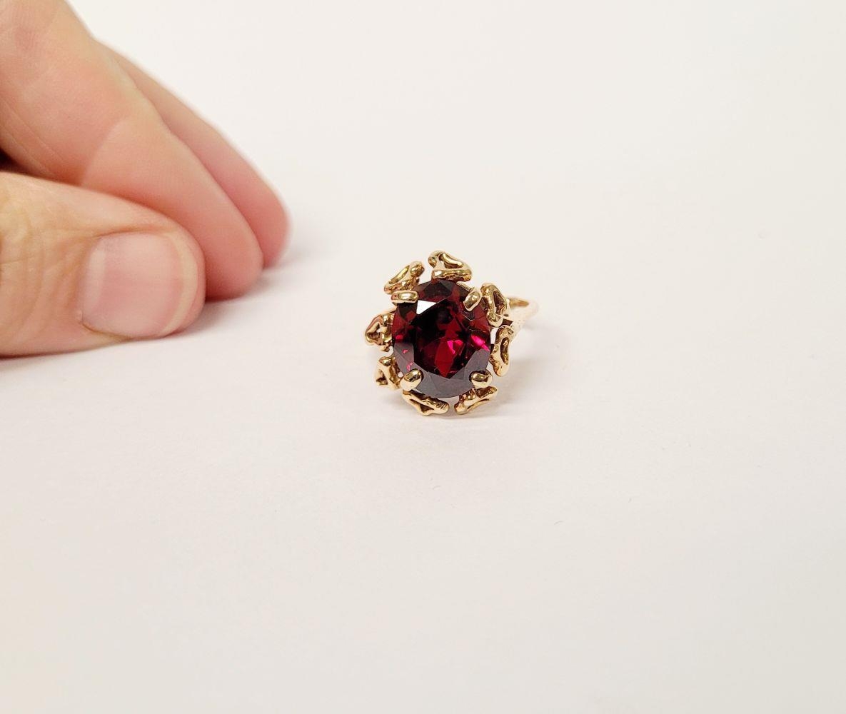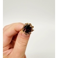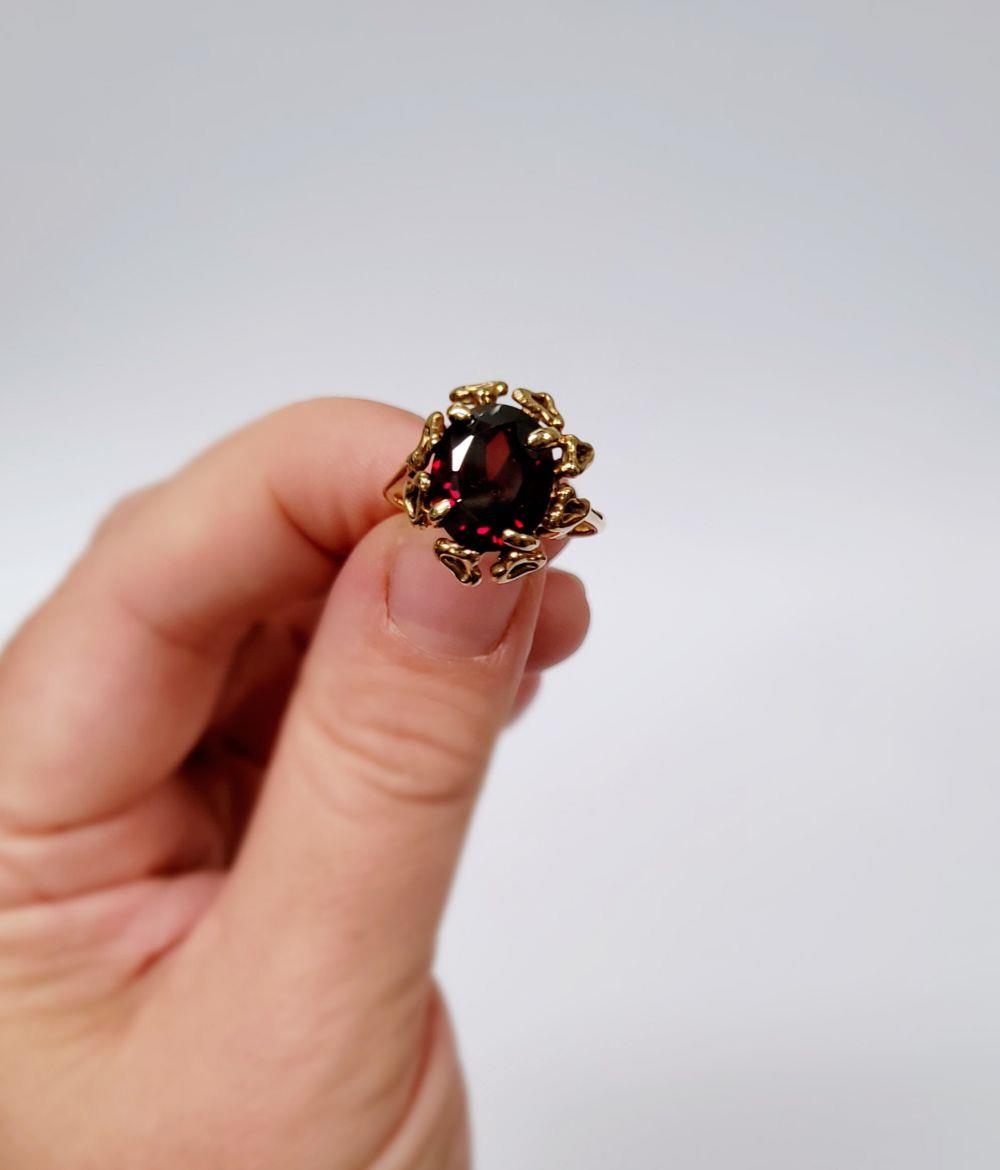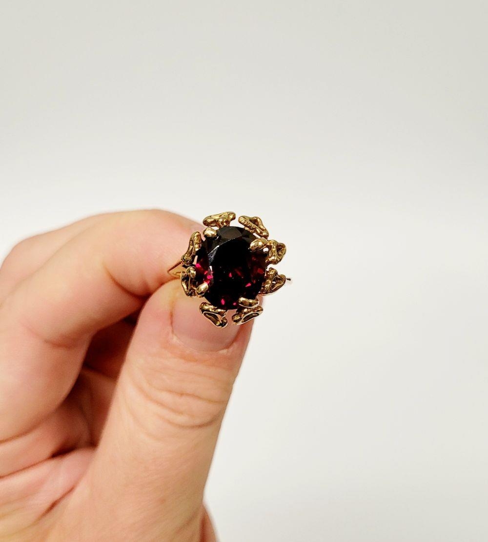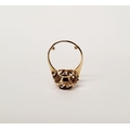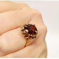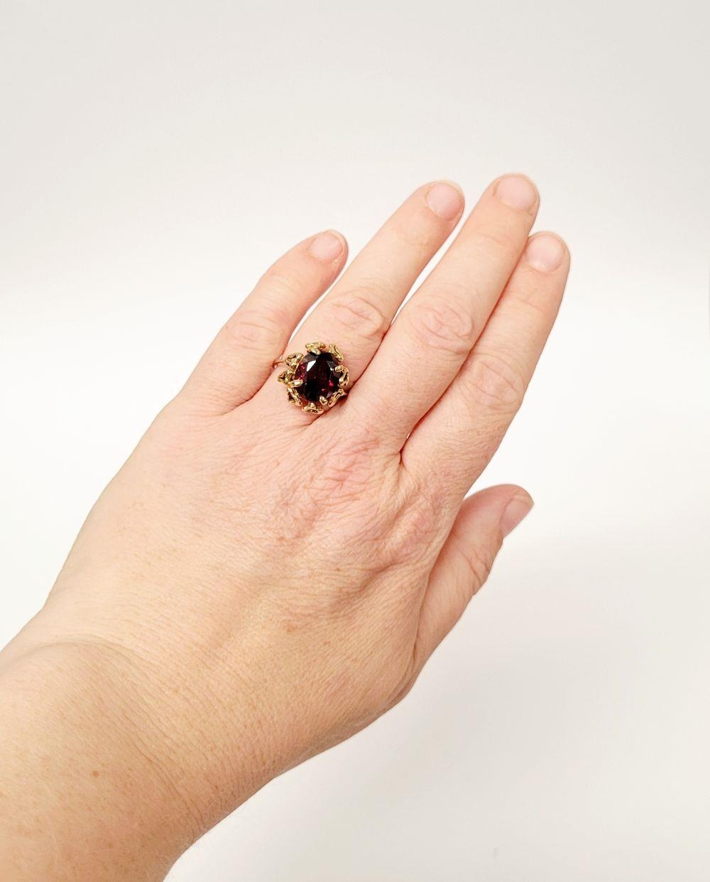 A BEAUTIFUL YELLOW GOLD & GARNET RING, with an open work edge that holds the large oval shaped garnet stone to the centre, the hallmarks are rubbed and there are re-size balls added at some stage that also seem to cover a hallmark. Possibly 9ct yellow gold. Ring size: K ½.