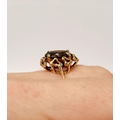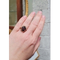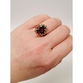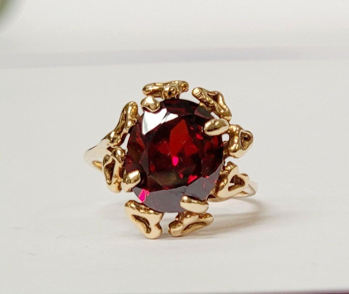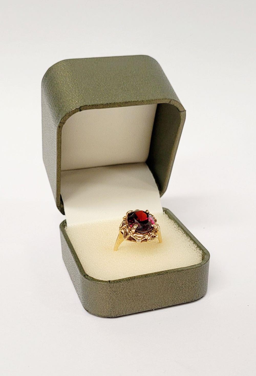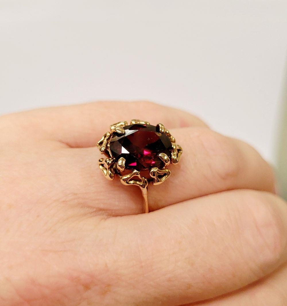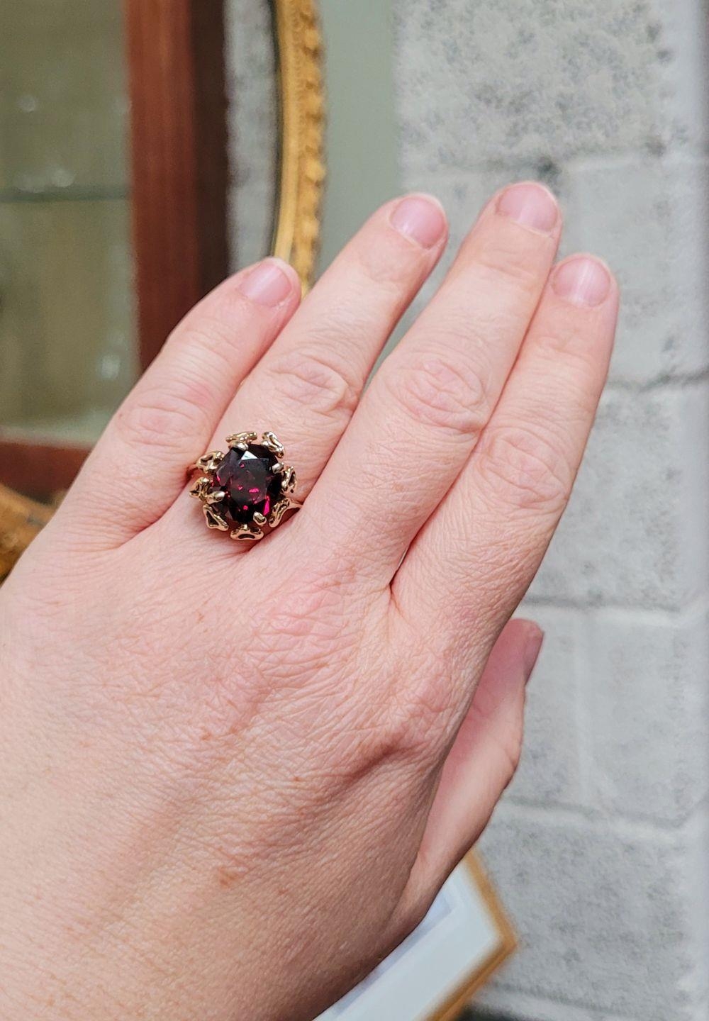 A BEAUTIFUL YELLOW GOLD & GARNET RING, with an open work edge that holds the large oval shaped garnet stone to the centre, the hallmarks are rubbed and there are re-size balls added at some stage that also seem to cover a hallmark. Possibly 9ct yellow gold. Ring size: K ½.