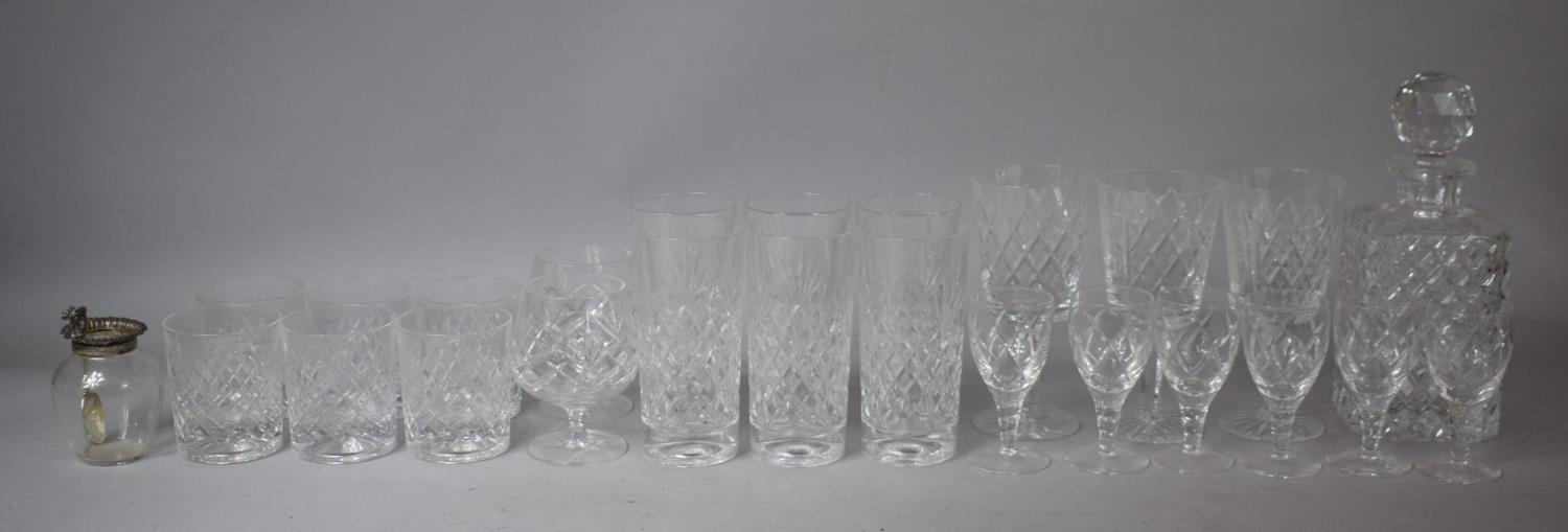 A Collection of Drinking Glasses to Include Six Highball Tumblers, Five Whiskies, Six Sherries, Three Commemorative Goblets, Spirit Decanter etc