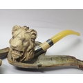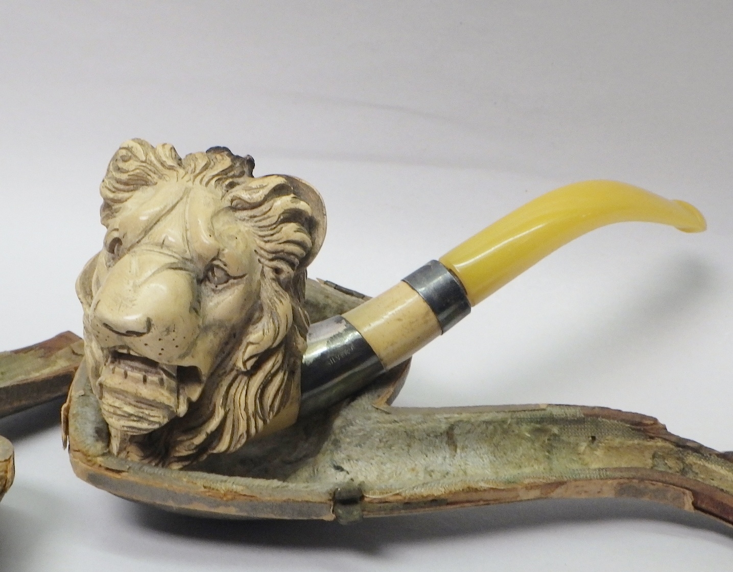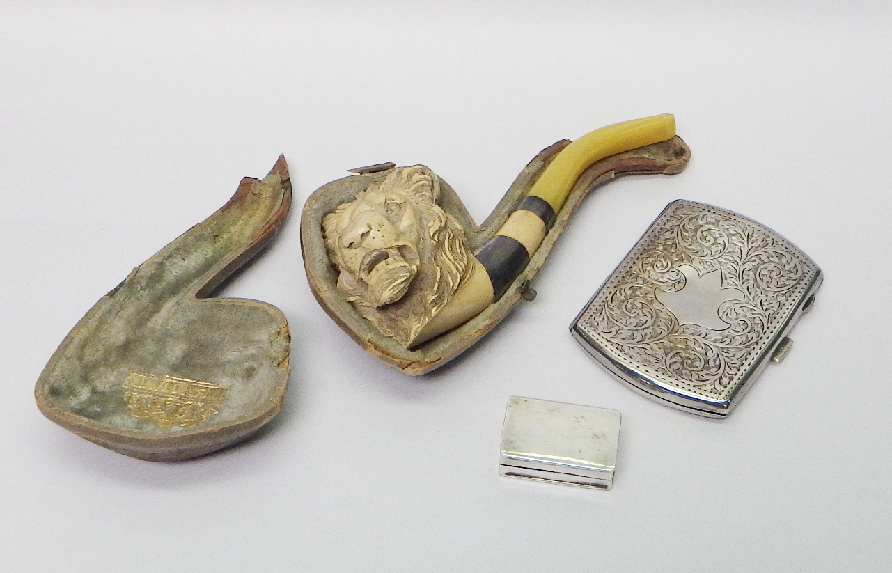 A silver cigarette case, 70g; a meerschaum pipe carved with a lion head mask; a trinket box, white metal marked Sterling.