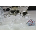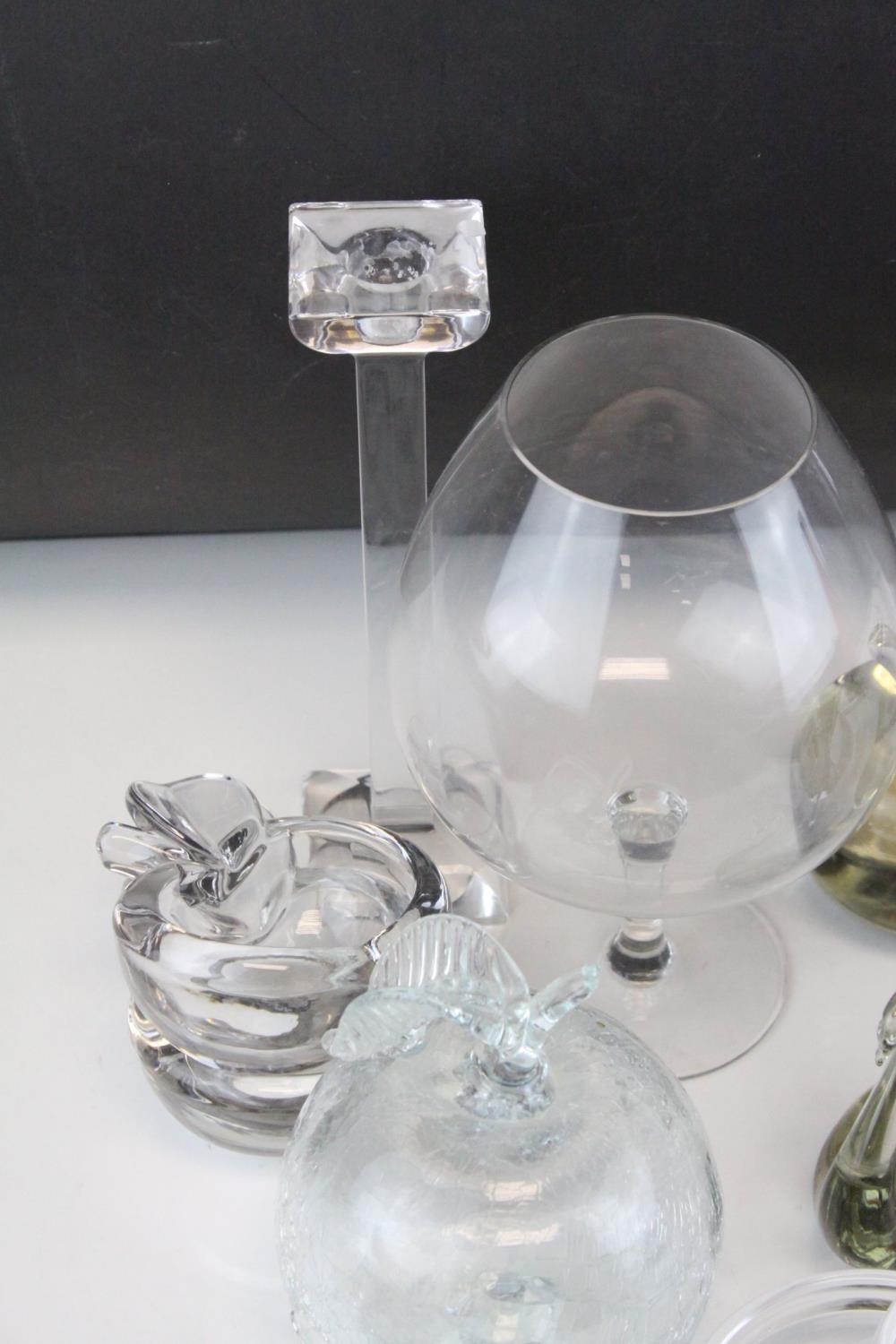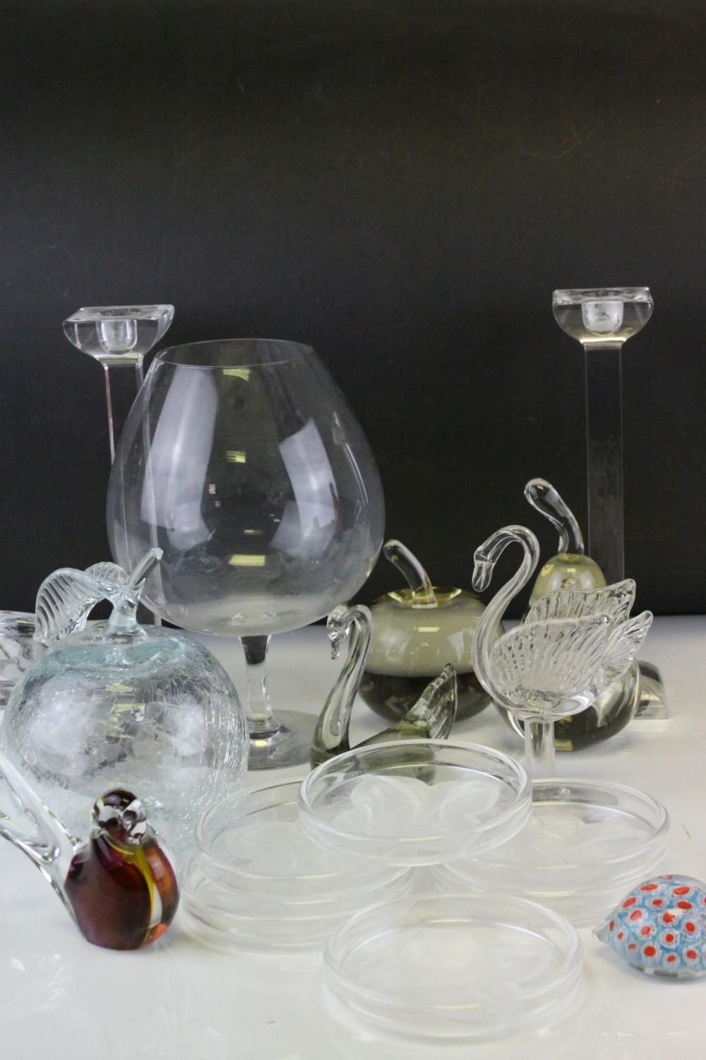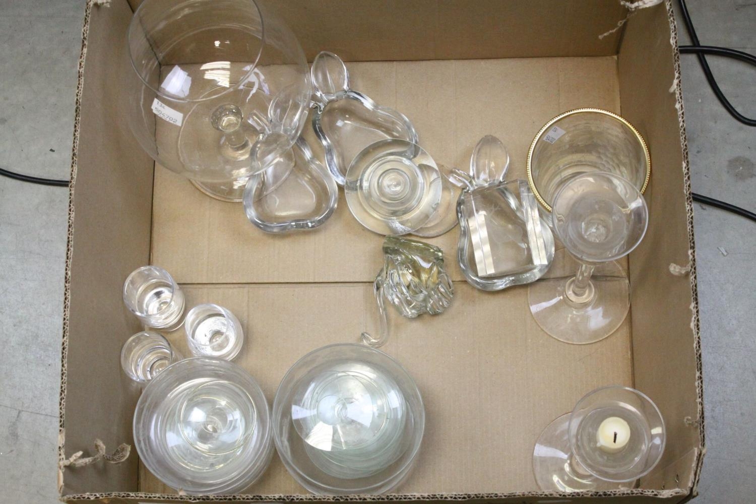 Tray of Mixed Glassware including Candlesticks, Paperweights, Bowls, etc