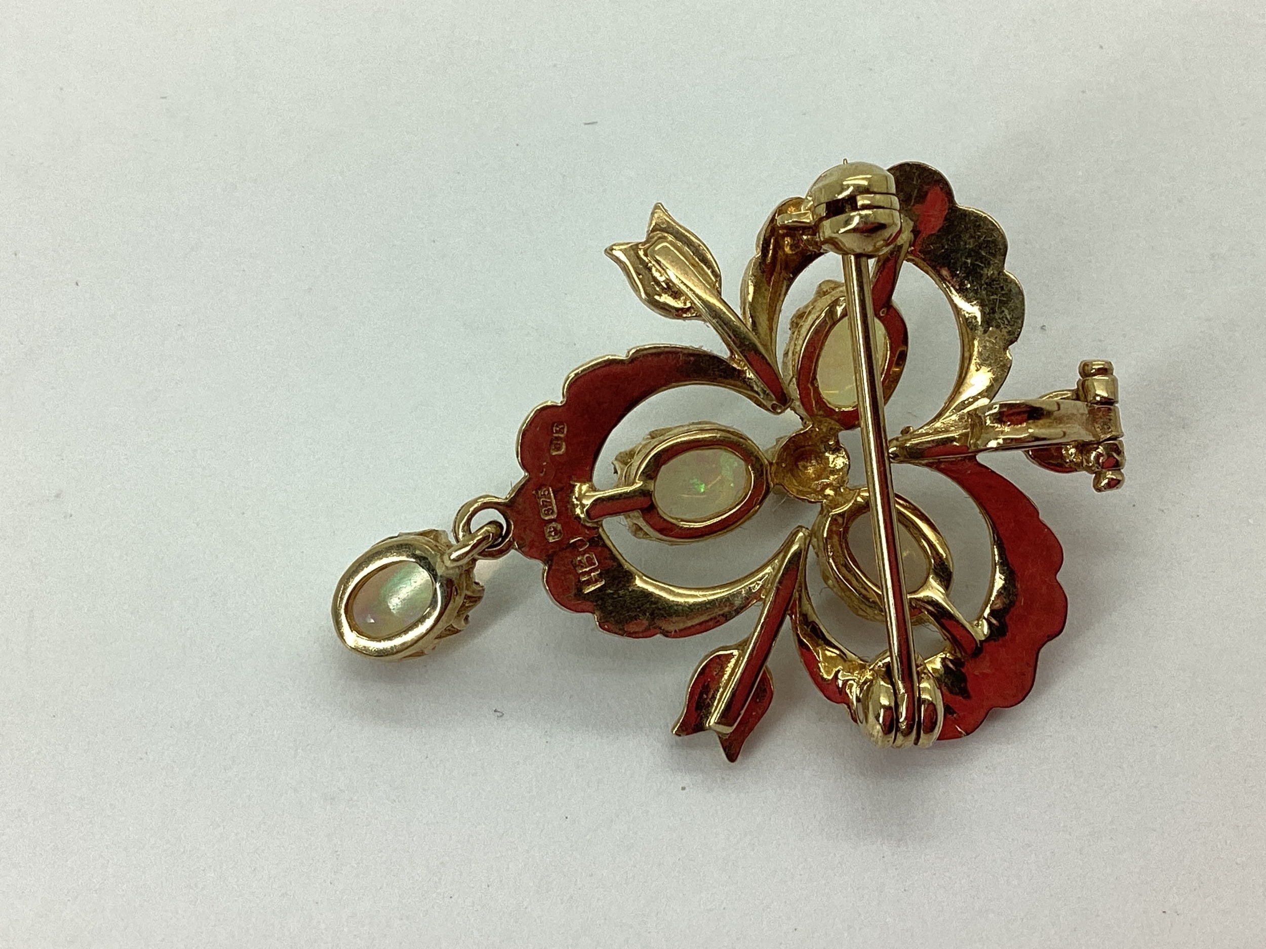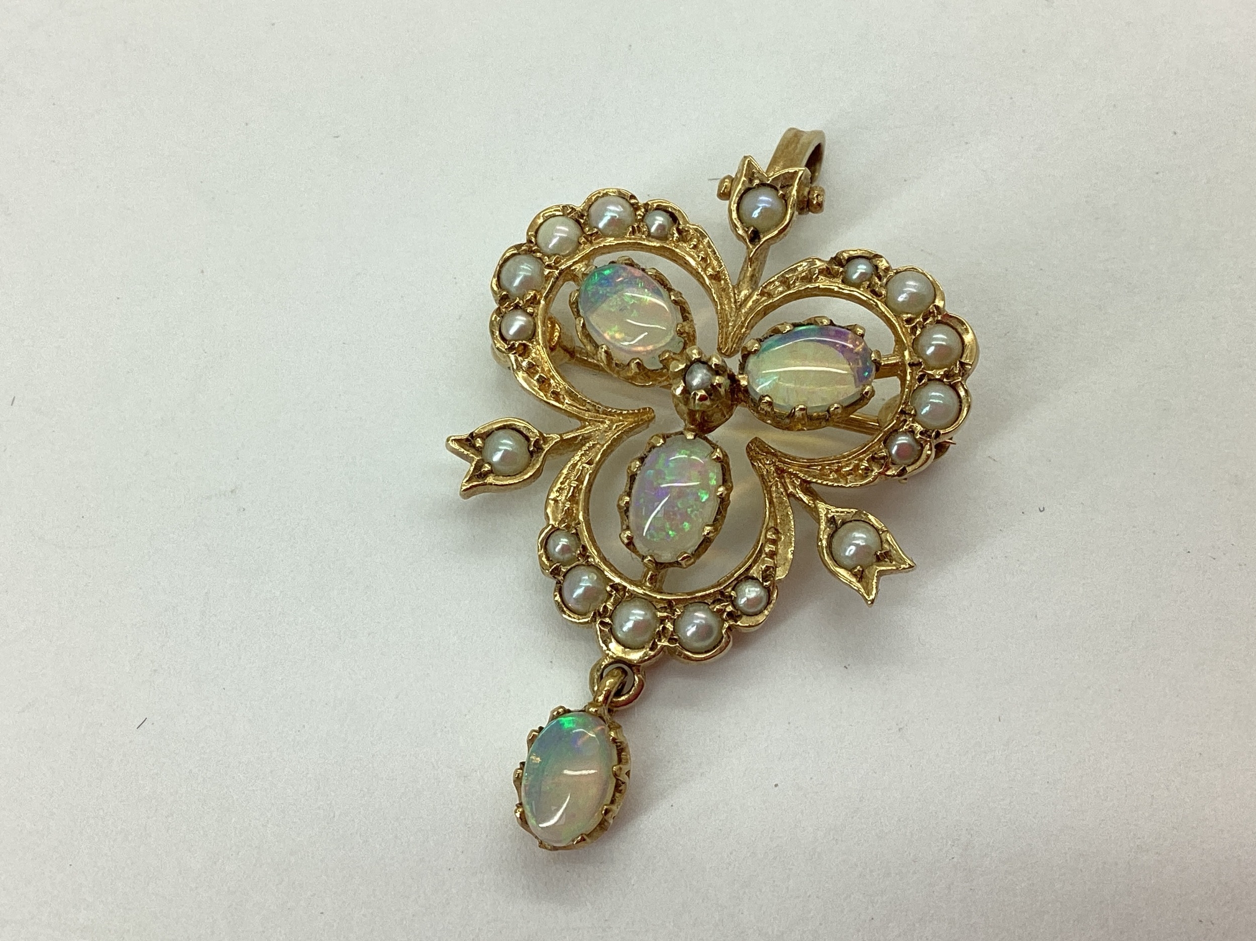A Modern 9ct Gold Opal and Pearl Pendant / Brooch, of Victorian style, oval cabochon claw set (overall length 4.2cm). [763501]