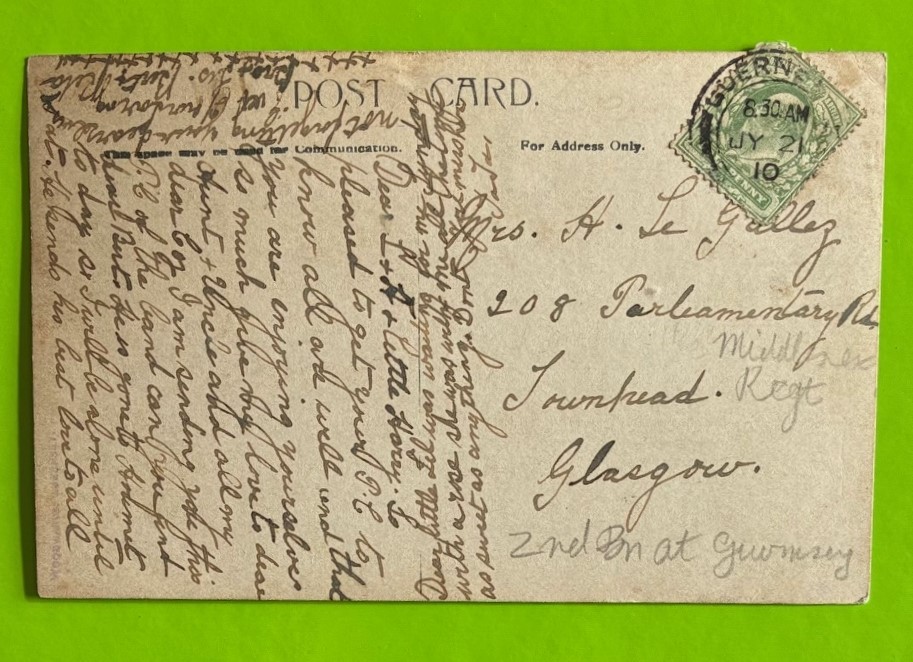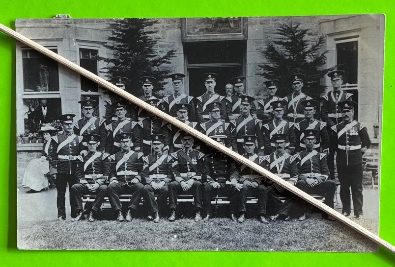 Real photographic postcard by Woodwards Guernsey, possibly the 2nd Battalion Middlesex Regiment in Guernsey, posted 1910.