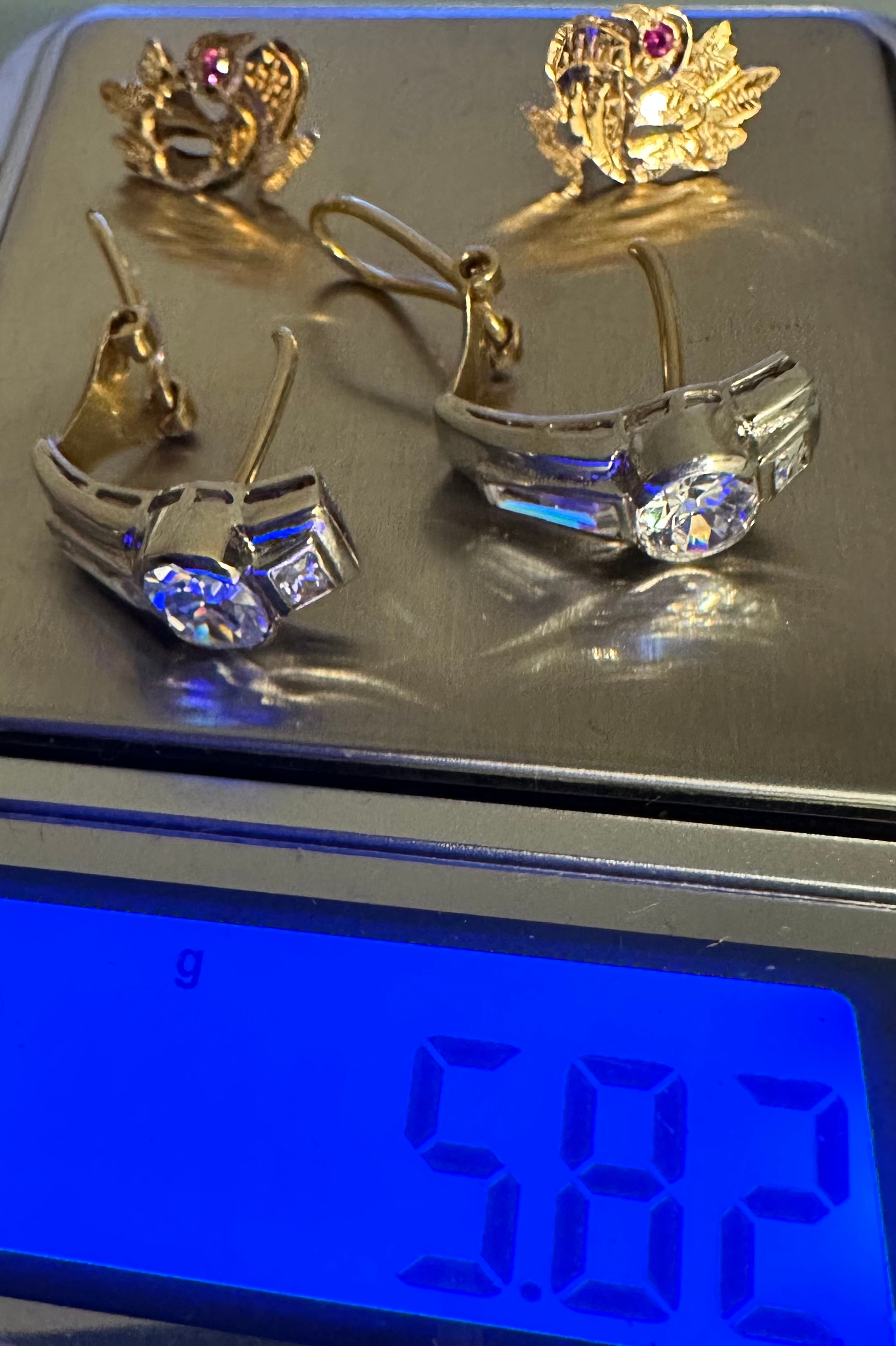 2 pairs stamped 750 gold earrings, yellow gold pair missing screw backs, 5.82g