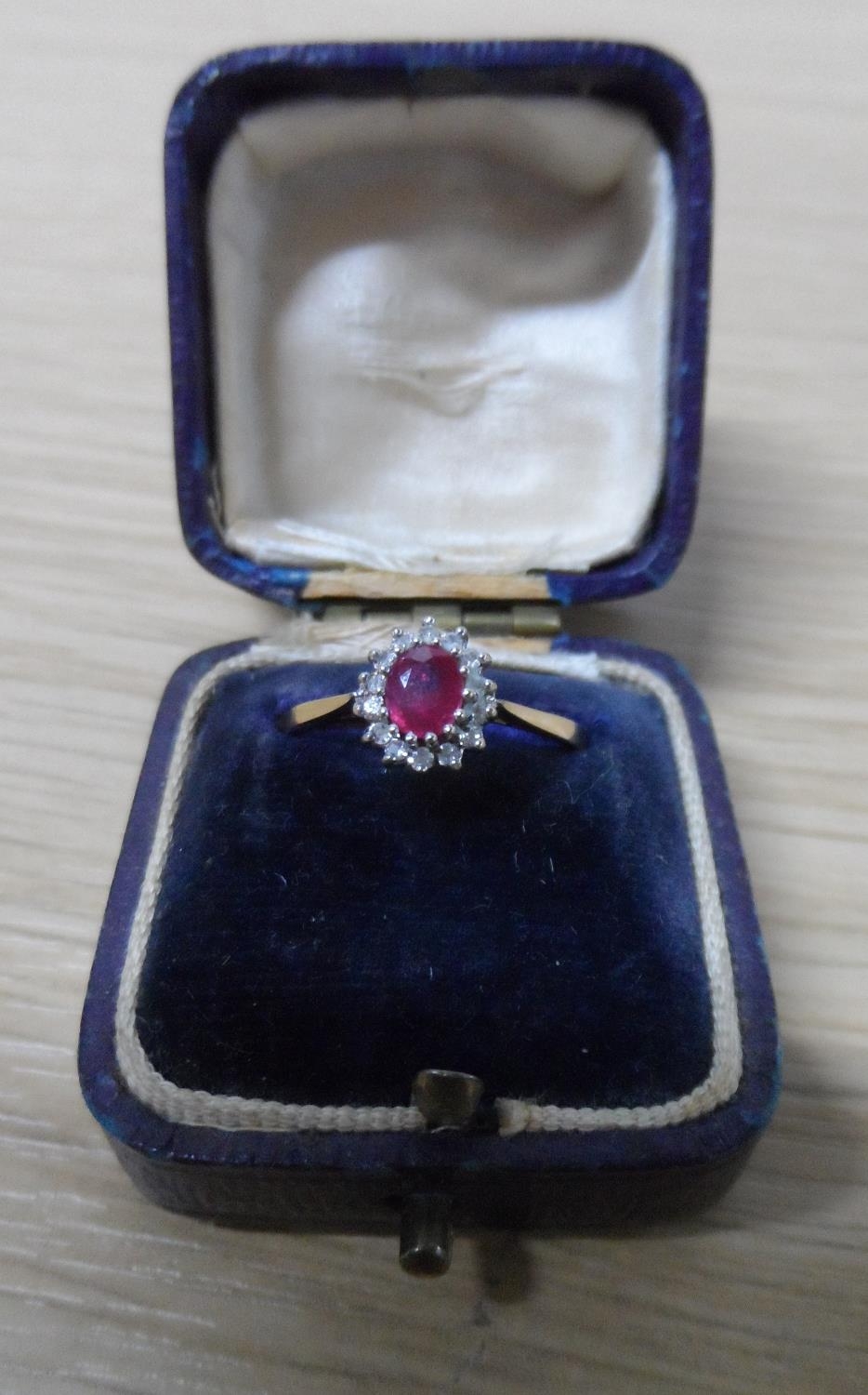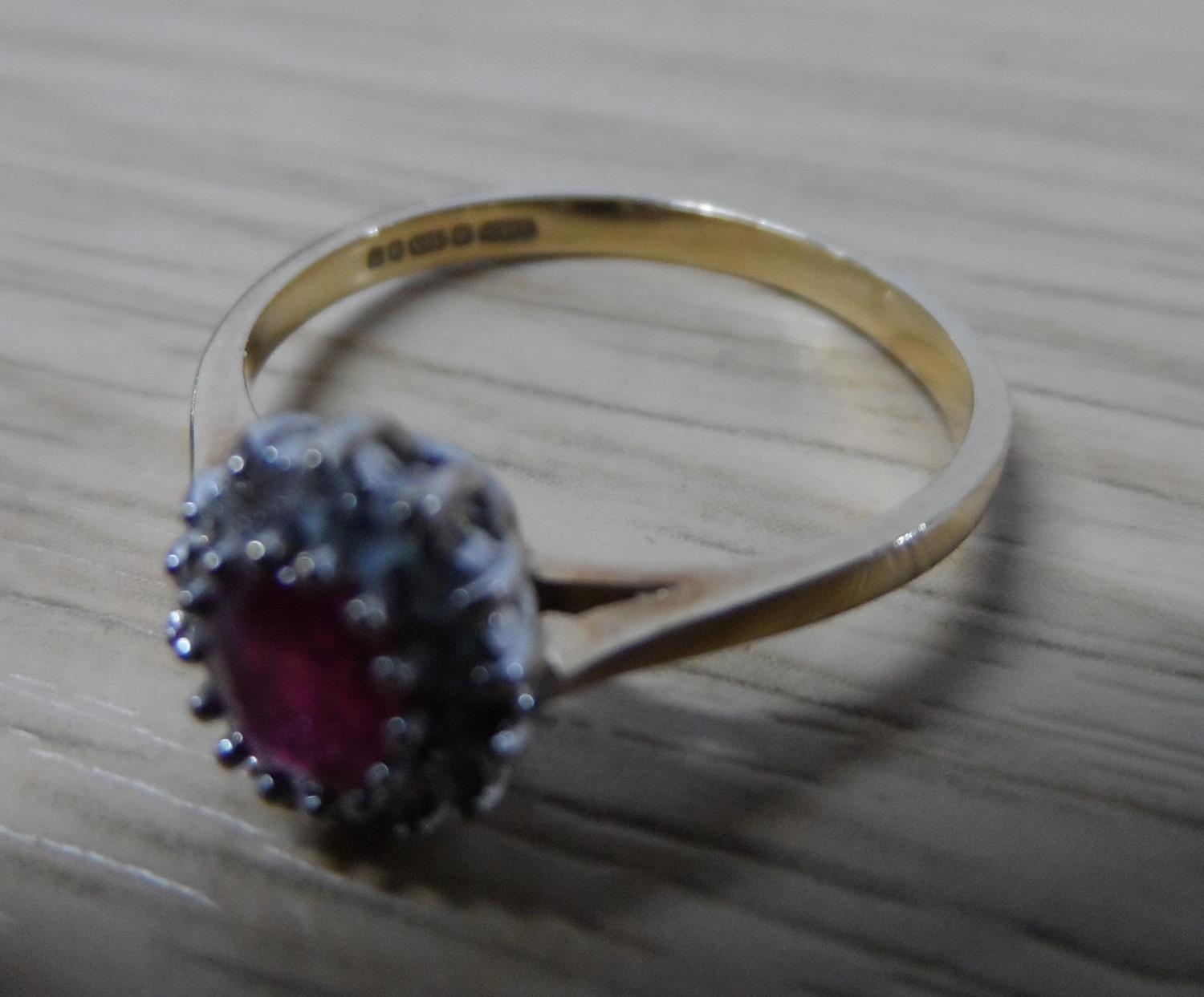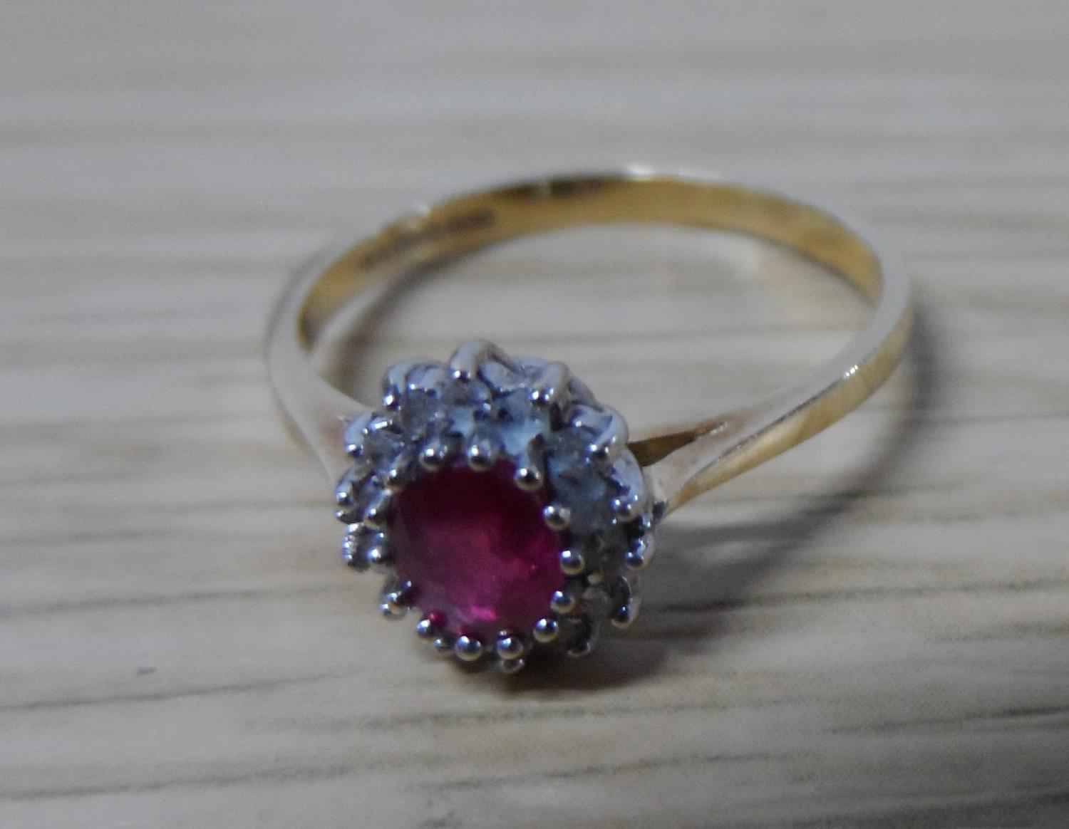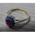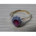 9ct yellow gold ladies ruby ring surrounded by diamonds,1.8 grams gross N1/2