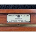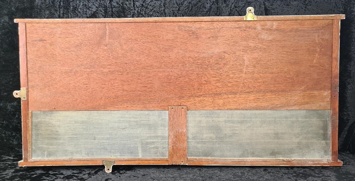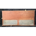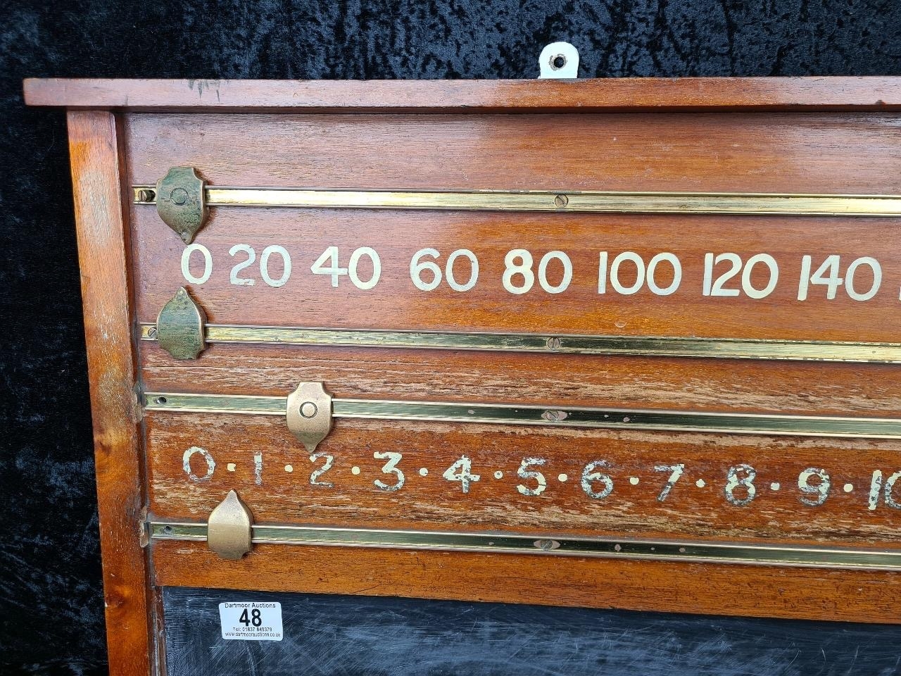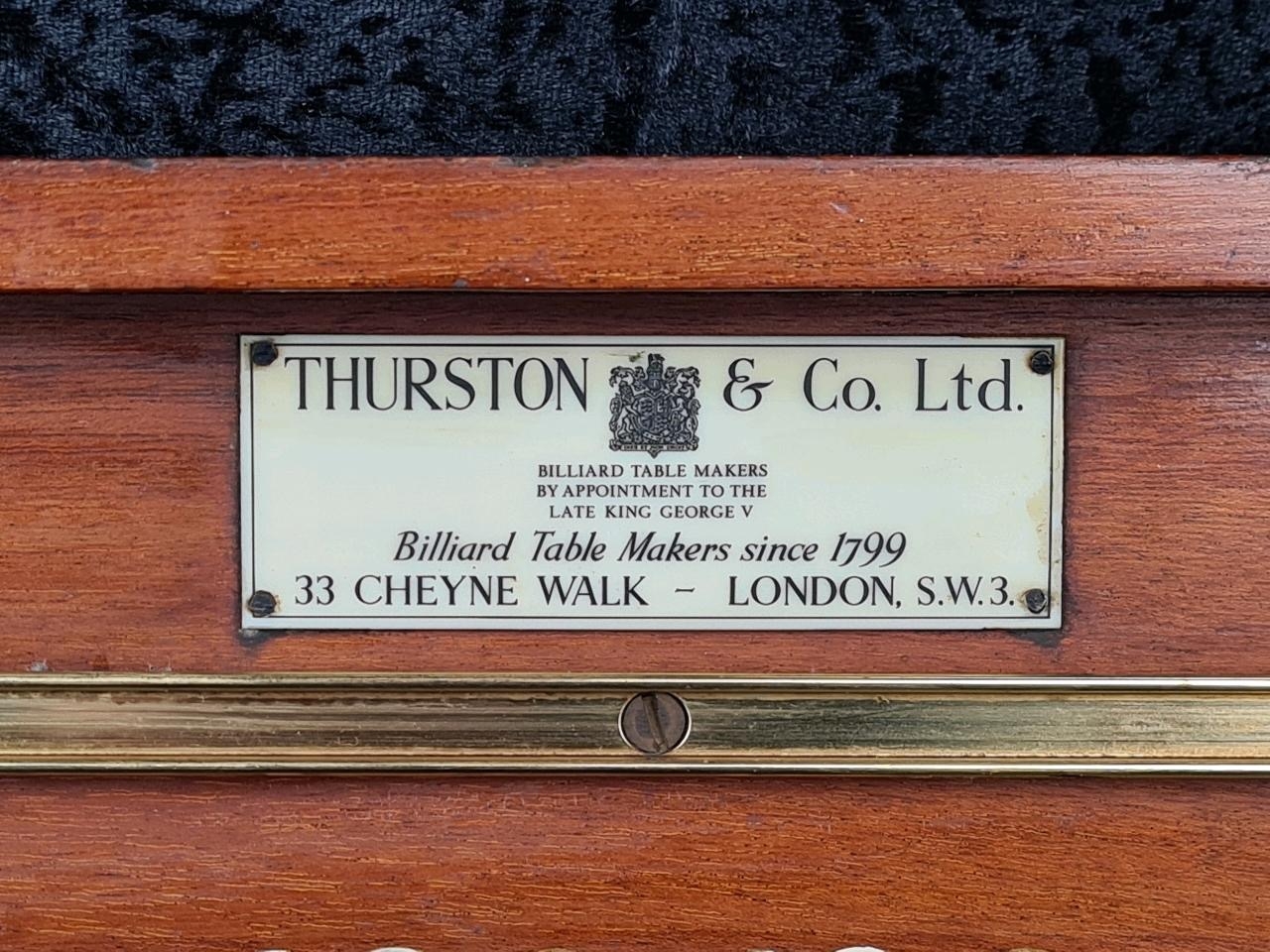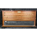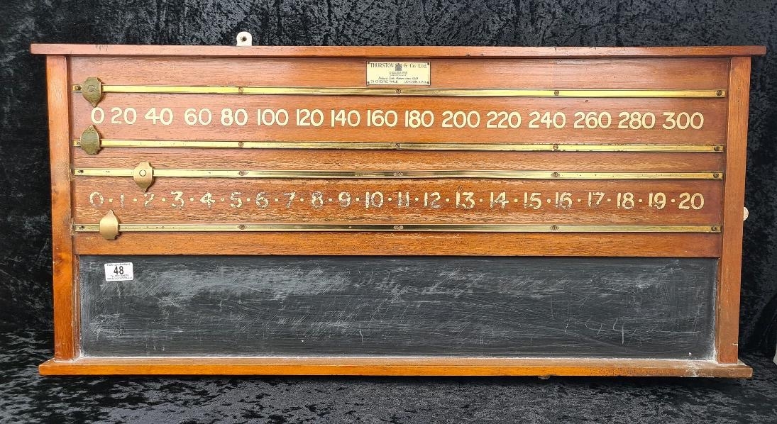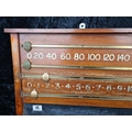 Vintage wooden scoreboard for billiards or snooker with brass sliders for tracking points. Made by Thurston & Co Ltd, Cheyne Walk, London. Approx H46cm x W98cm.