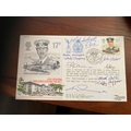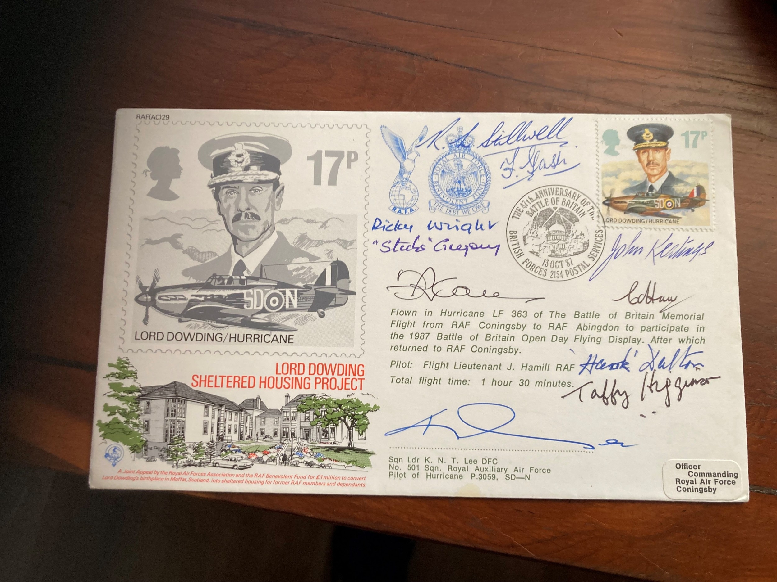 47th Anniv of Battle of Britain Signed Fighter 9 WW11 Pilots. 13 Oct 87 BFPS 2154 The 47th Anniversary of the Battle of Britain special postmark on 17p Lord Dowding / Hurricane stamp. Lord Dowding Sheltered Housing Project. Cover flown in Hurricane LF 363 of the Battle of Britain Memorial flight from RAF Coningsby to RAF Abingdon to participate in the 1987 Battle of Britain open day flying display. After which returned to RAF Coningsby. Personally signed Sqn Ldr K. N. T. Lee DFC of No 501 Sqn, Royal Auxiliary Air Force Pilot of Hurricane P3059 SD N. Fighter pilot Ace in WW11. and also Signed Gp. Capt. F. R. Carey CBE, DFC, AFC, DFM. 43 Sqn Battle of Britain fighter pilot and WW11 Ace 25 Victories, Sqn. Ldr. R. W. Dalton Battle of Britain Air Gunner with 604 Sqn, FIt. Lt. F. Gash 264 Sqn flying Defiants in Battle of Britain, Wg. Cdr. W. J. Gregory Sticks Gregory Battle of Britain Observer Blenheim Crew 29 Sqn, Wg. Cdr. F. W. Higginson Battle of Britain and WWII Ace. 12 destroyed, Air Commodore G. W. Wright Battle of Britain 605 Sqn WWII Ace. 12 destroyed Sqn. Ldr. Haw Battle of Britain 504 Sqn WWII Ace Died in 1993, Sqn. Ldr. R. L. Stillwell Battle of Britain Fighter Pilot 65 Sqn. Detailed insert enclosed. Backstamped Royal Air Force Coningsby 12 Sep 1987 and 11 Sep British Forces 2232 Postal Service 50th Anniversary of the Battle of Britain Postmark on 20p Distinguished Flying Cross- Distinguished Flying Medal stamp. Single Vendor autograph collection. Good condition. All autographs come with a Certificate of Authenticity. We combine postage on multiple winning lots and can ship worldwide. UK postage from £5.99, EU from £7.99, Rest of World from £9.99