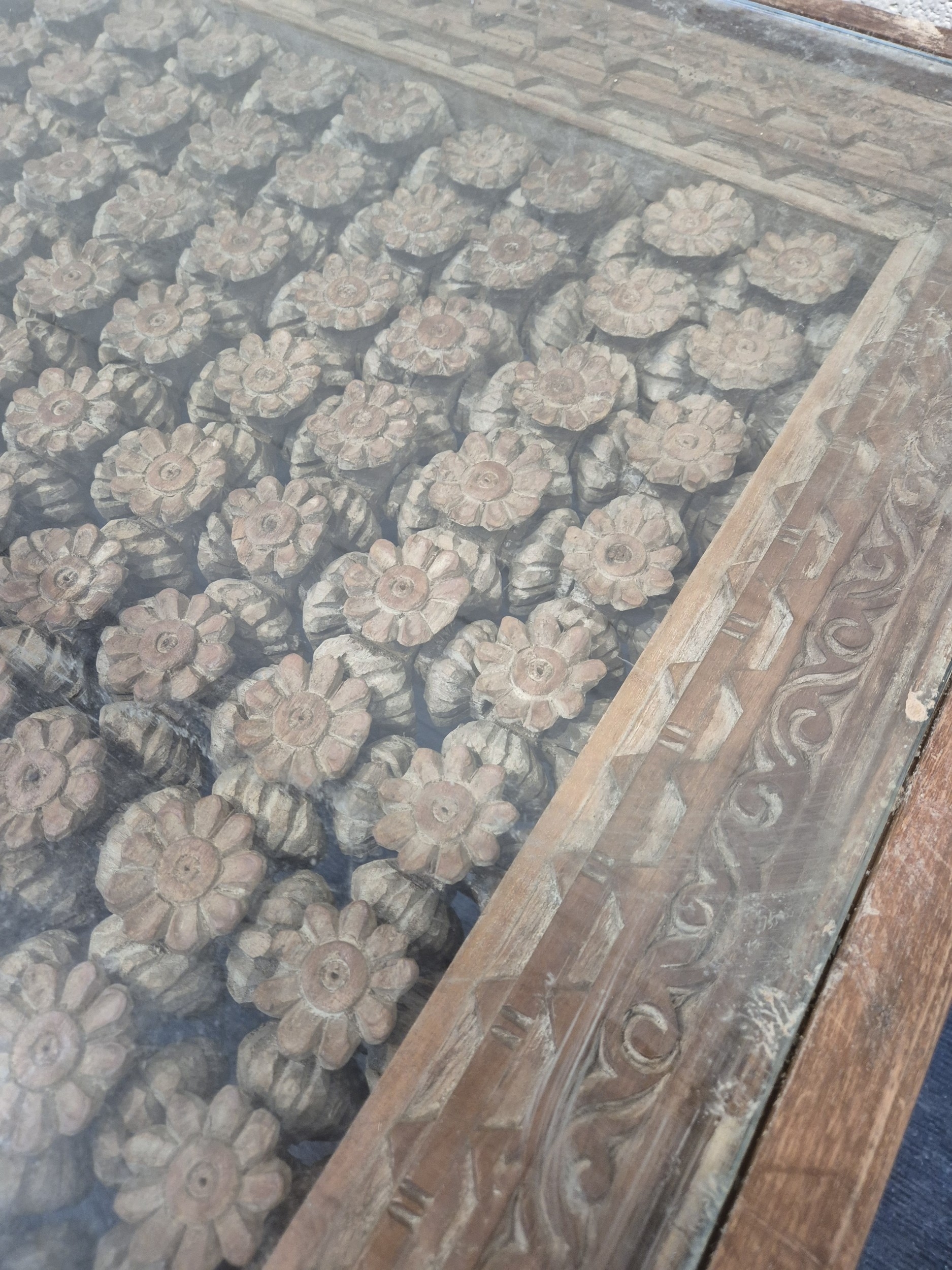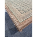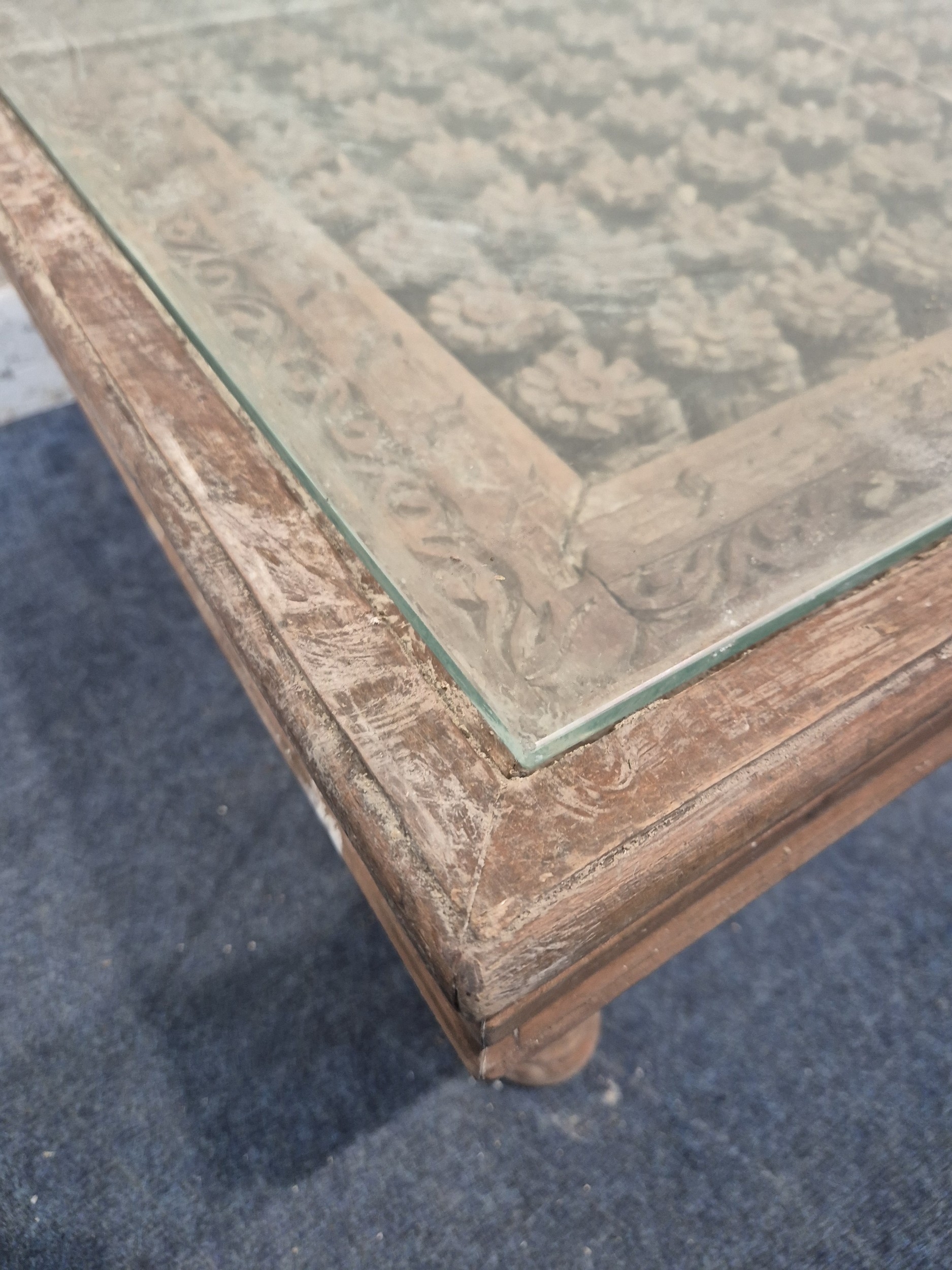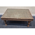A CARVED INDIAN RECTANGULAR COFFEE TABLE, with a glass insert, raised on block and turned legs, width 122cm x depth 94cm x height 49cm, condition report: marks, scuffs, stains, discolouration, other wear and usage