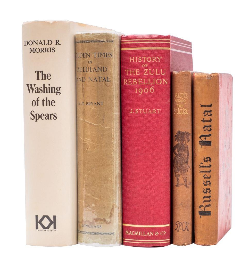 STUART, J. - A History of the Zulu Rebellion 1906 and of Dinuzulu's Arrest, Trial and Expatriation : plates, maps inc. one in pocket at the rear. Org. cloth, 8vo. Macmillan, 1913. With - Bryant, A. T. Olden Times in Zululand and Natal : 2 maps, plates .Cloth in d/w, Longmans, Green. 1929. With - Morris, Donald R. The Washing of the Spears. A History of the rise and fall of the Zulu Nation under Shaka and its fall in the Zulu War of 1879. With two others relating to Zulus. (5)