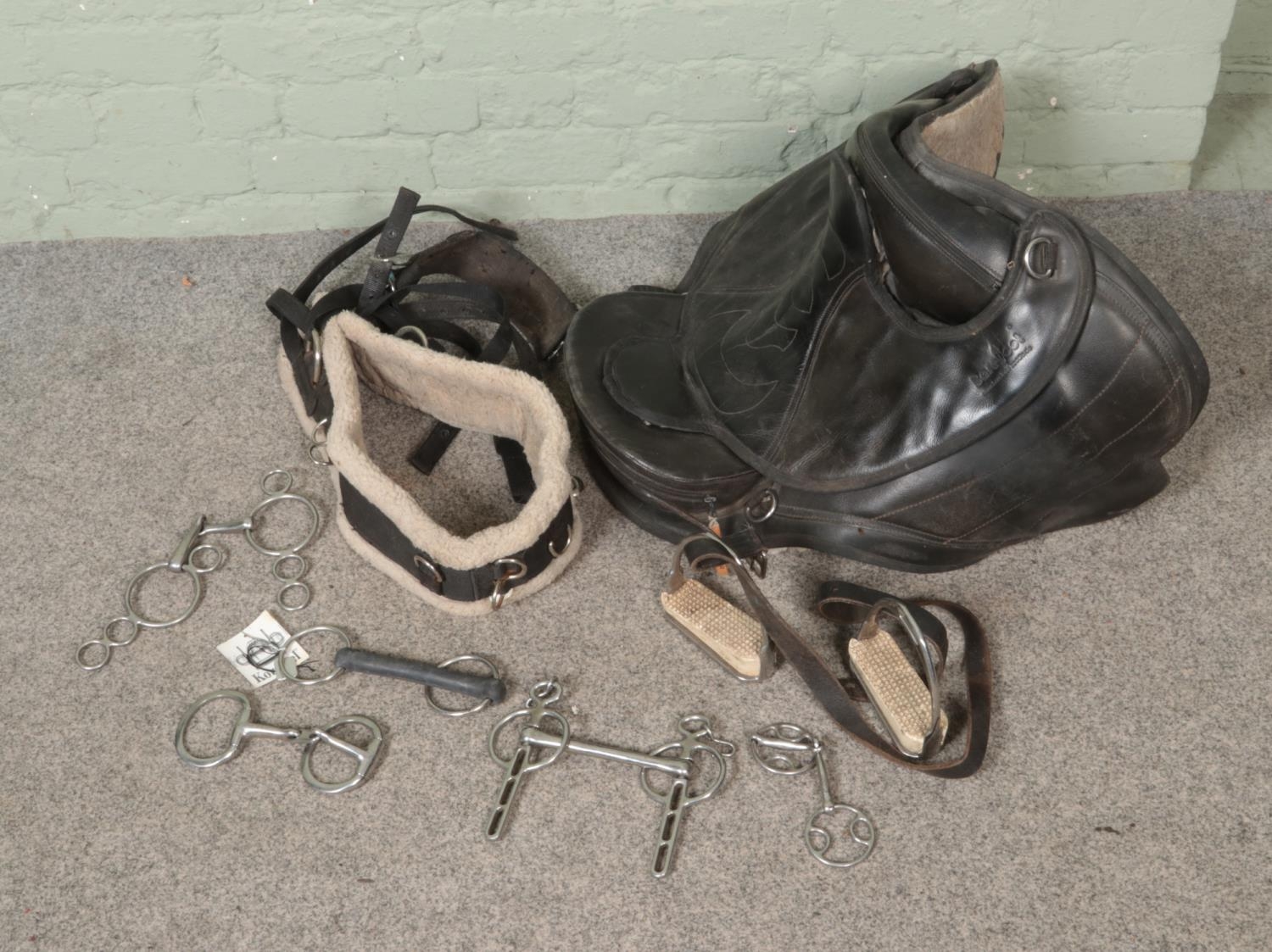 A box of assorted horse tack to include Barefoot saddle and several horse bits and pair of stirrups.