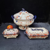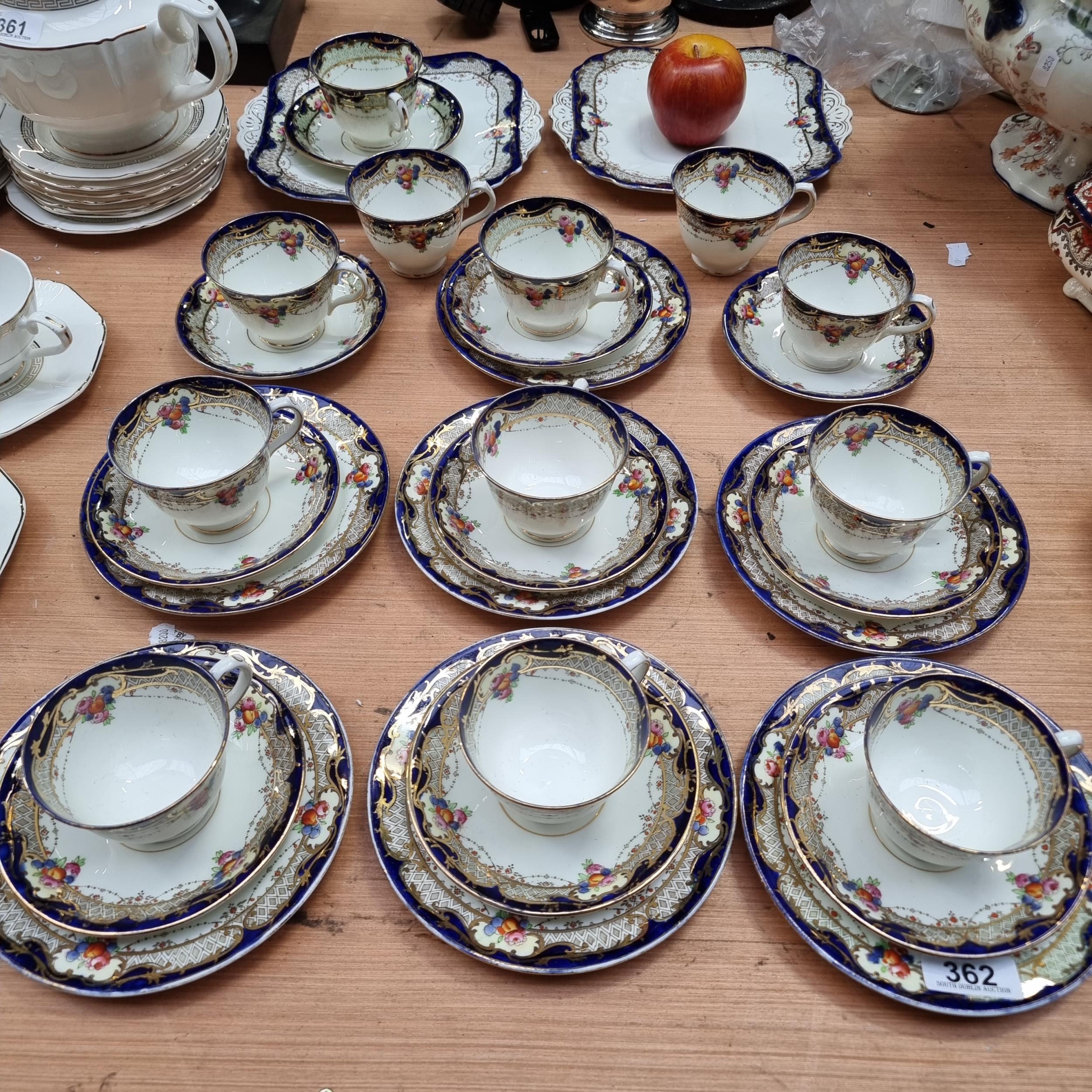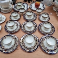 31 pieces of Fenton bone china in the 'Diar' pattern. This very pretty pattern shows garlands of peaches, plums and roses trailing around the cobalt rim and accented in gold. In good condition. Made in Staffordshire, England. From the fabulous antique house in Greystones.