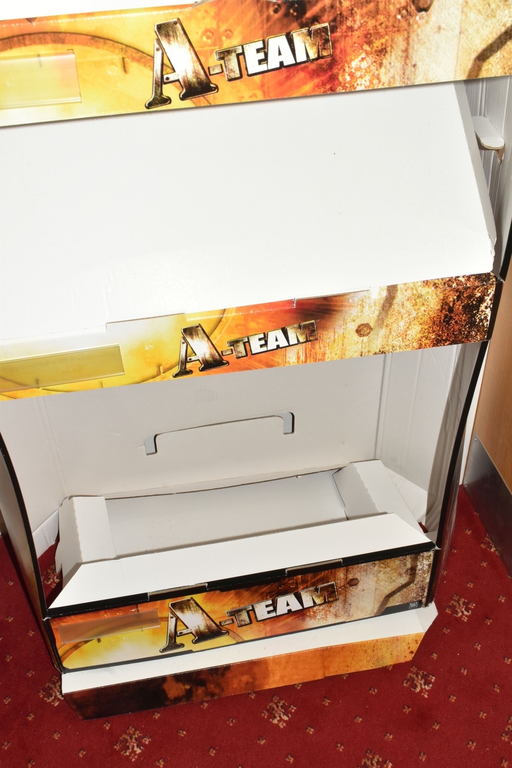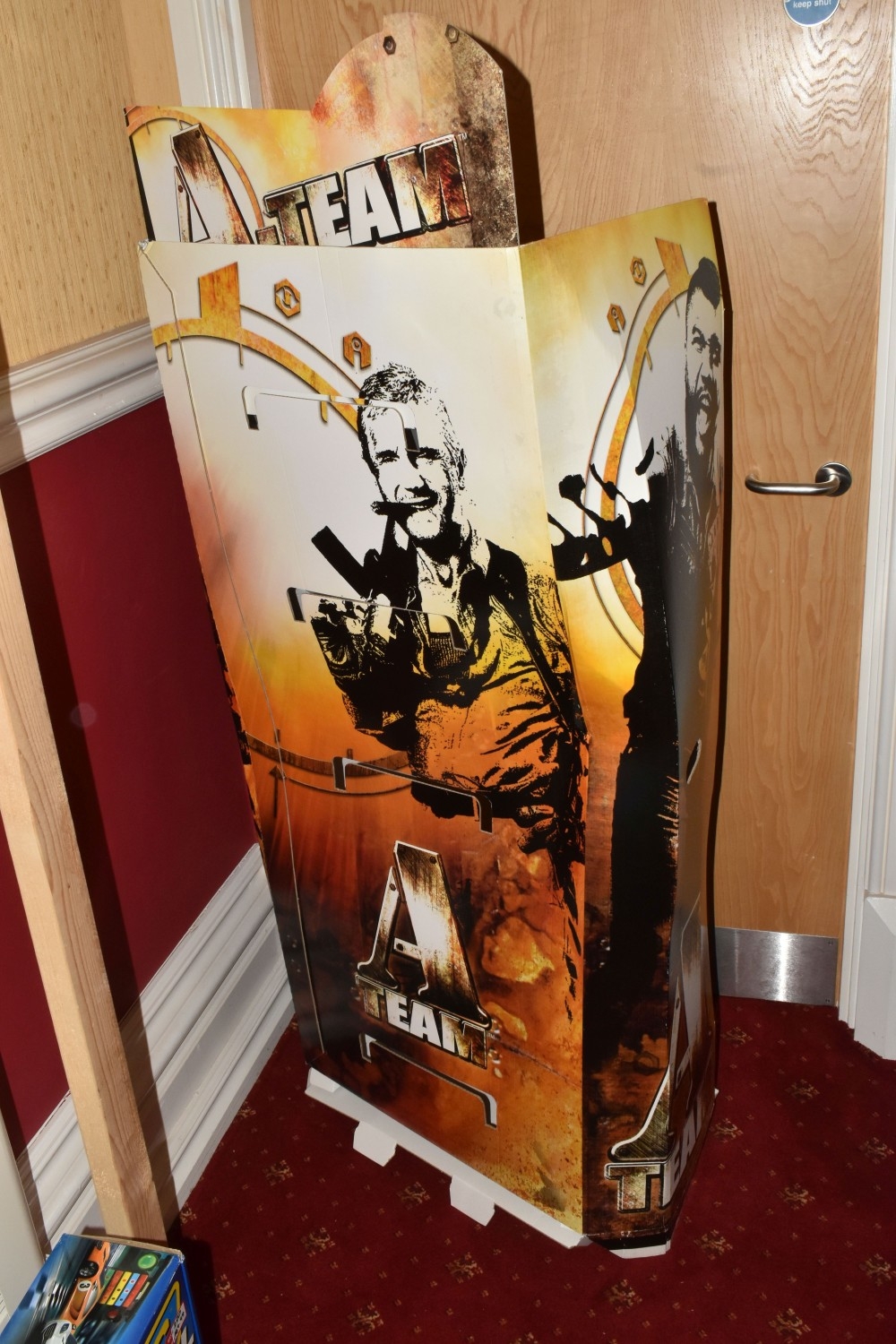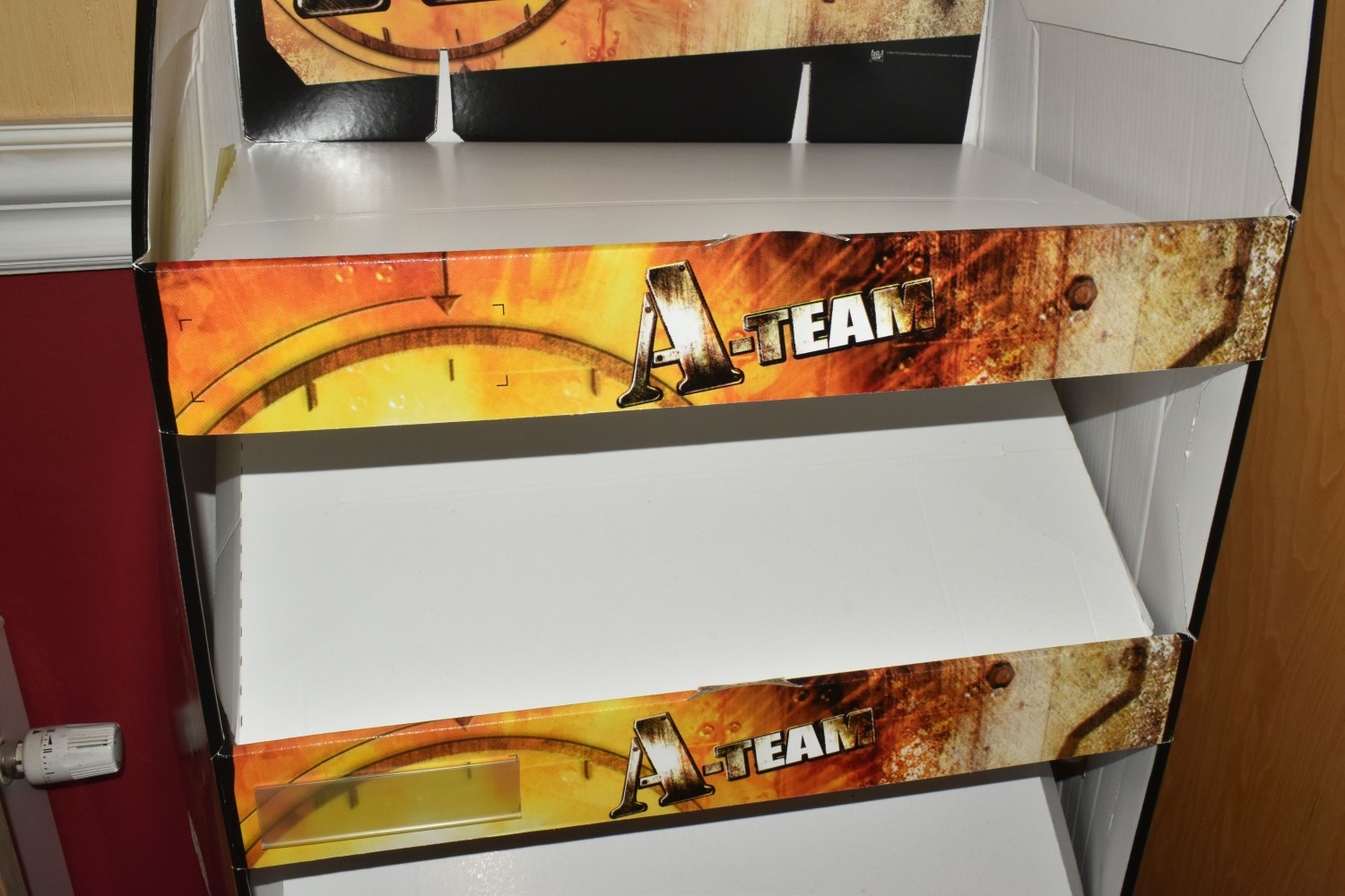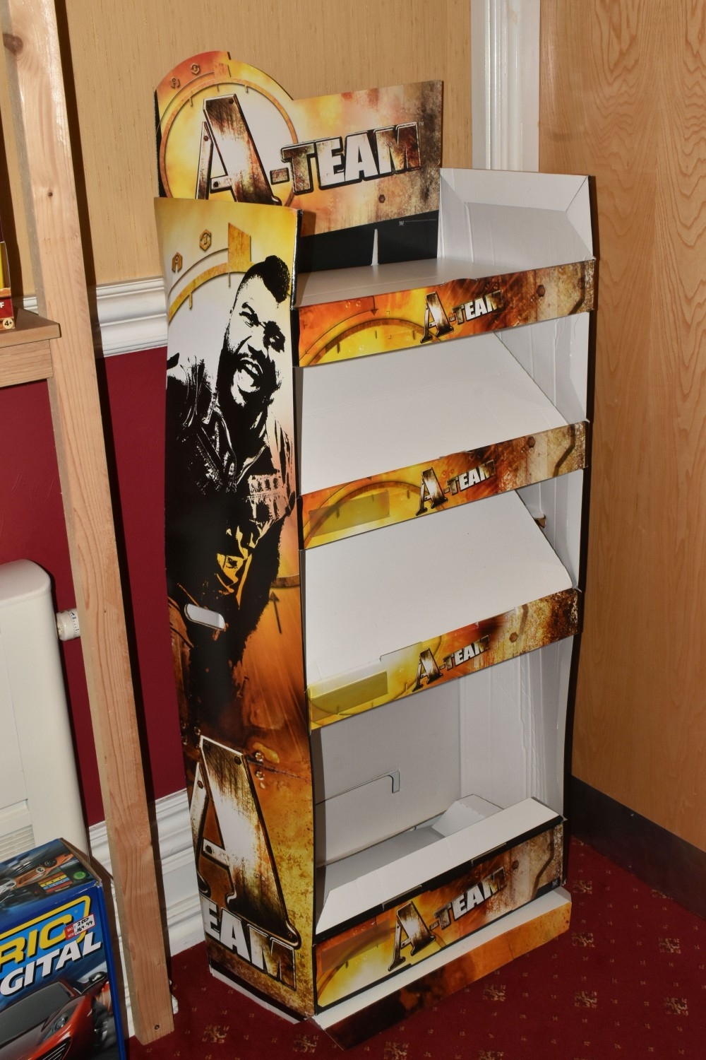 A 2010 20TH CENTURY FOX A-TEAM SHOP DISPLAY STAND, either for toy or film stock, with four shelves, one not attached, approximately 165cm, 41cm depth, 59cm width, although is distorted, with price panels to each shelf