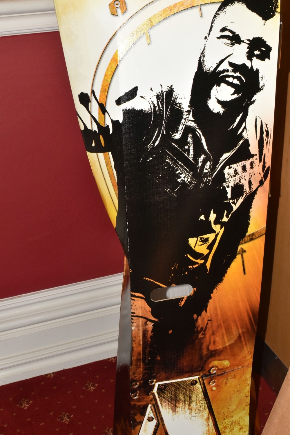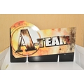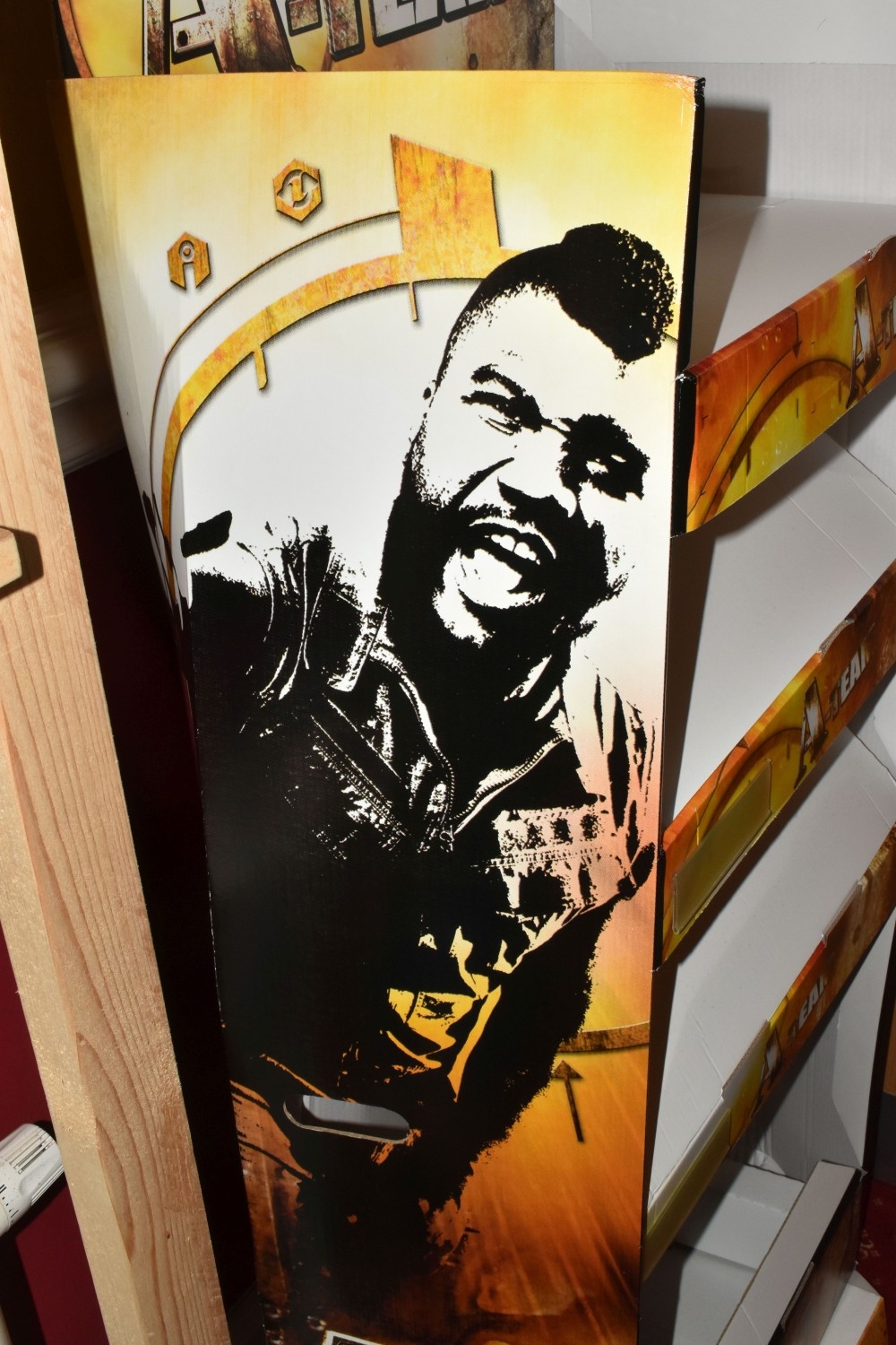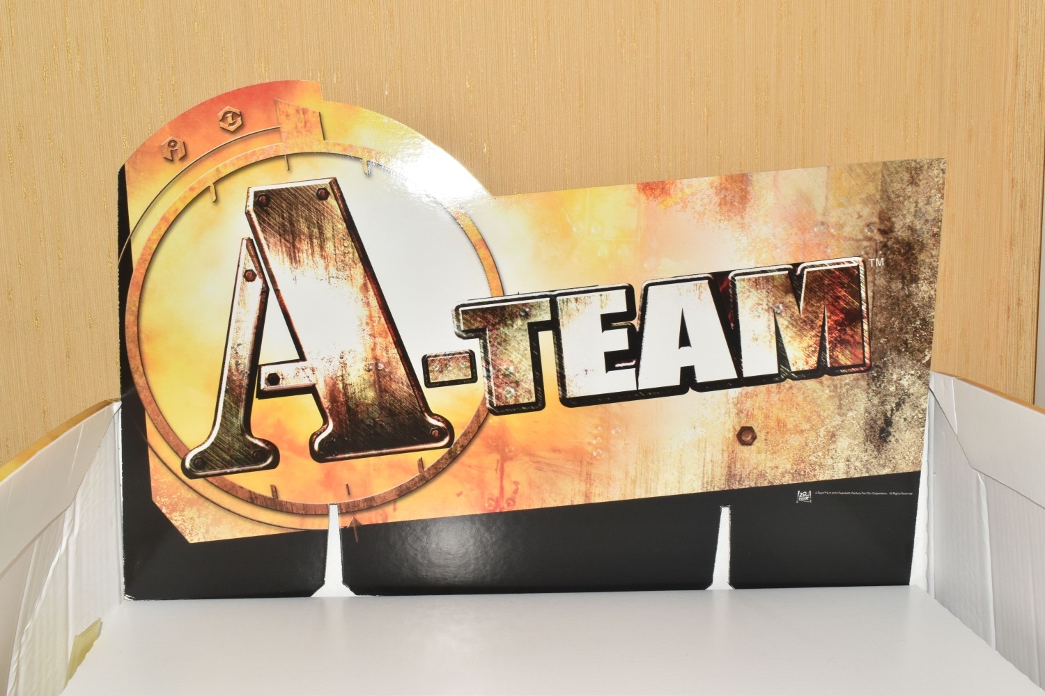 A 2010 20TH CENTURY FOX A-TEAM SHOP DISPLAY STAND, either for toy or film stock, with four shelves, one not attached, approximately 165cm, 41cm depth, 59cm width, although is distorted, with price panels to each shelf