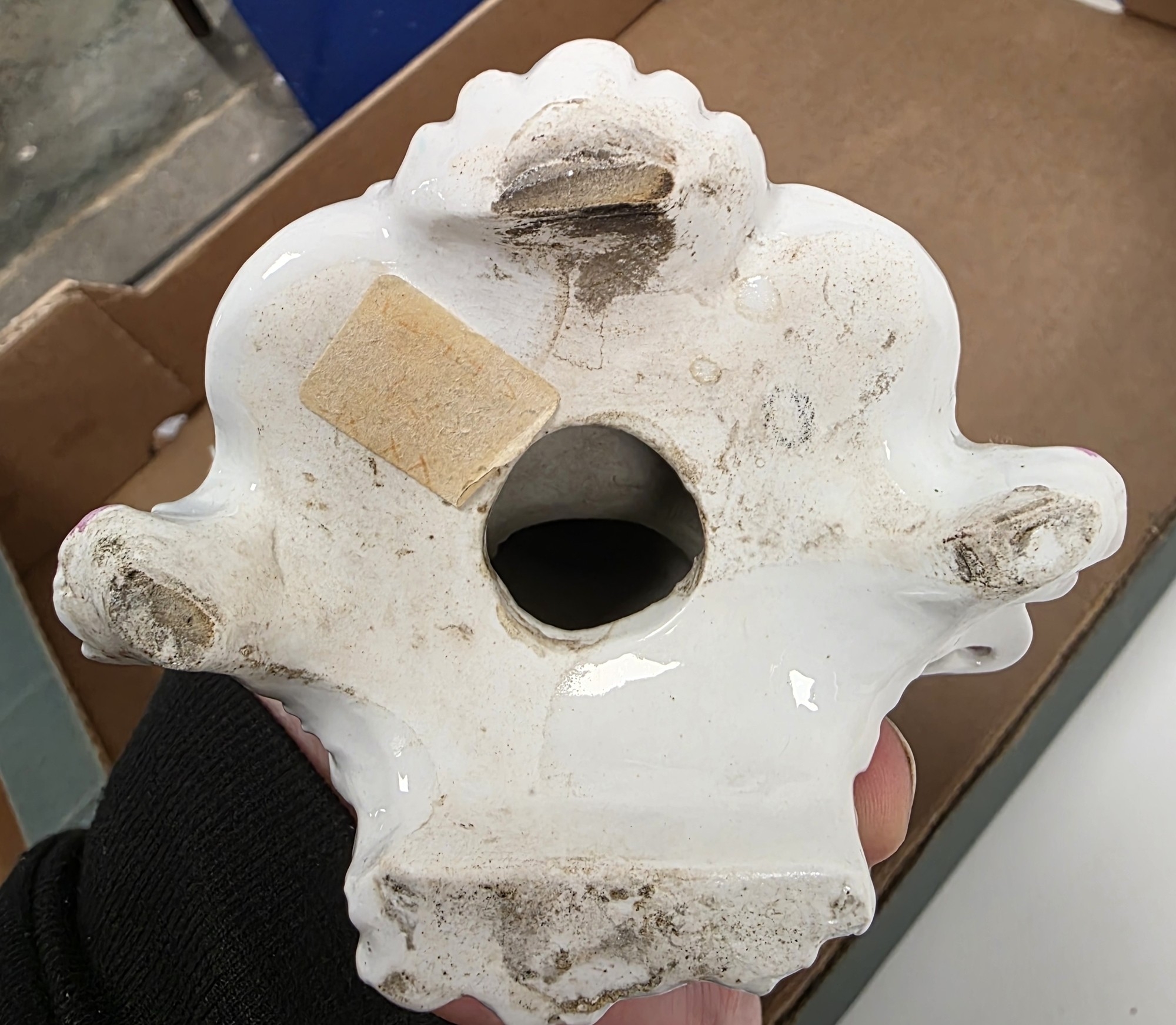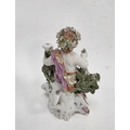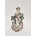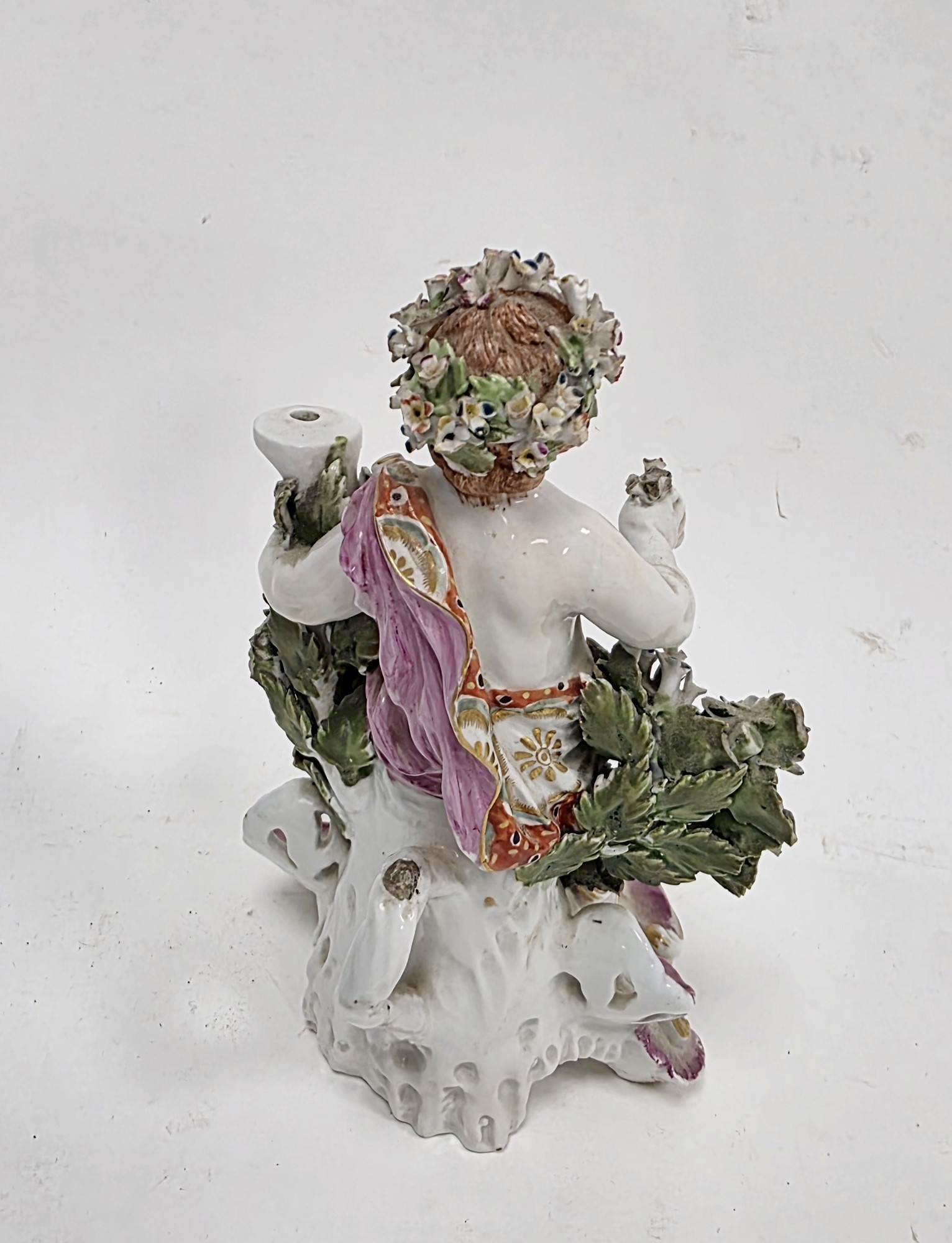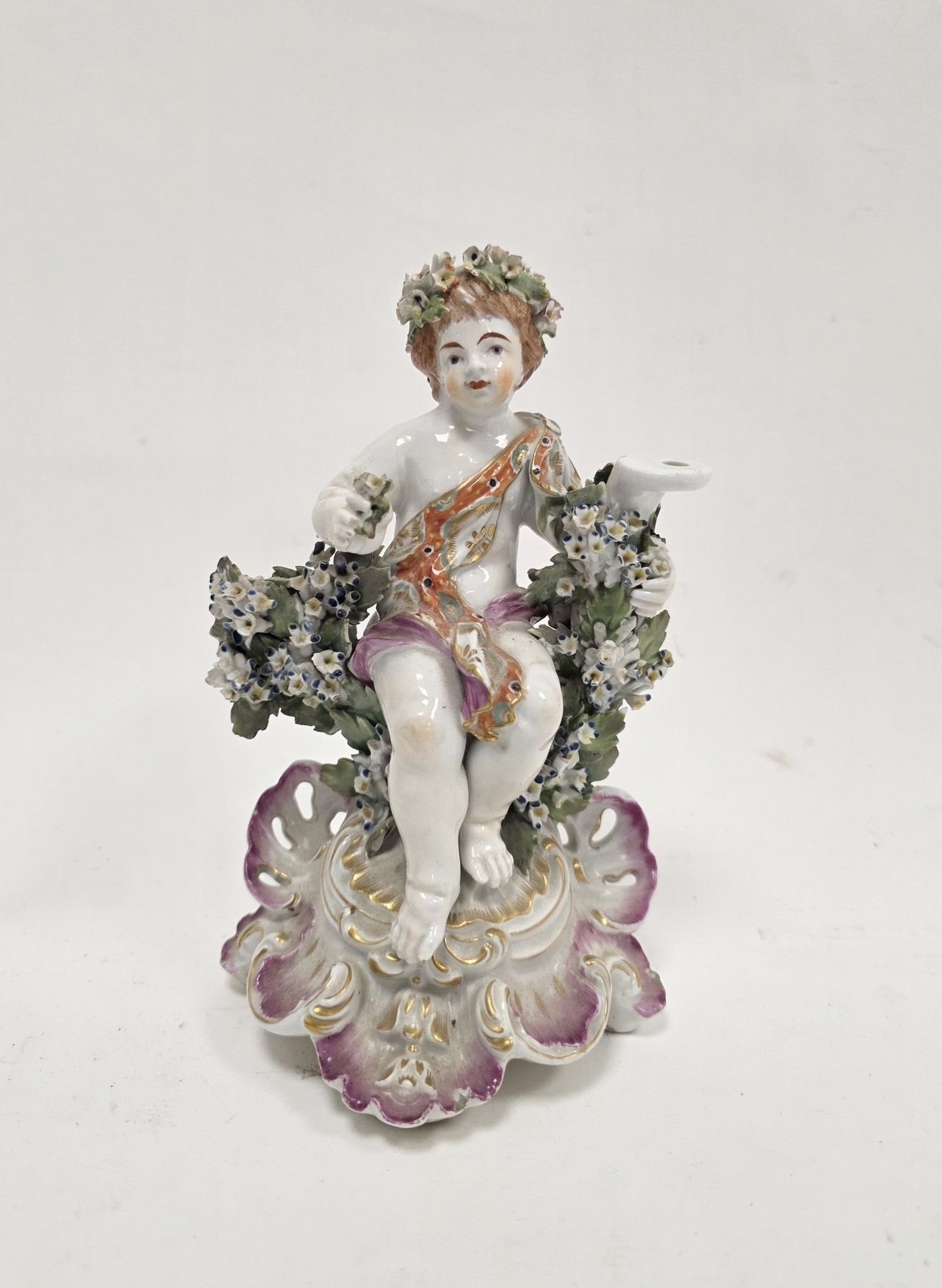 Derby porcelain putto candlestick figure, circa 1775, with flowering bocage on pierced puce gilt rocaille base, 17.5cm high