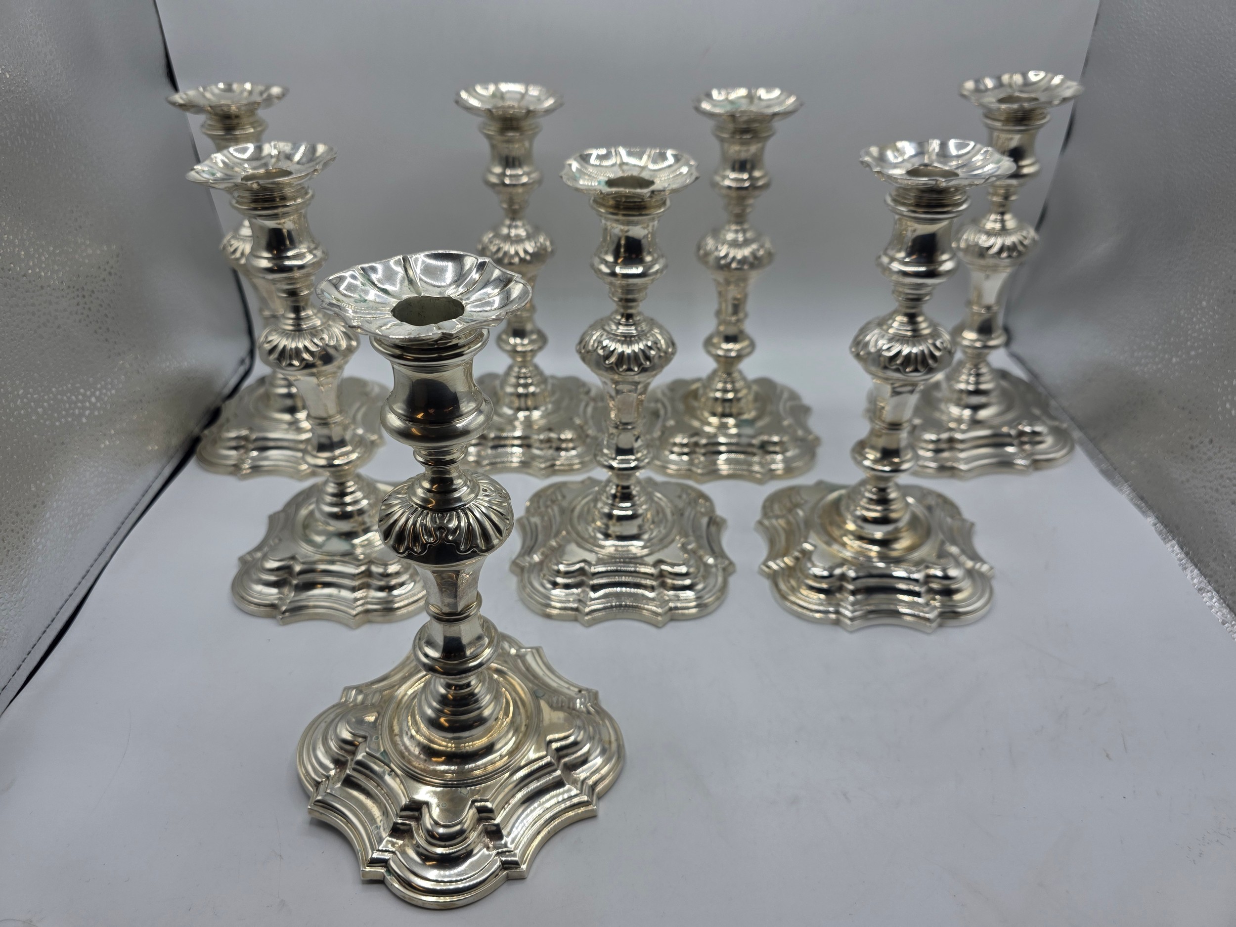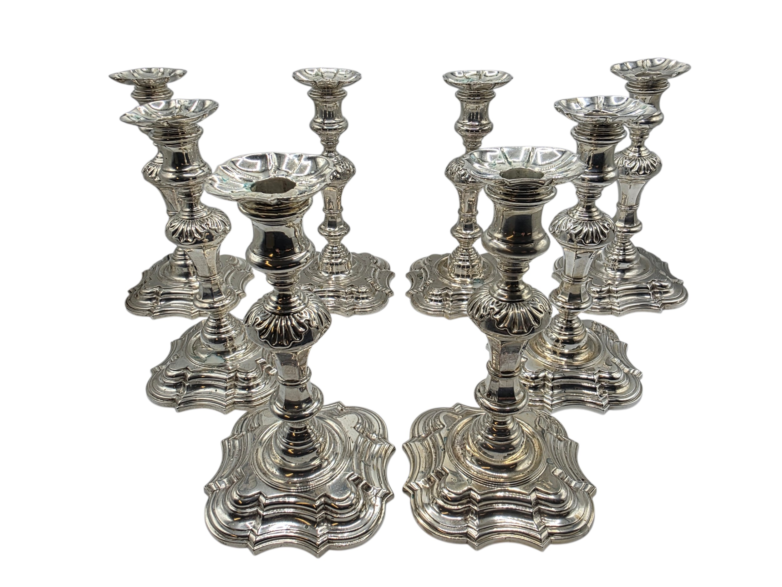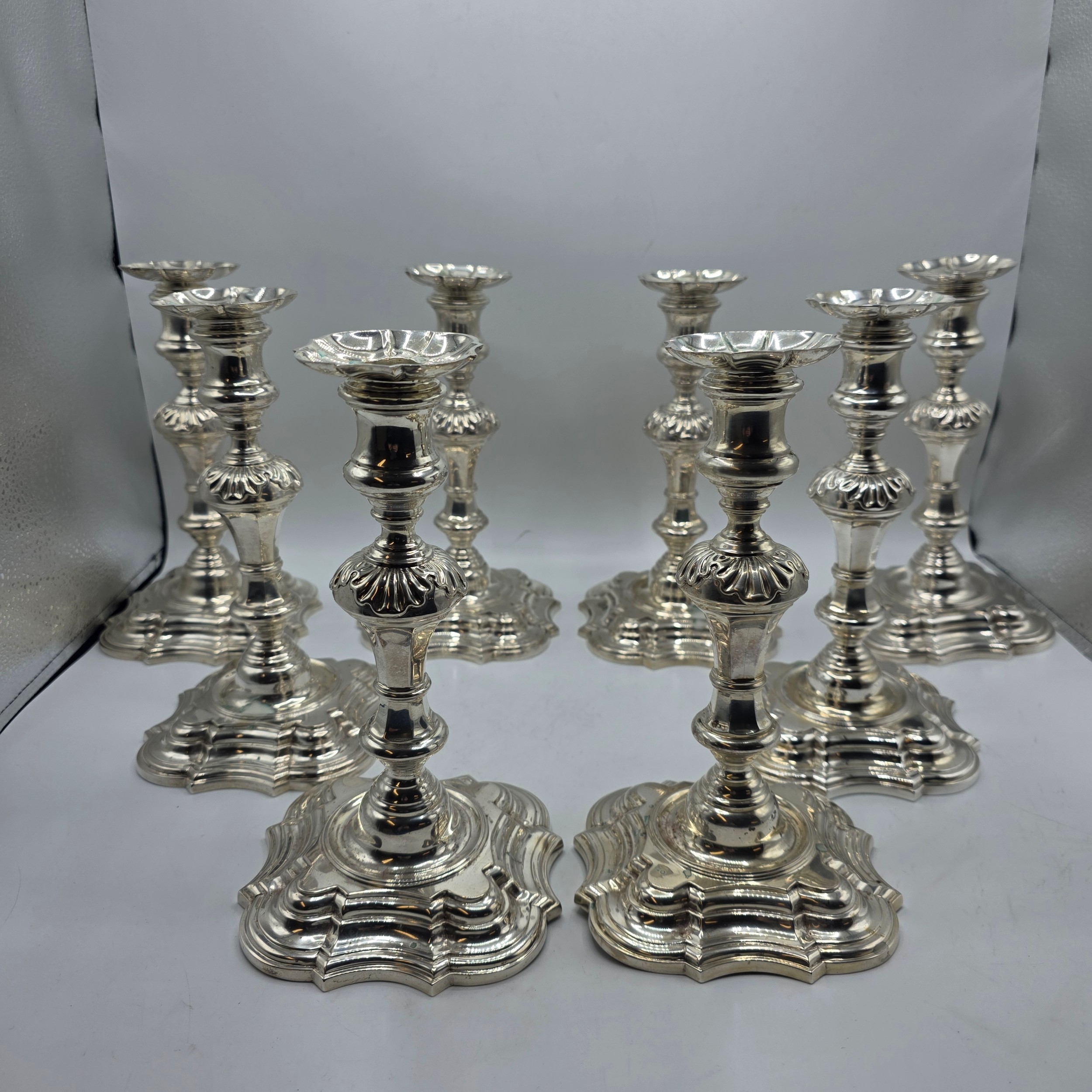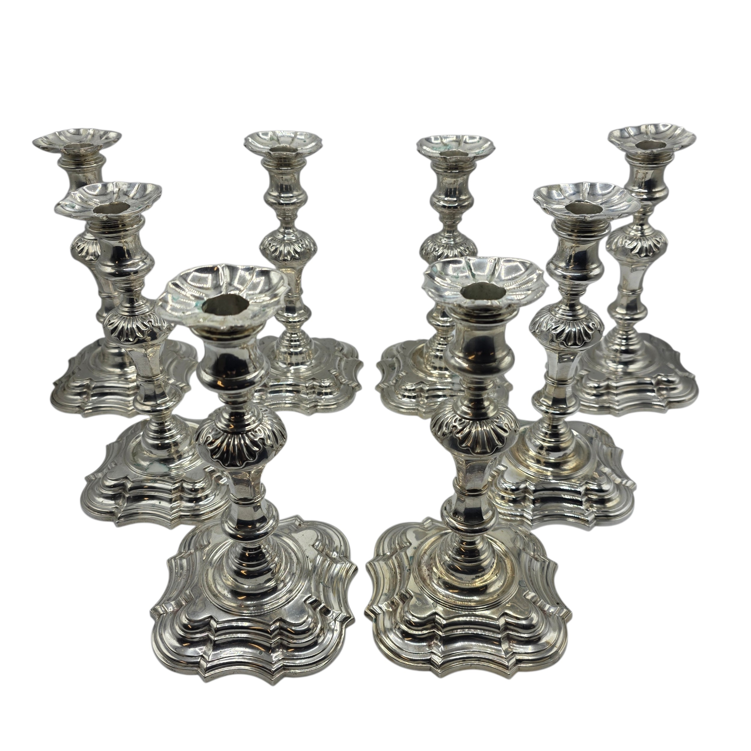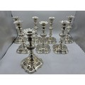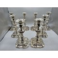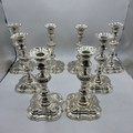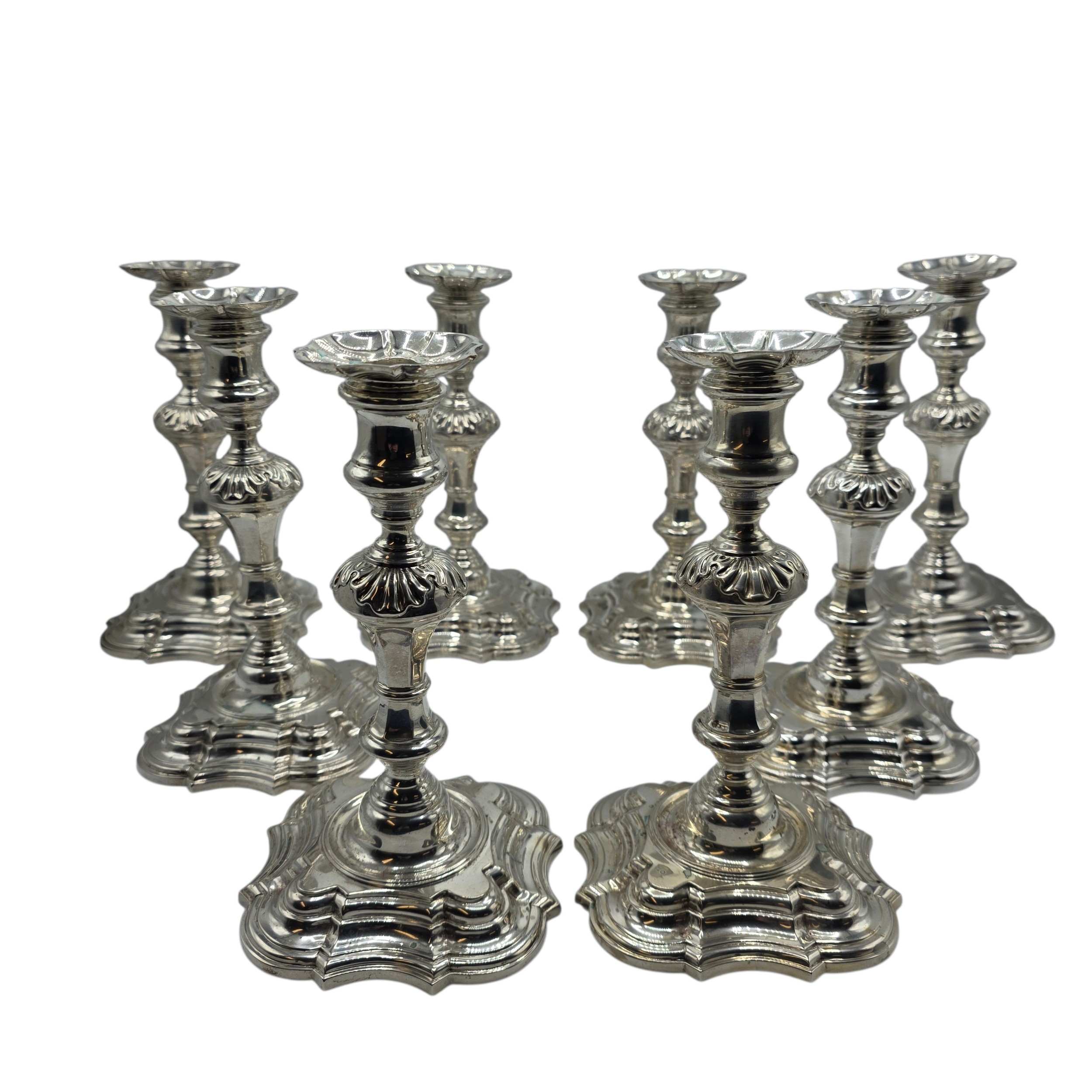 A set of eight solid sterling silver table candlesticks, stepped square basis, S J Phillips London Ltd 1998. 22 cm H. Total weight 6665 g