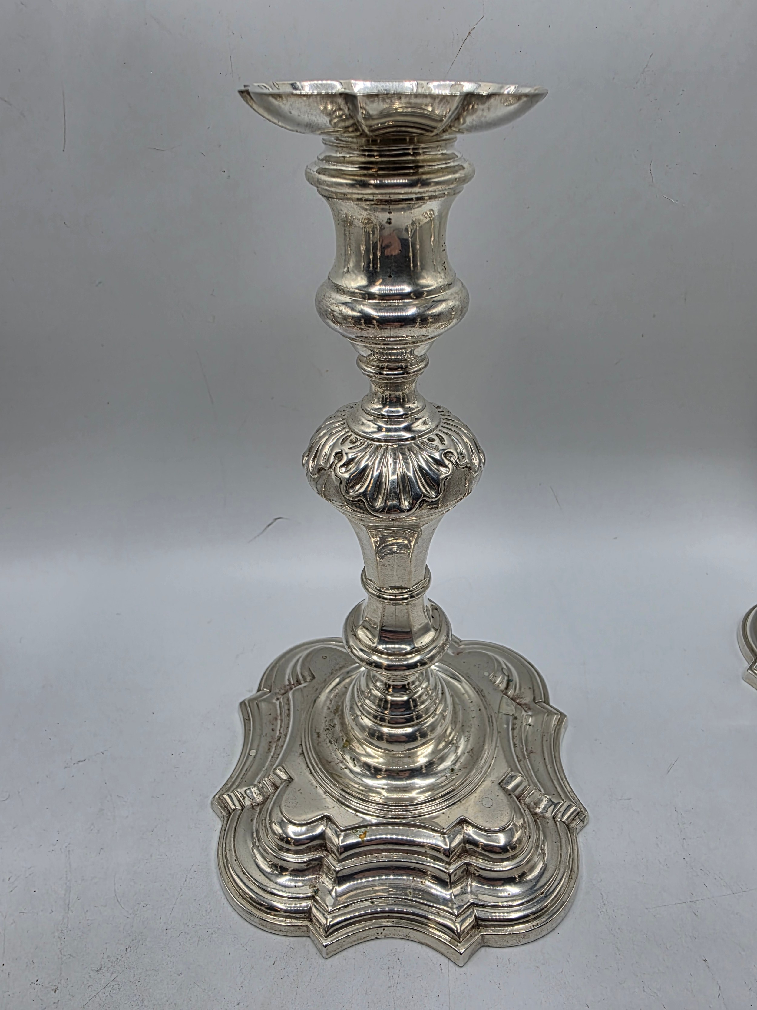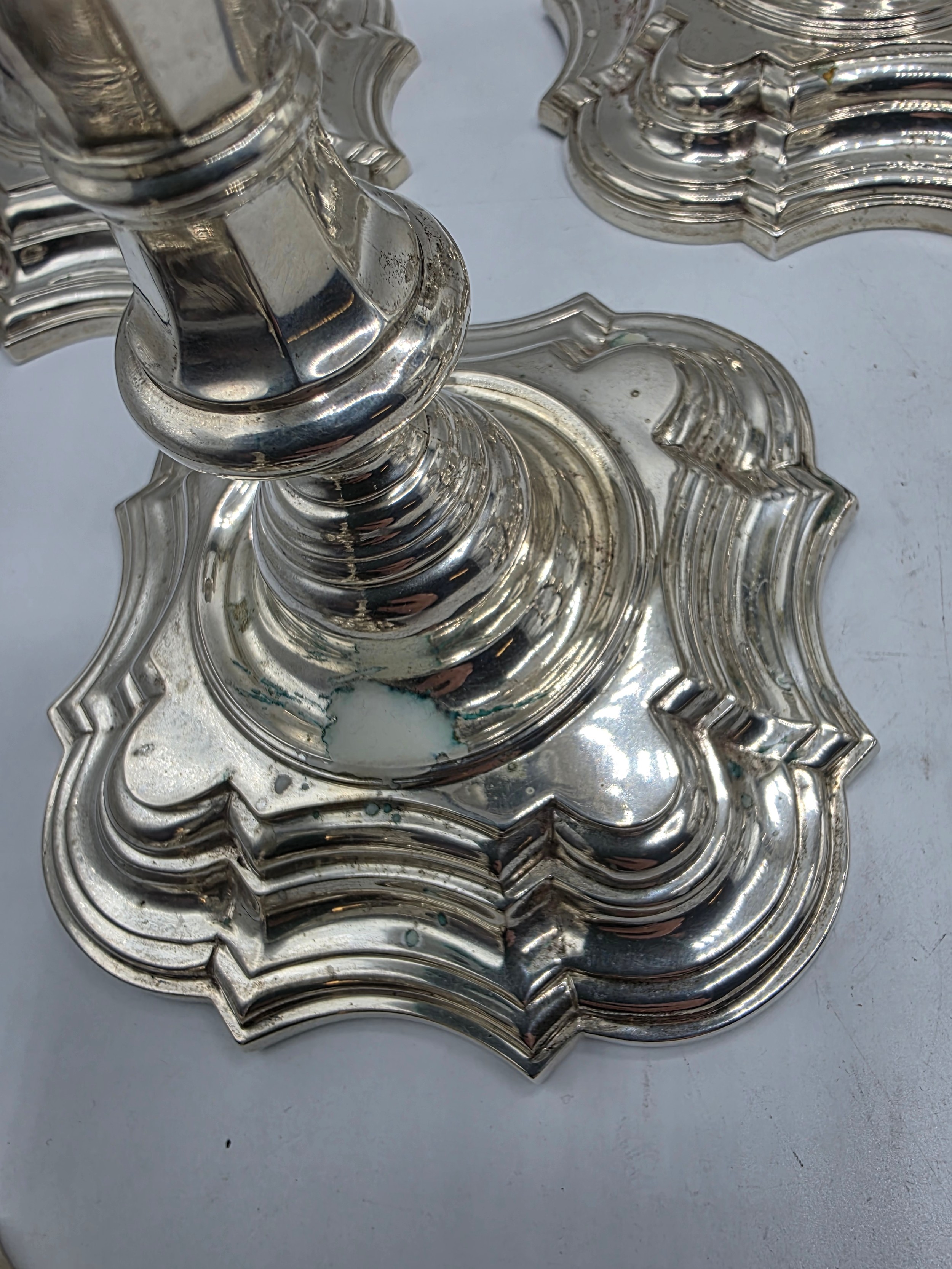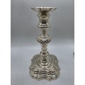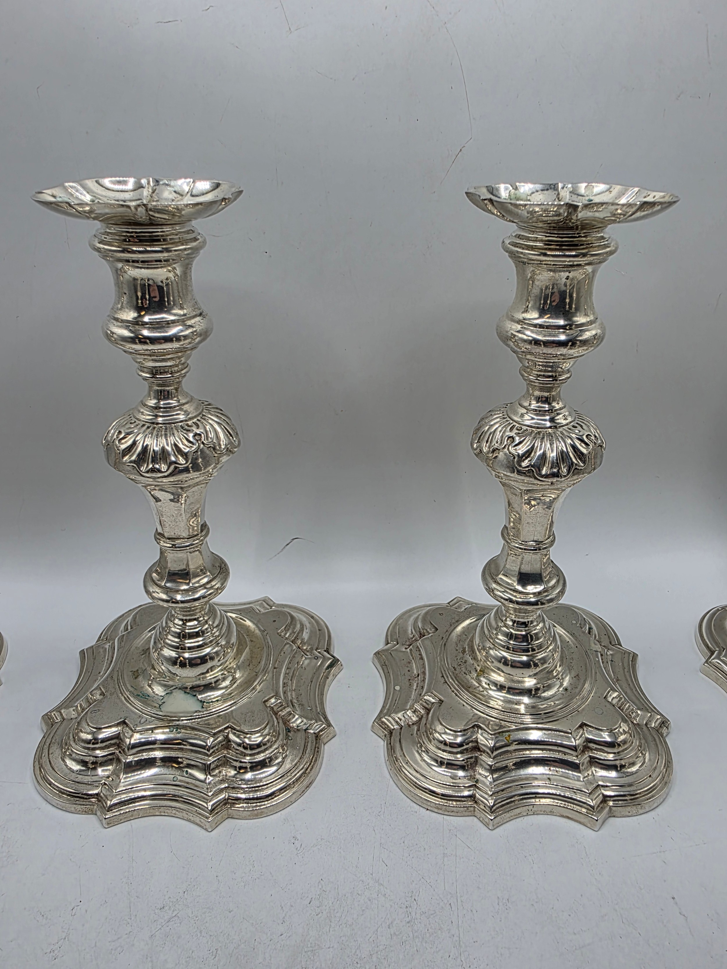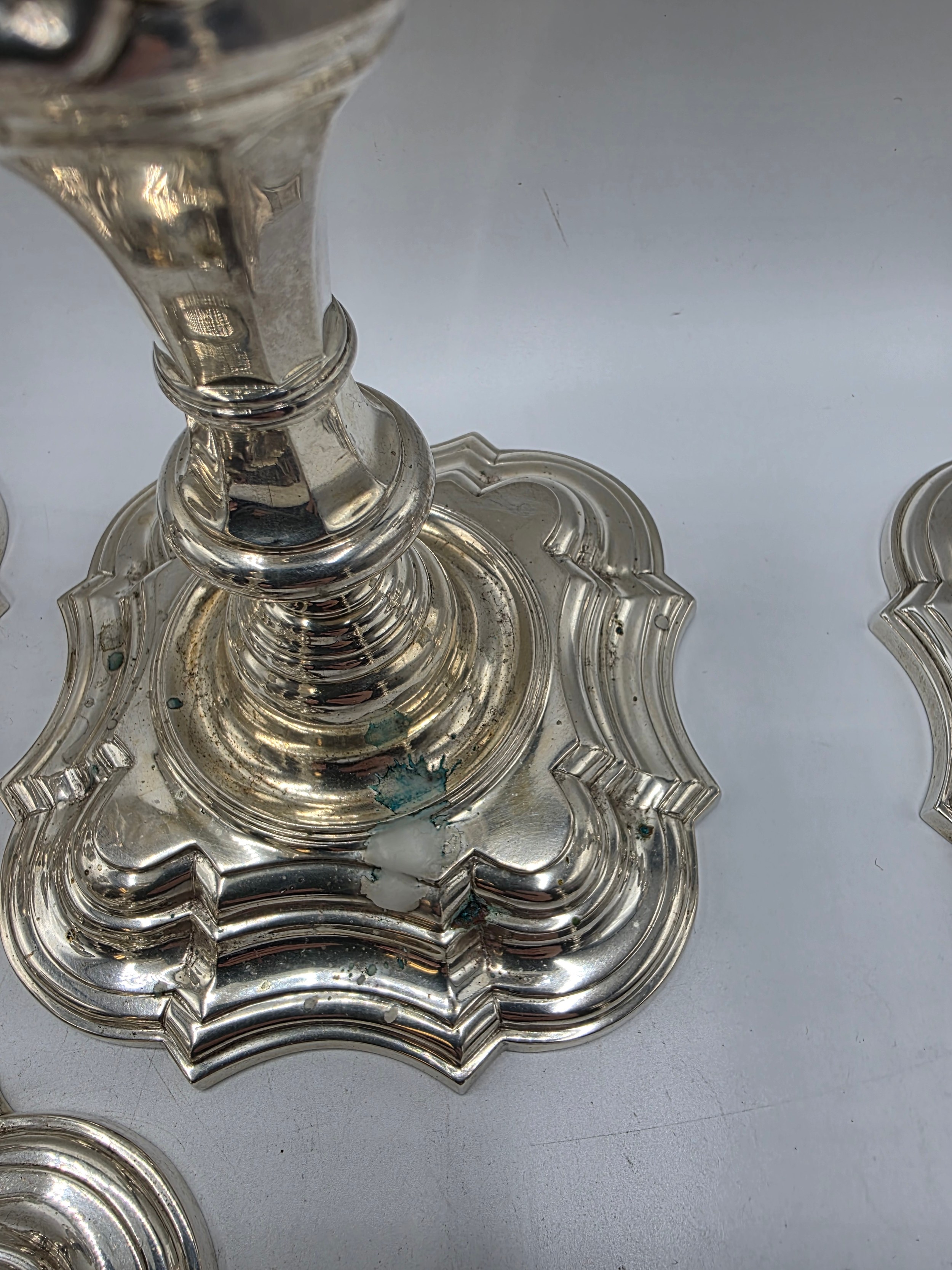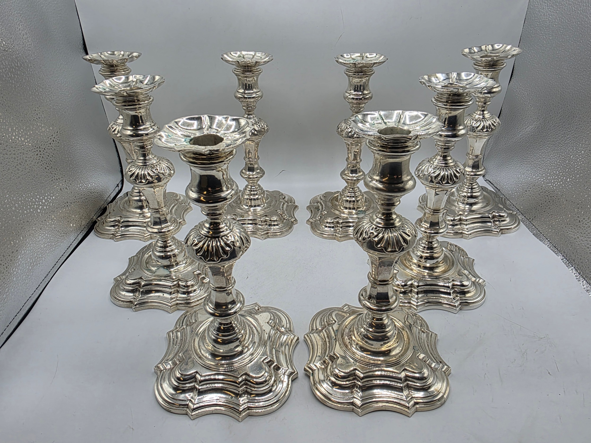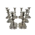 A set of eight solid sterling silver table candlesticks, stepped square basis, S J Phillips London Ltd 1998. 22 cm H. Total weight 6665 g