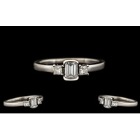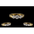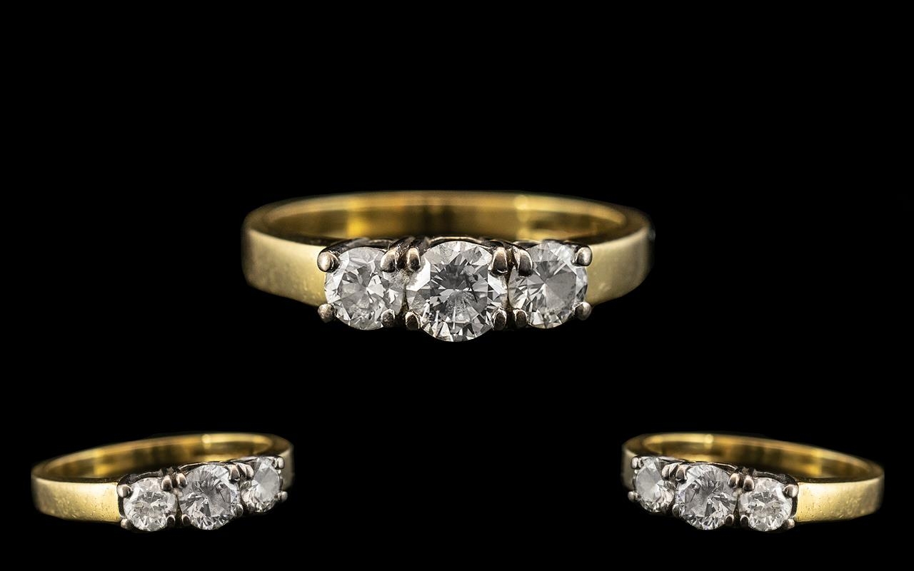 18ct Yellow Gold - Attractive 3 Stone Diamond Set Dress Ring. Full Hallmark for 18ct - 750. The Round Brilliant Cut Diamonds of Good Colour / Clarity. Est Diamond Weight 1.00 cts In Total, Centre Diamond Est 0.50 pts. Ring Size Q. Weight 5.1 grams. All Aspects of Condition Are Excellent.