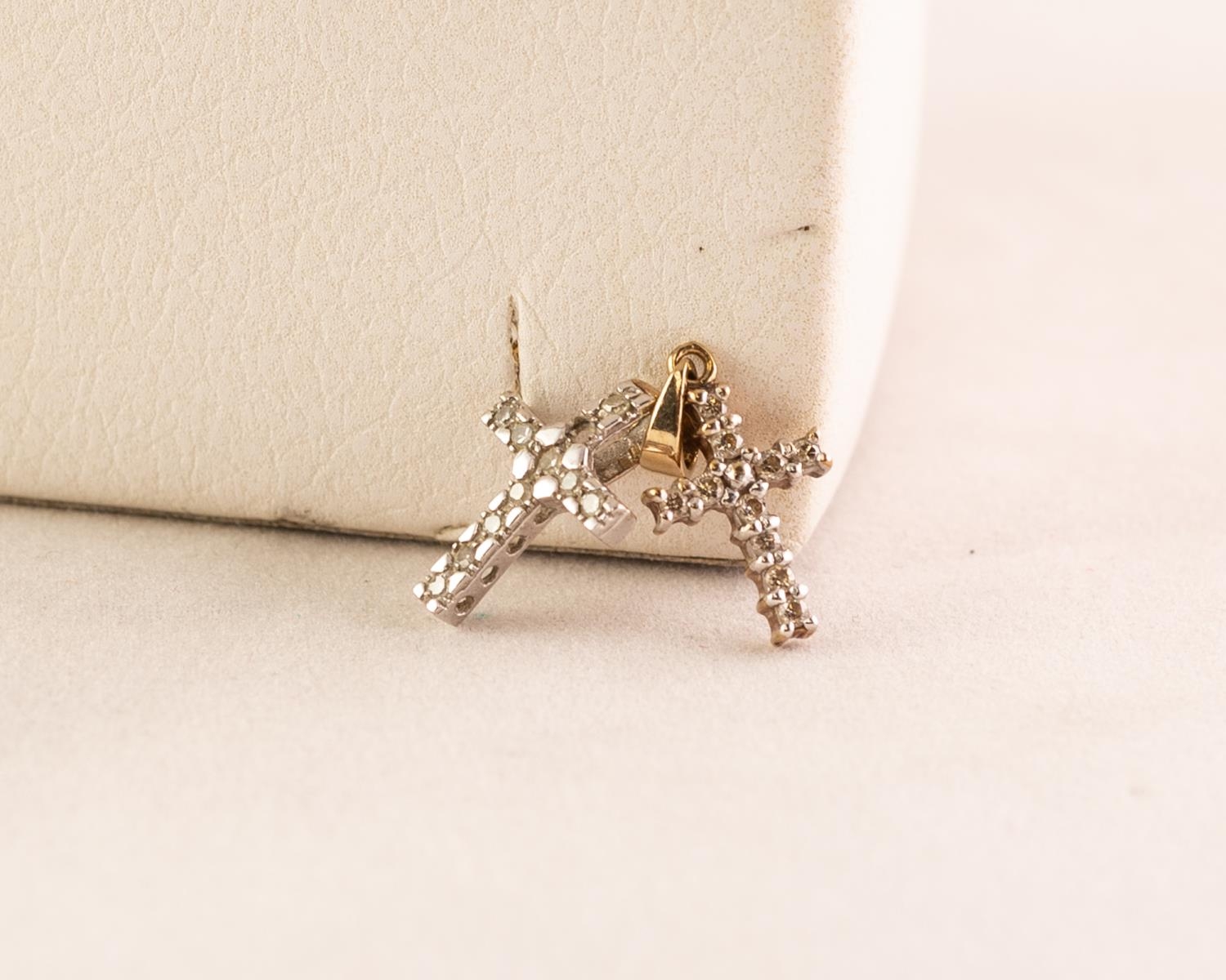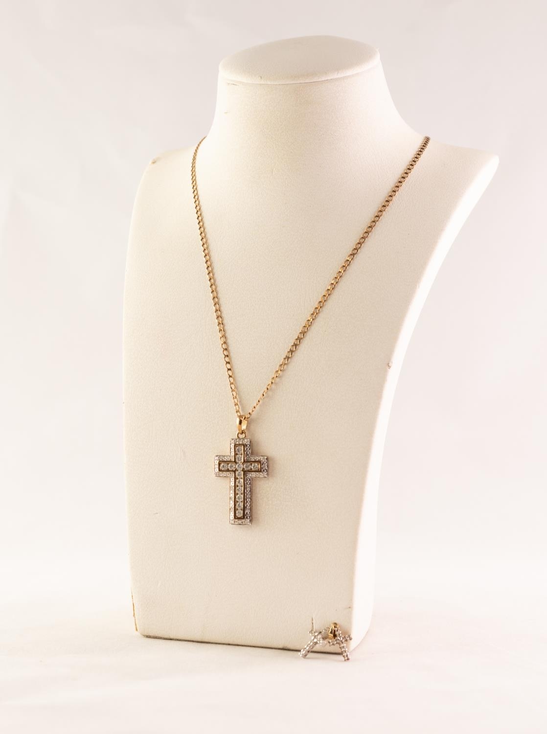 9ct GOLD WHITE STONE SET CRUCIFIX on a 9ct GOLD CHAIN, an associated PAIR OF 9ct GOLD tiny white stone set crucifix EAR PENDANTS, 6.8 gms gross all in (3)
