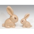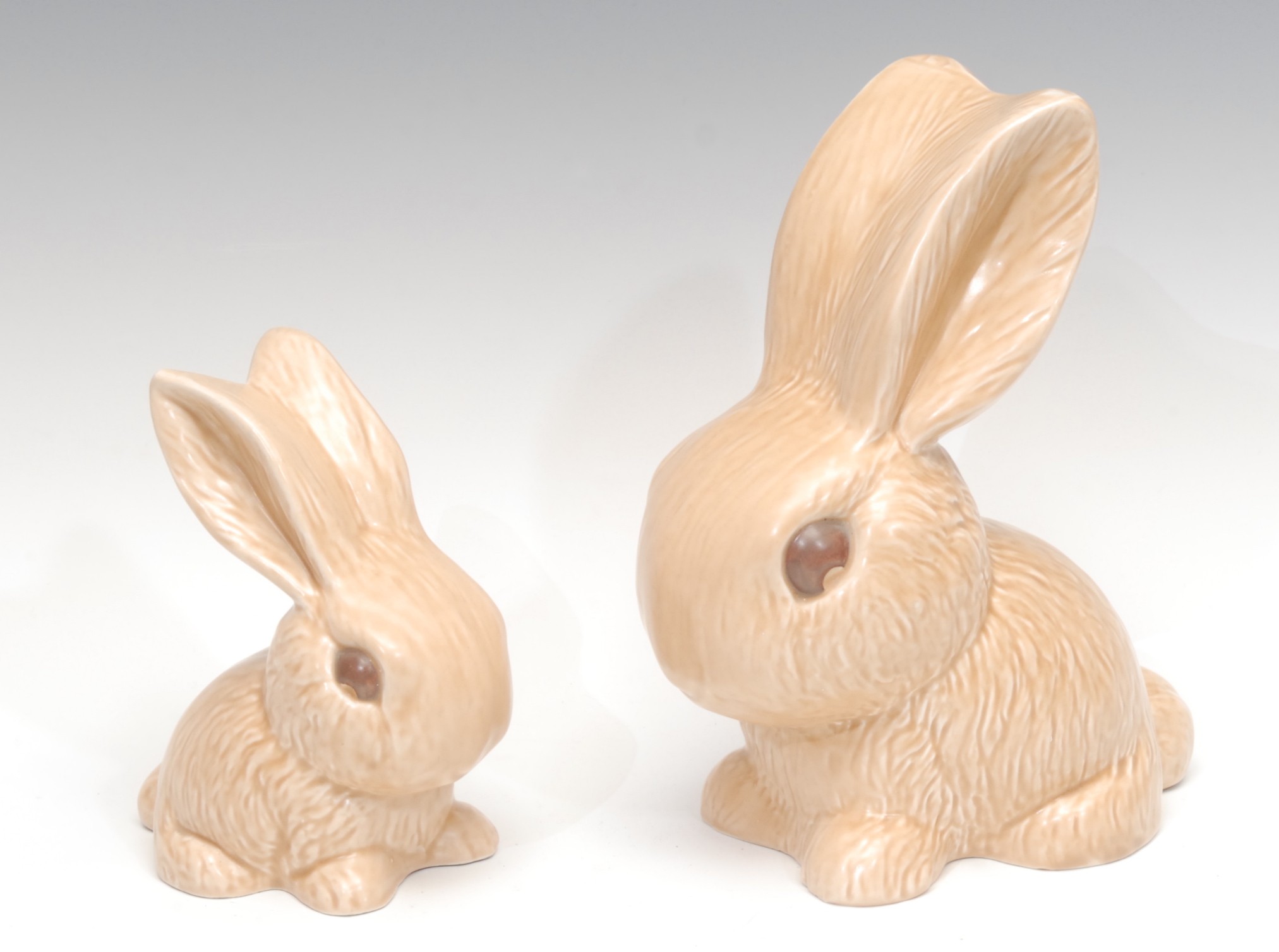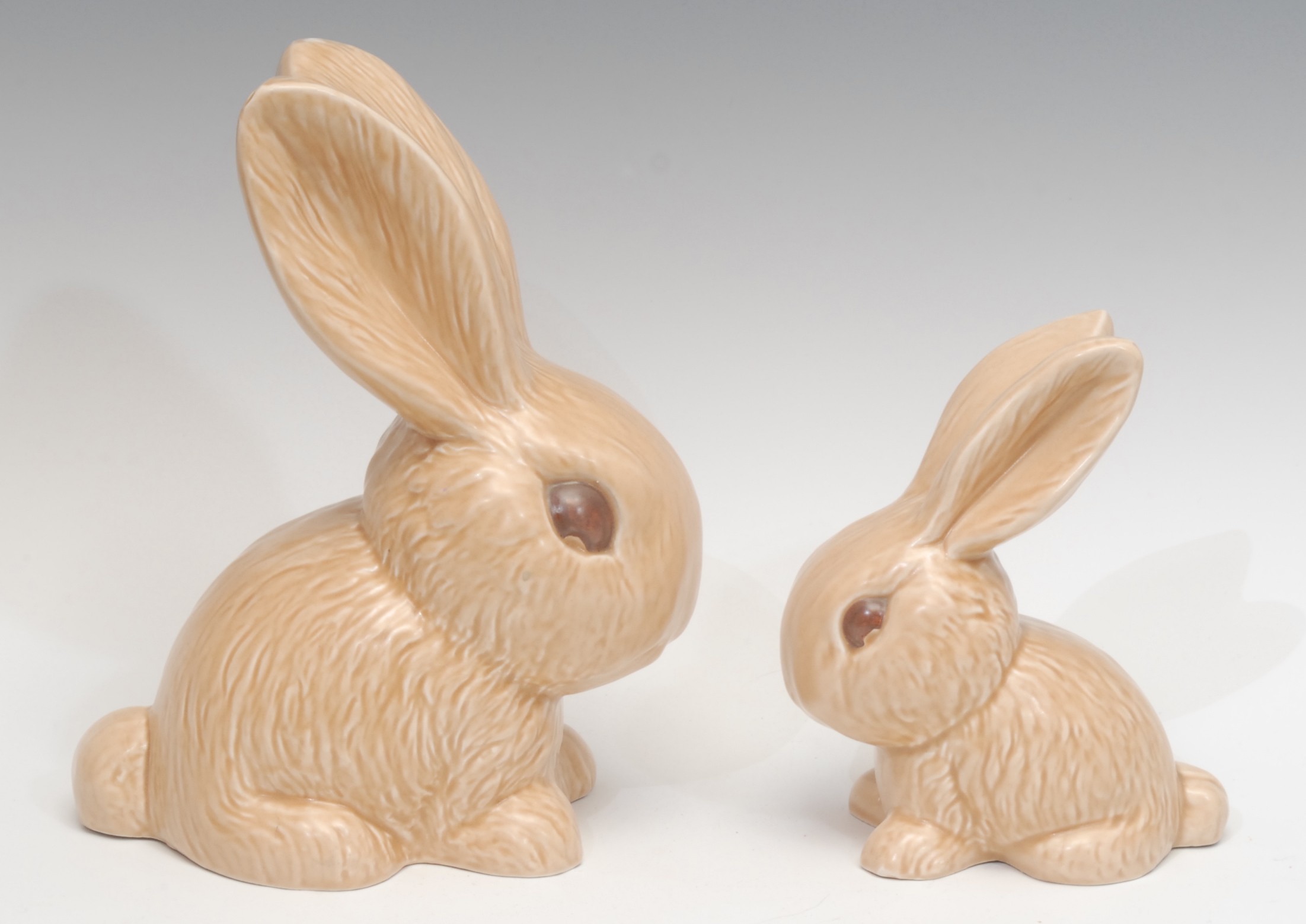 A Sylvac rabbit model, glazed in light sandy brown, number 1028, 25cm, impressed marks, c.1930; another smaller, 1026, 16cm, impressed marks, c.1930 (2)