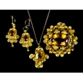 A Gilt Metal Suite of Gem Set Jewellery, comprising - brooch, earrings for non-pierced ears, and pendant on yellow metal chain, each set with faceted yellow stones, total gross weight 36.5g