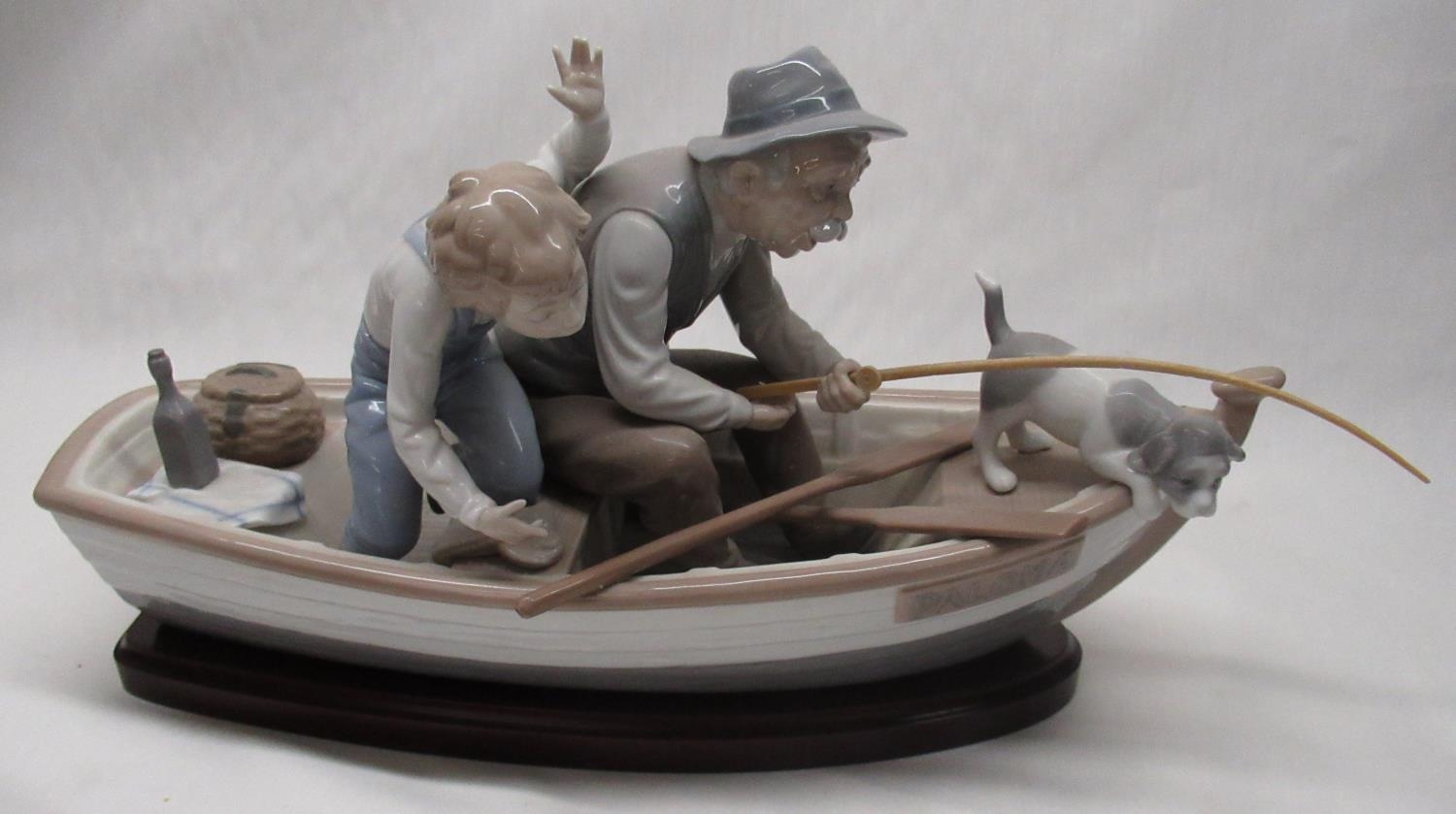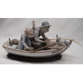 Large Lladro Fishing with Gramps in Paloma boat model on shaped plinth L40cm H23cm