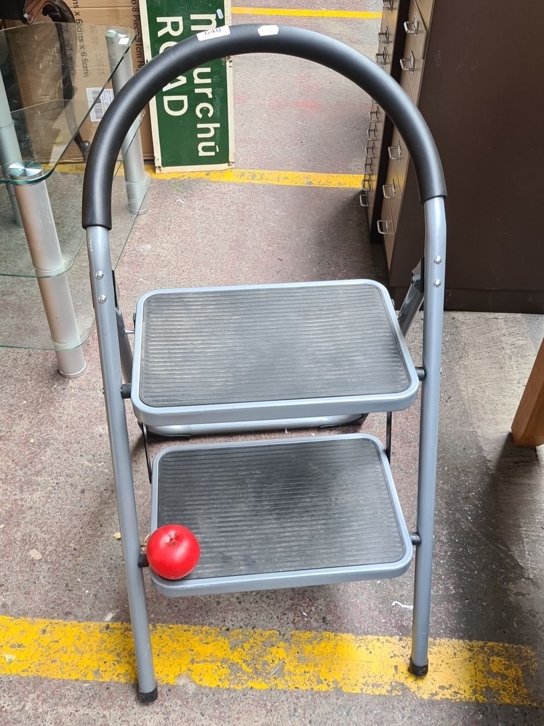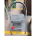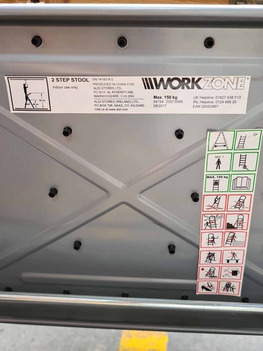 Workzone 2-Step Stool. Made for ALDI Stores Ltd., maximum load capacity 150 kg, indoor use only. Produced in China, June 2017.