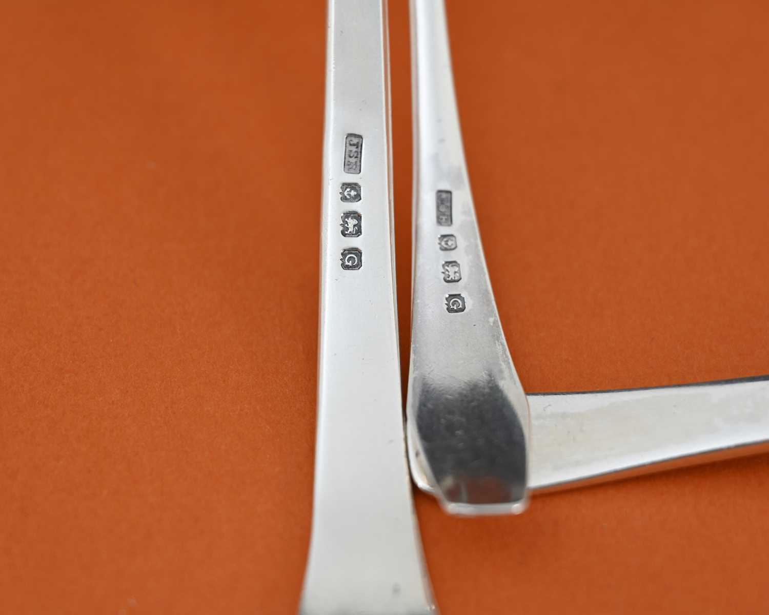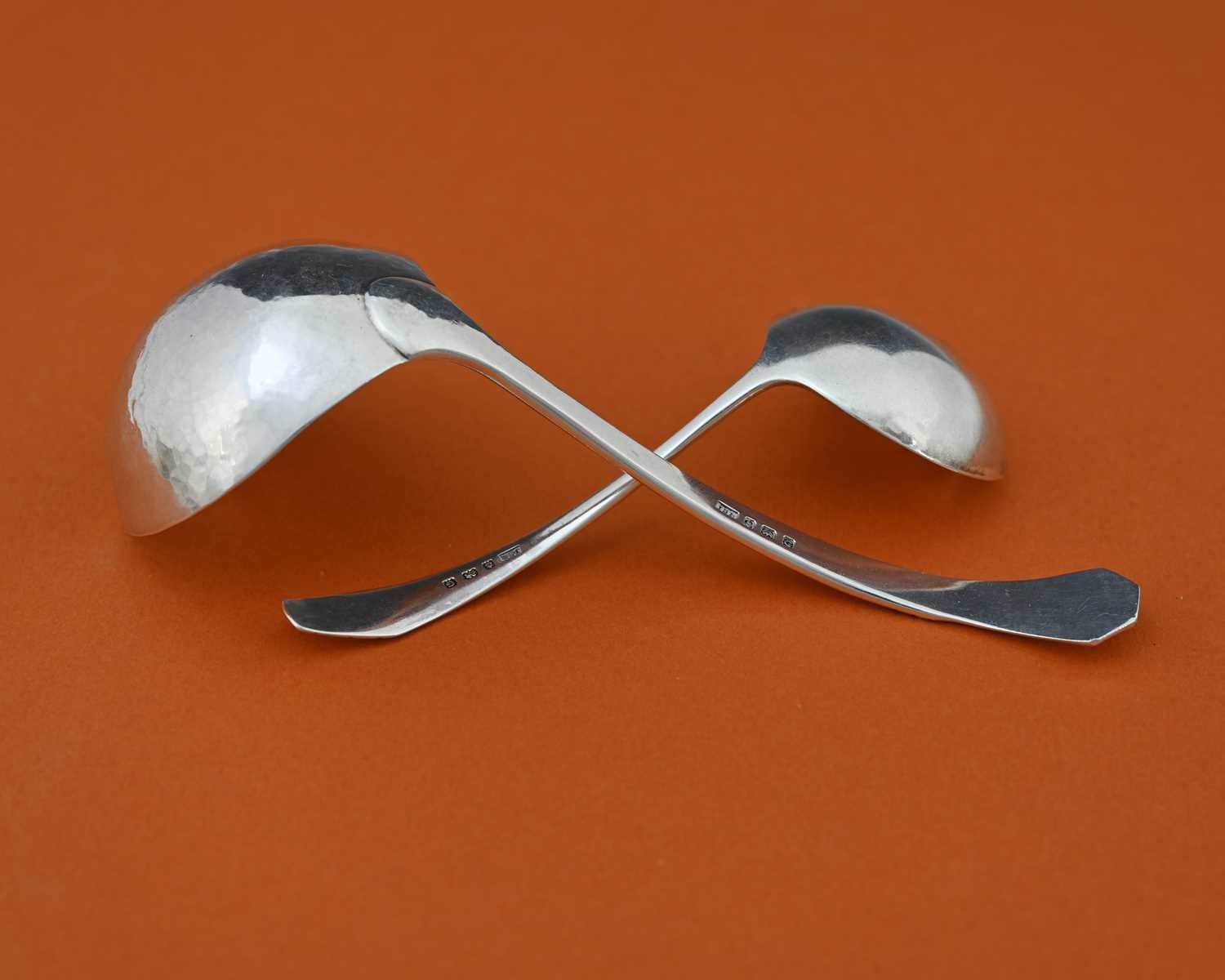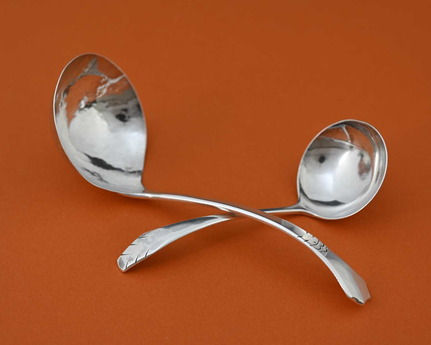 John Sidney Reeve, two Arts and Crafts silver ladles, Birmingham 1931, each with angled point and line incised terminals, 17cm long, 2.70ozt (2)