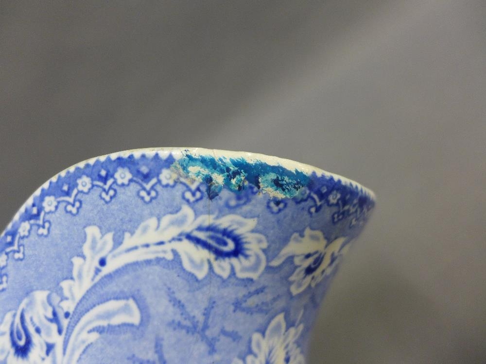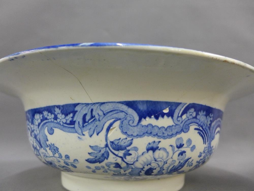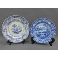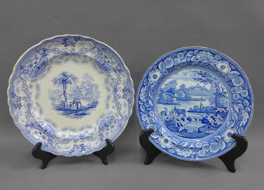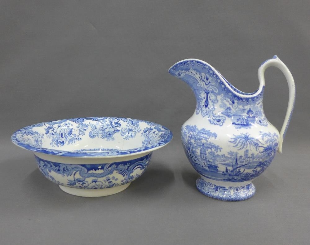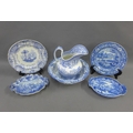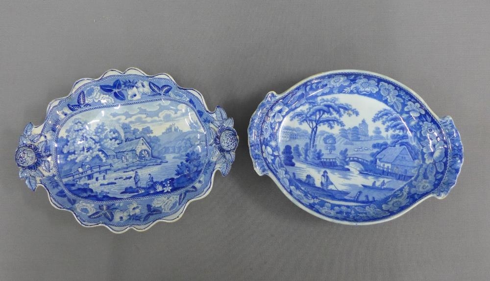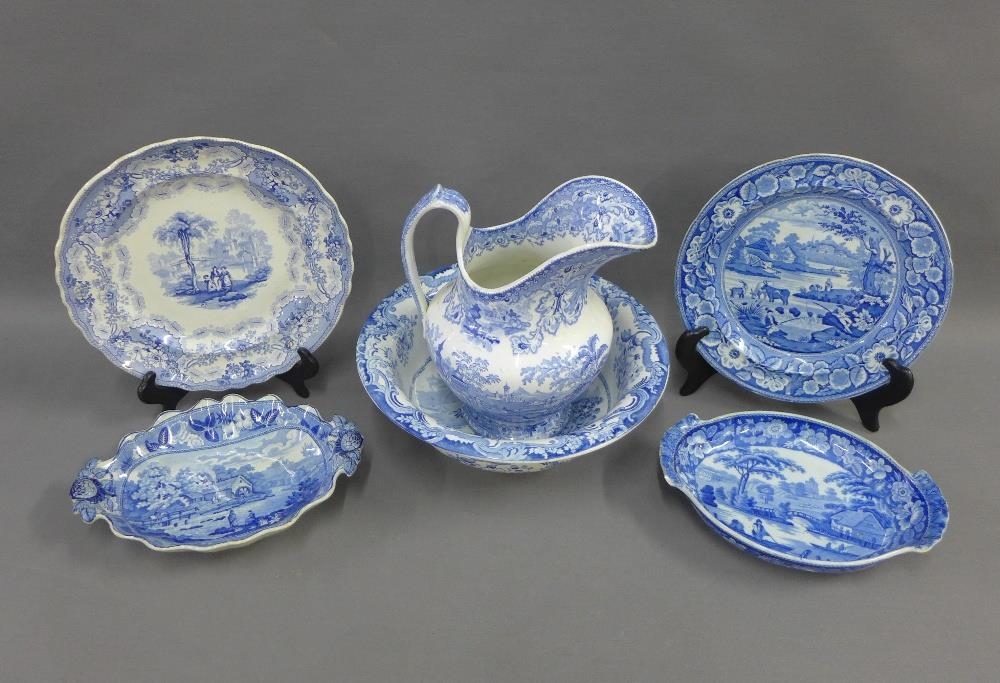 Collection of 19th century Staffordshire blue and white transfer printed pottery to include a British Scenery dessert dish, Chinese Marine basin, Carmanium ewer, British Rivers pattern plate, Boys Fishing pattern plate, etc (6)