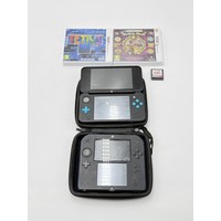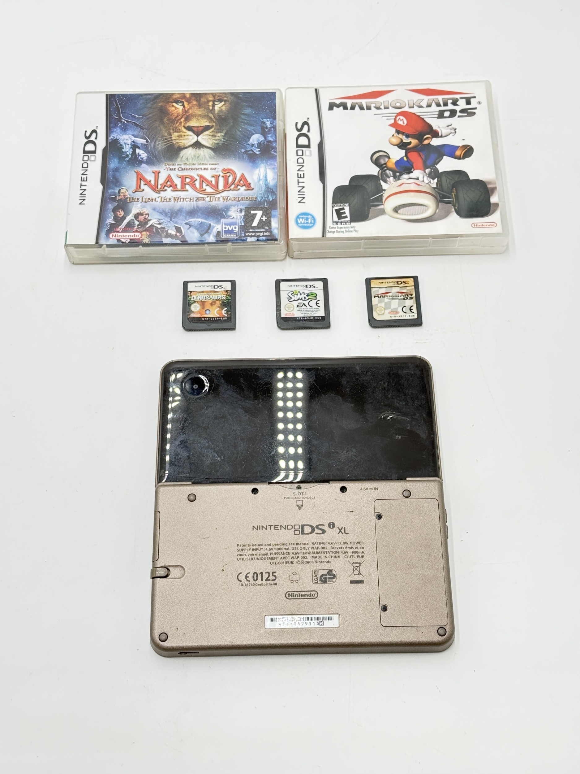 A Nintendo DSi XL handheld game console with five games to include MarioKart DS, Narnia, Sims2 etc.