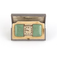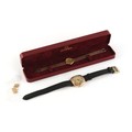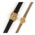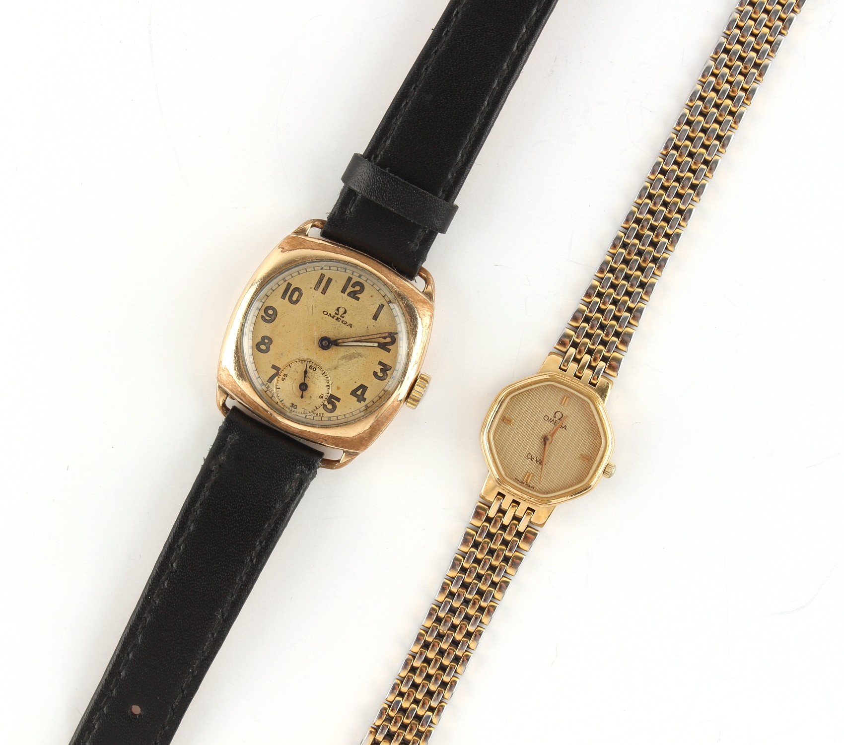 Property of a deceased estate - a 1930's gentleman's Omega gold plated mechanical wristwatch, appears to be working but no guarantees are given, on black leather strap; together with a lady's Omega De Ville gold plated quartz wristwatch, in original box (2).