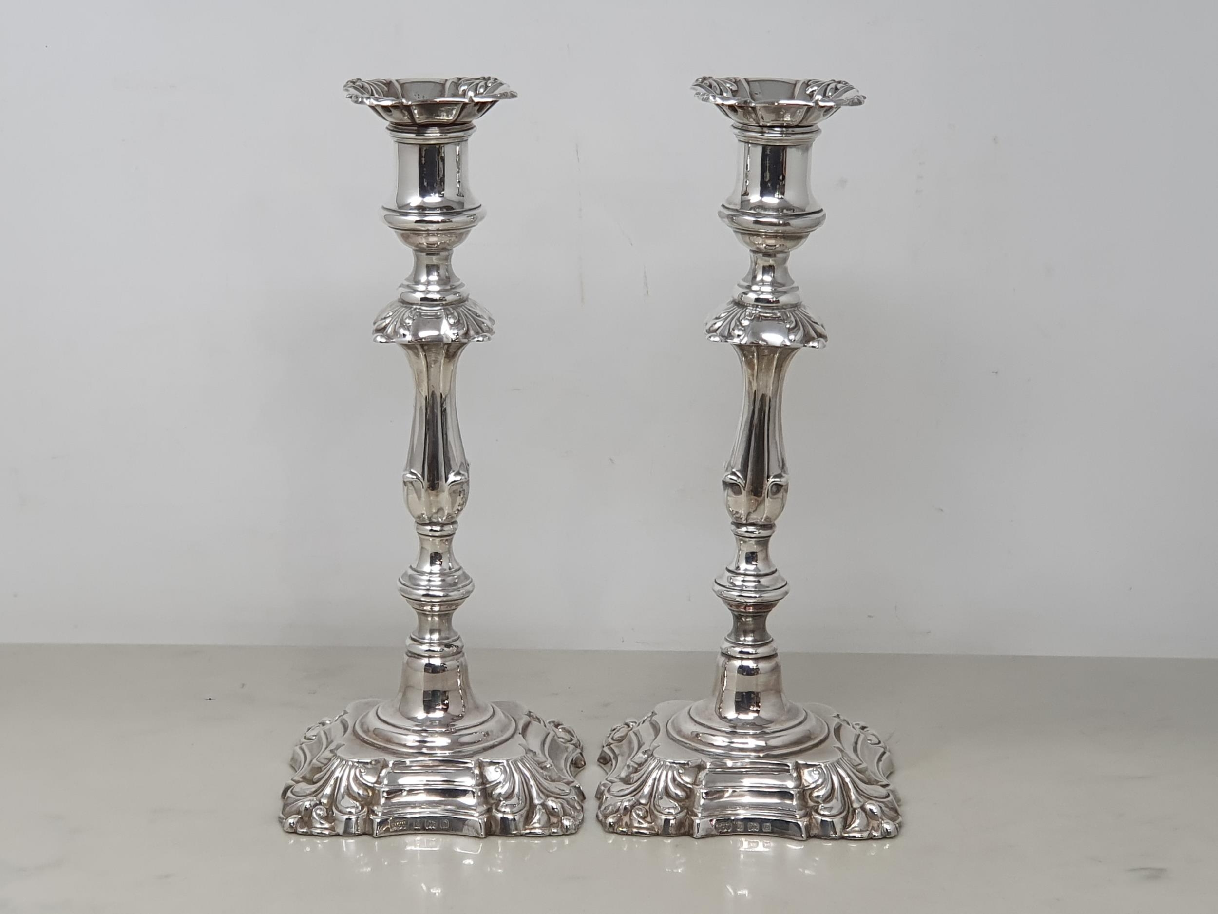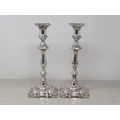 A pair of Edward VII silver Table Candlesticks with knopped stems on shaped square bases, Birmingham 1902, 10in, maker: Elkington and co, Ltd