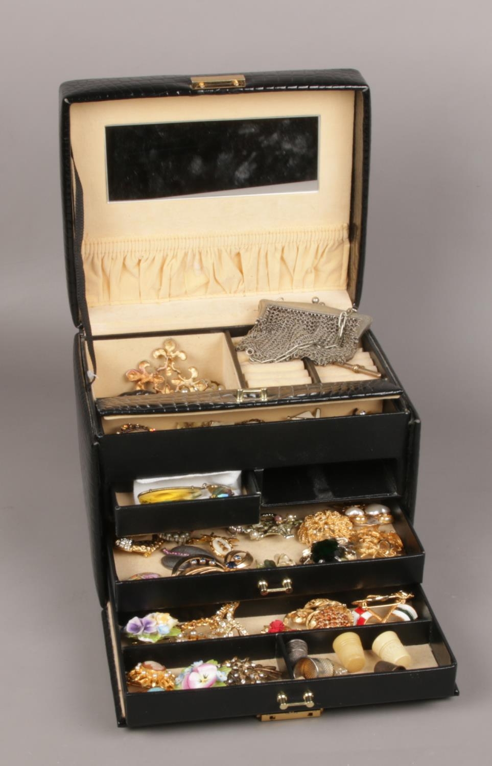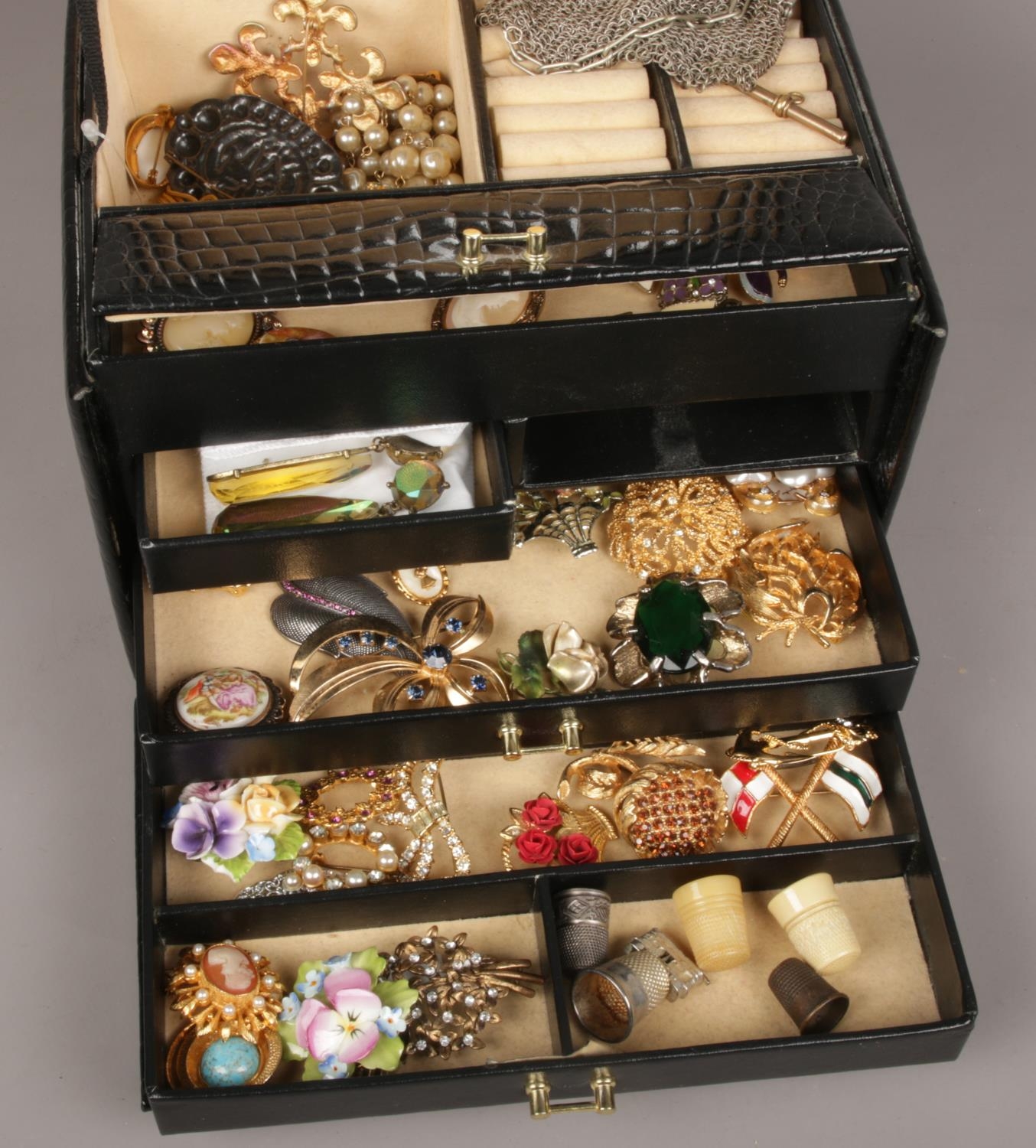 A collection of costume jewellery, brooches, earrings to include jewellery box