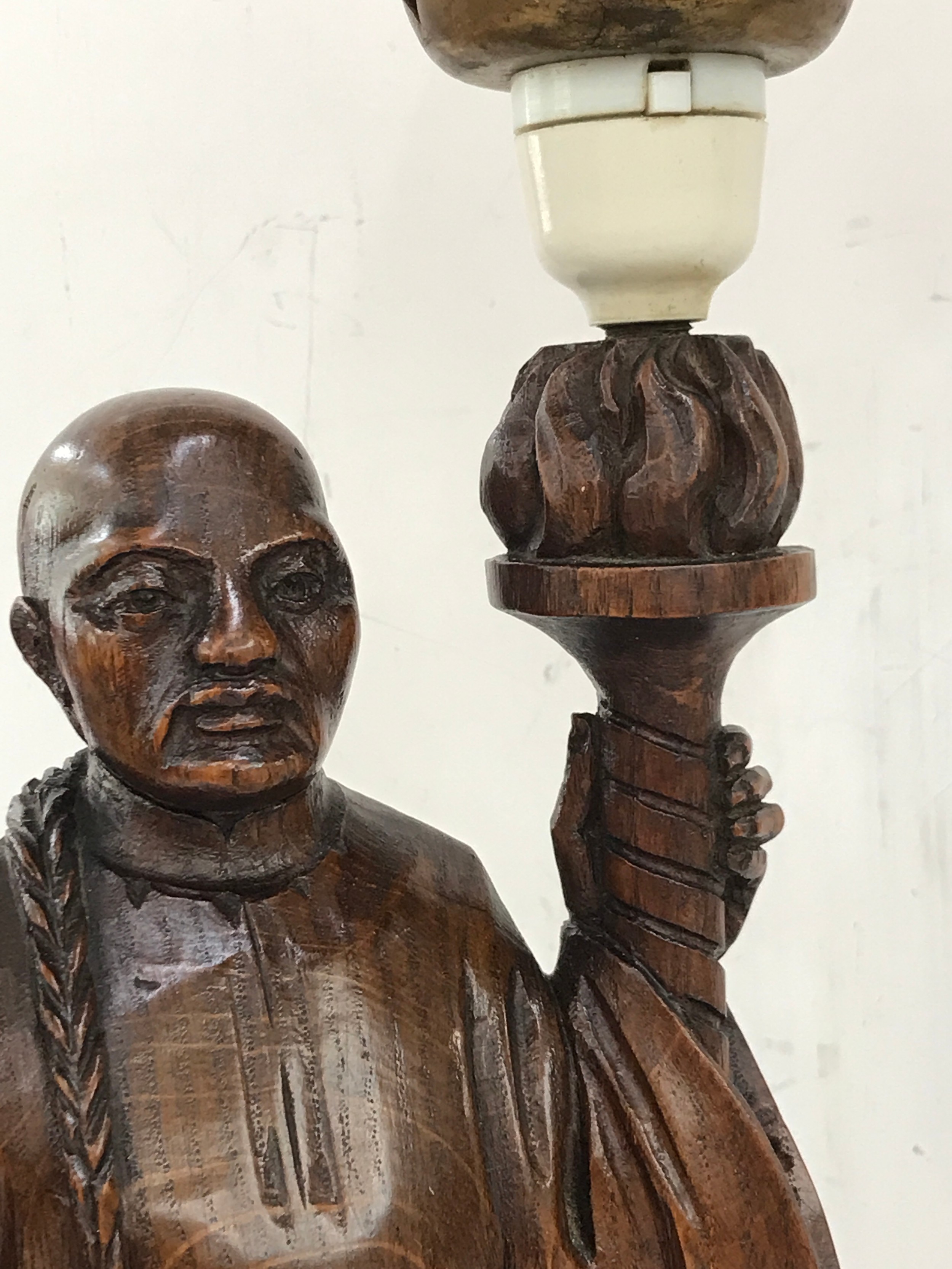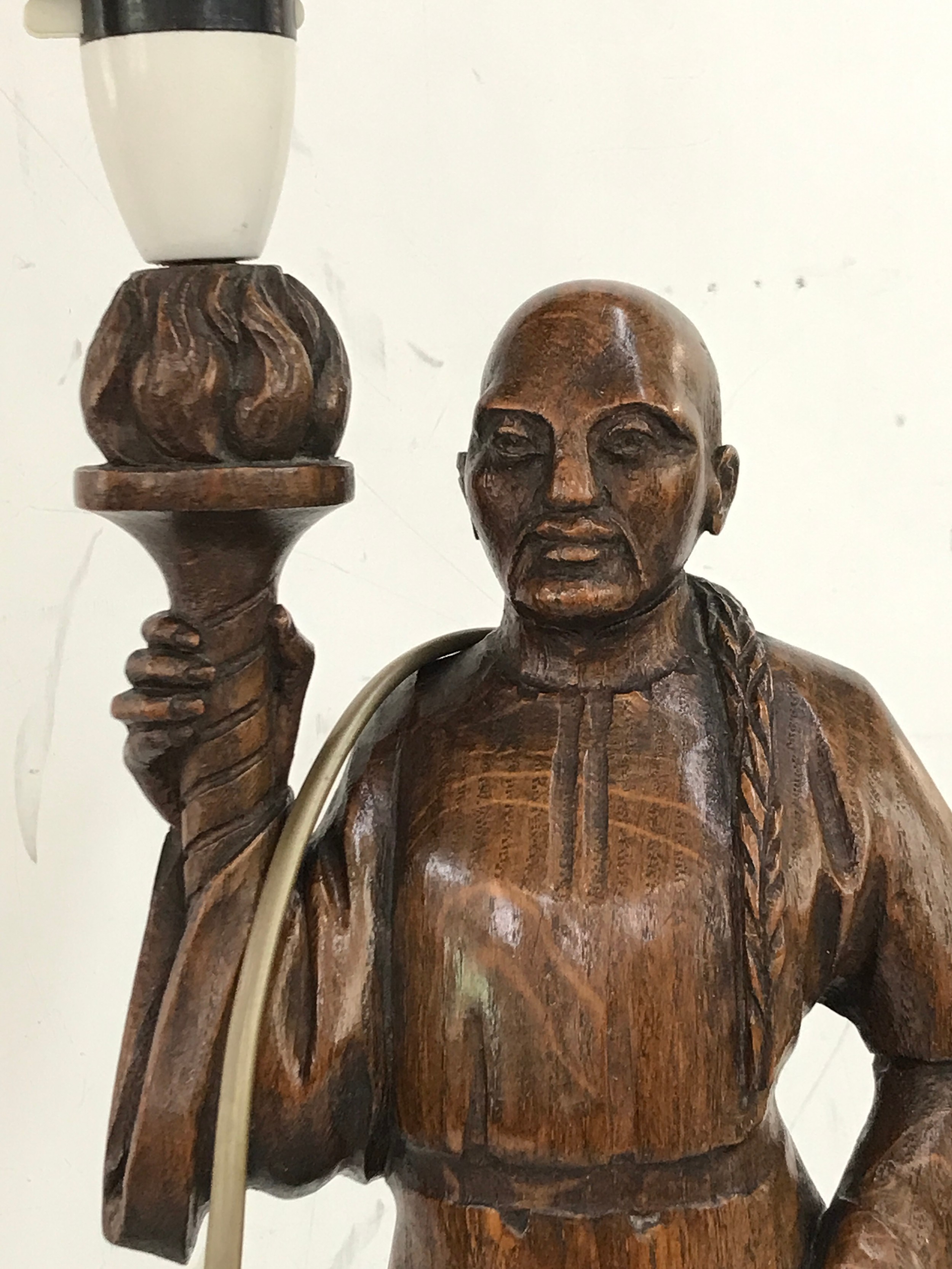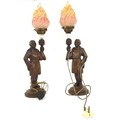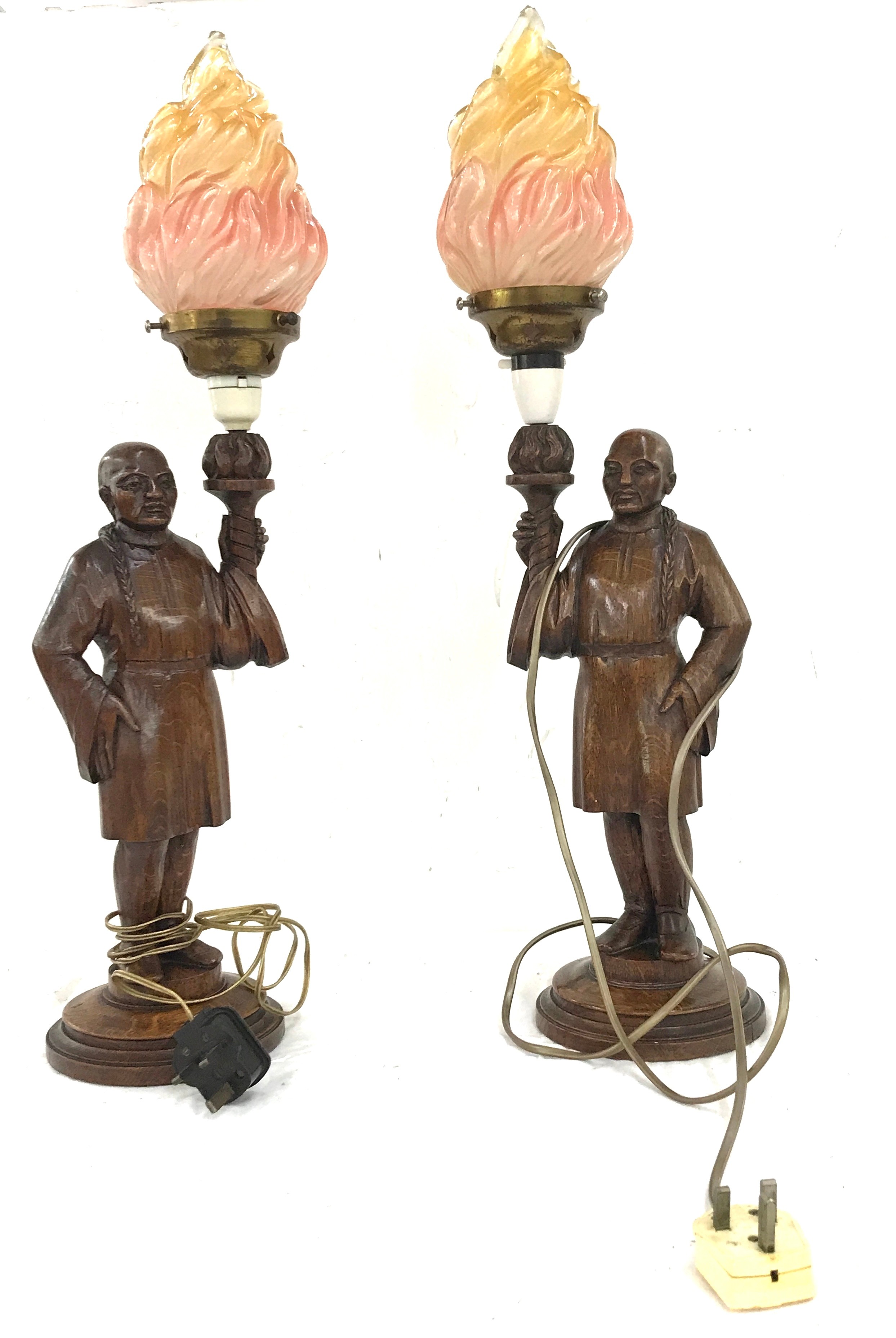 Pair of carved wooden lamps of with glass flame lamp shades, height approximately 25 inches