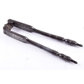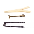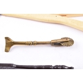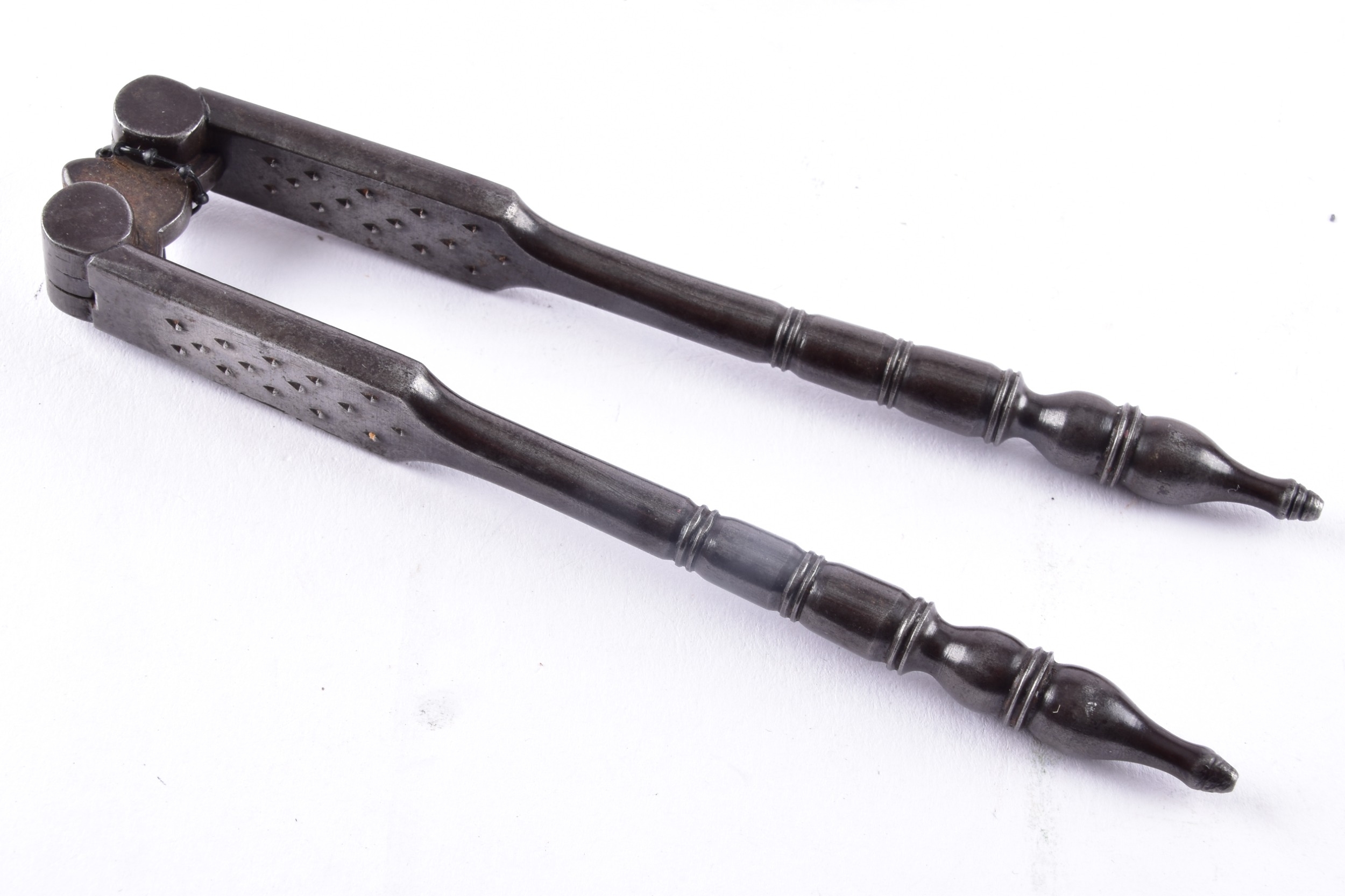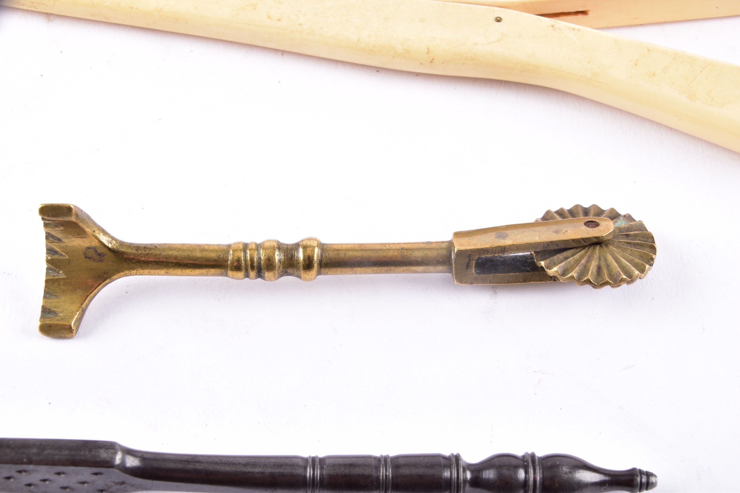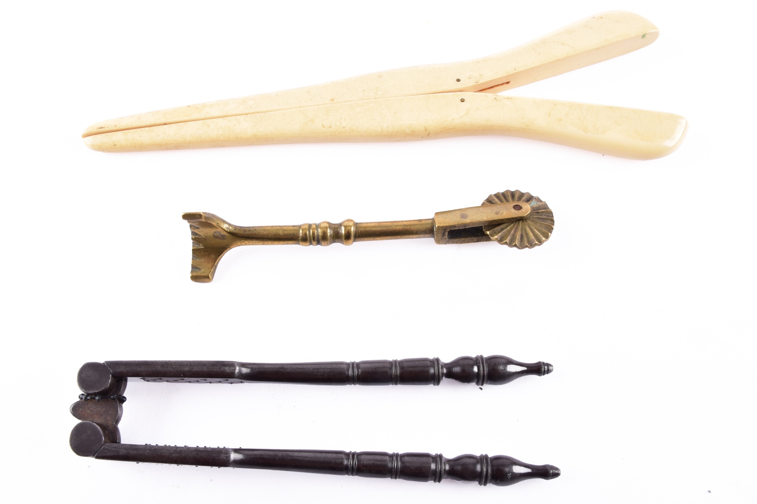 A vintage brass pastry tool, a celluloid glove stretcher, together with a antique iron nut cracker. (3)