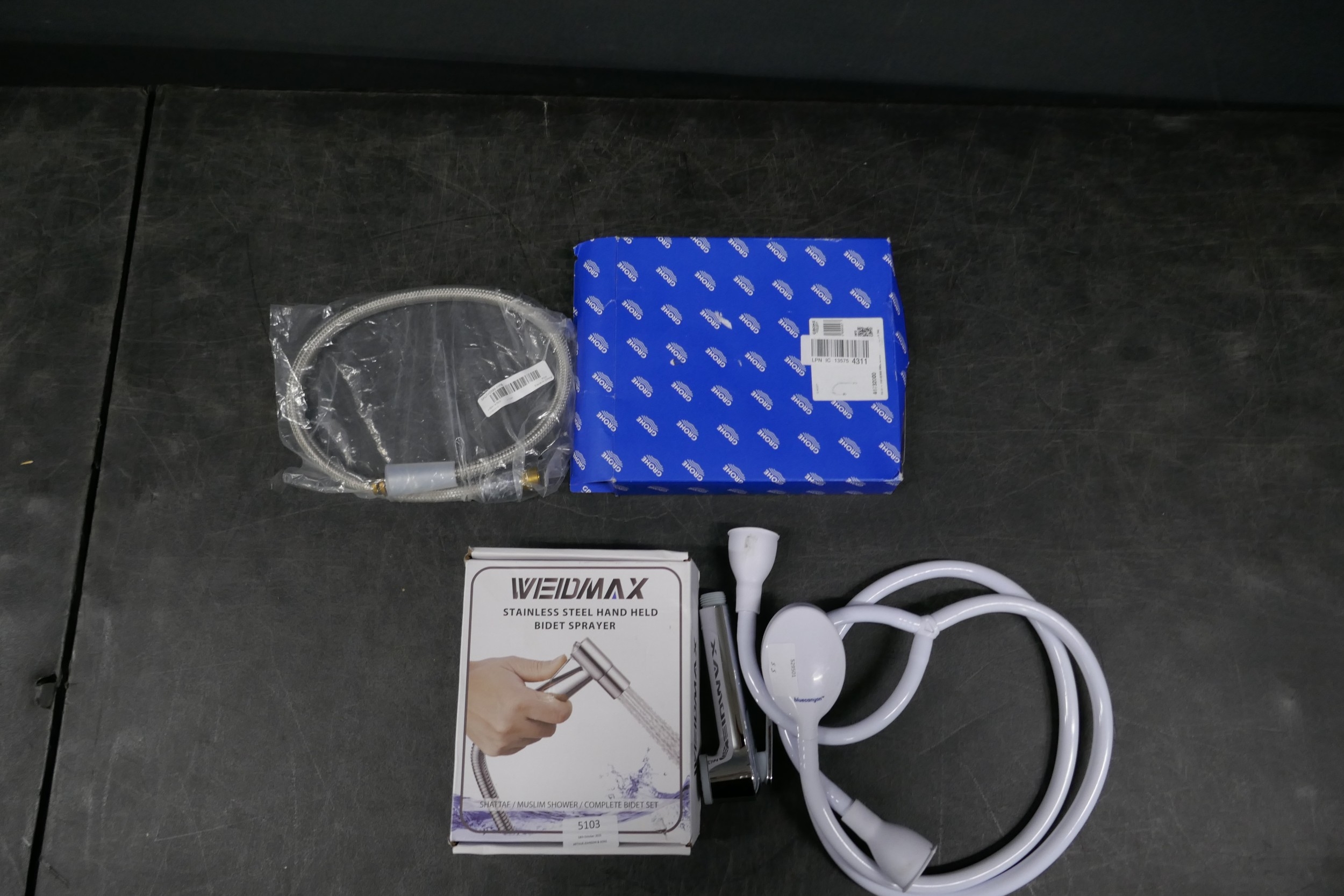 A Bluecanyon tap shower attachment, a Weidmax stainless steel handheld bidet sprayer and one other sprayer and a Grohe flexible tap hose (21731-55) *This lot is subject to VAT