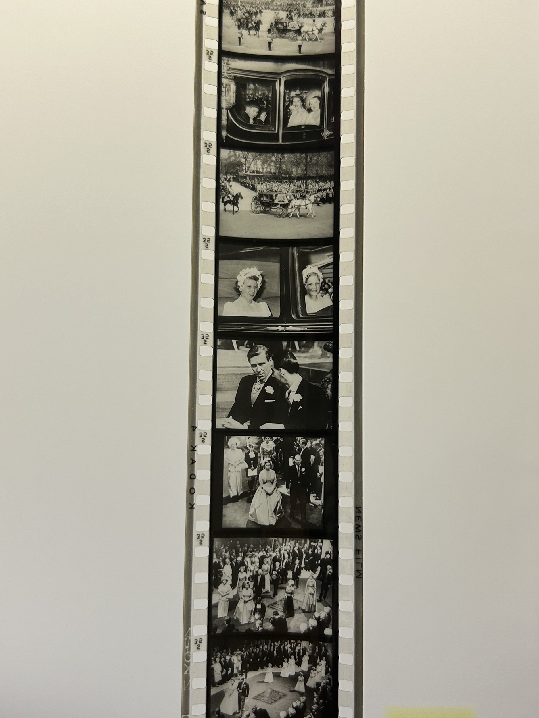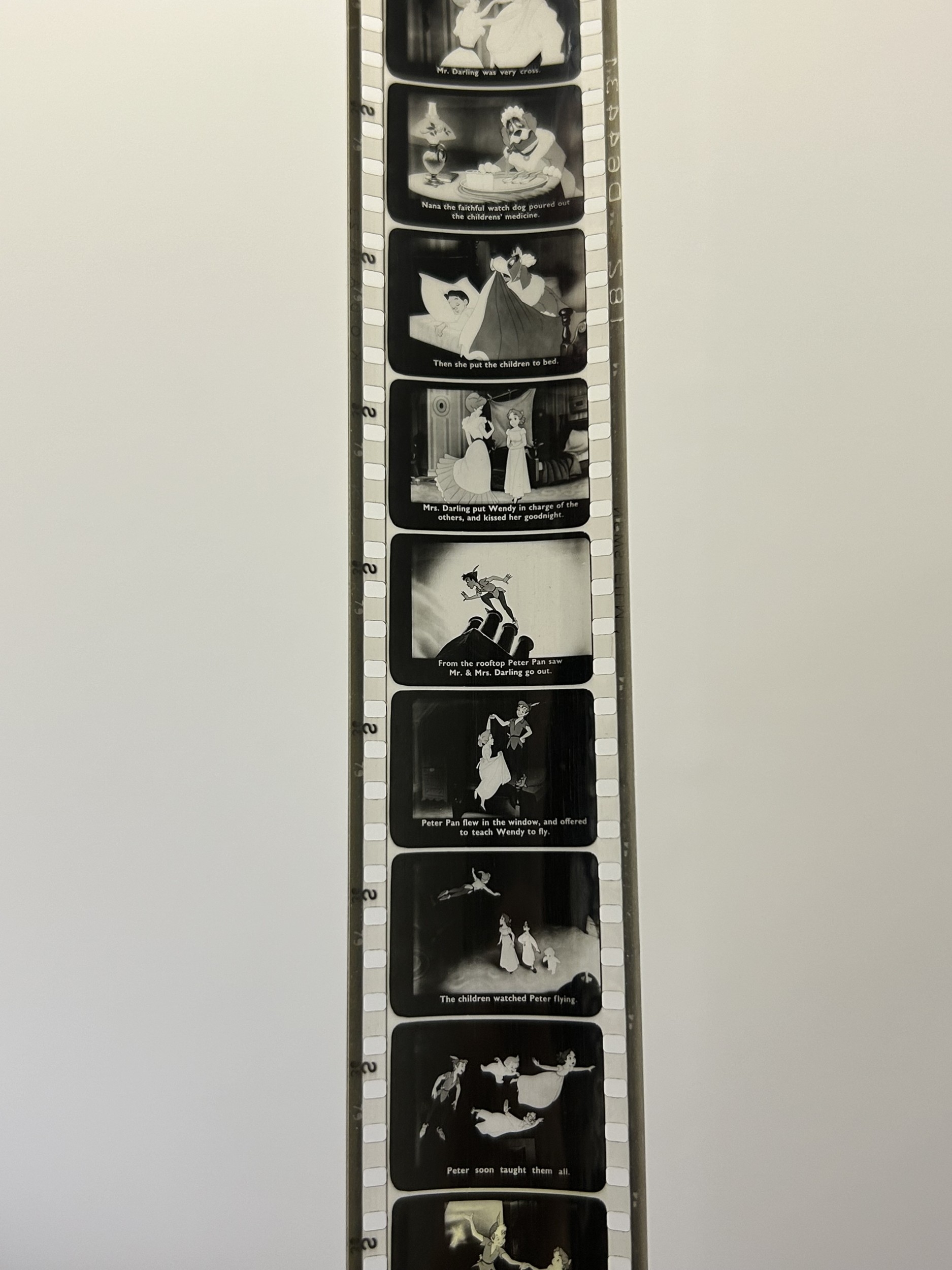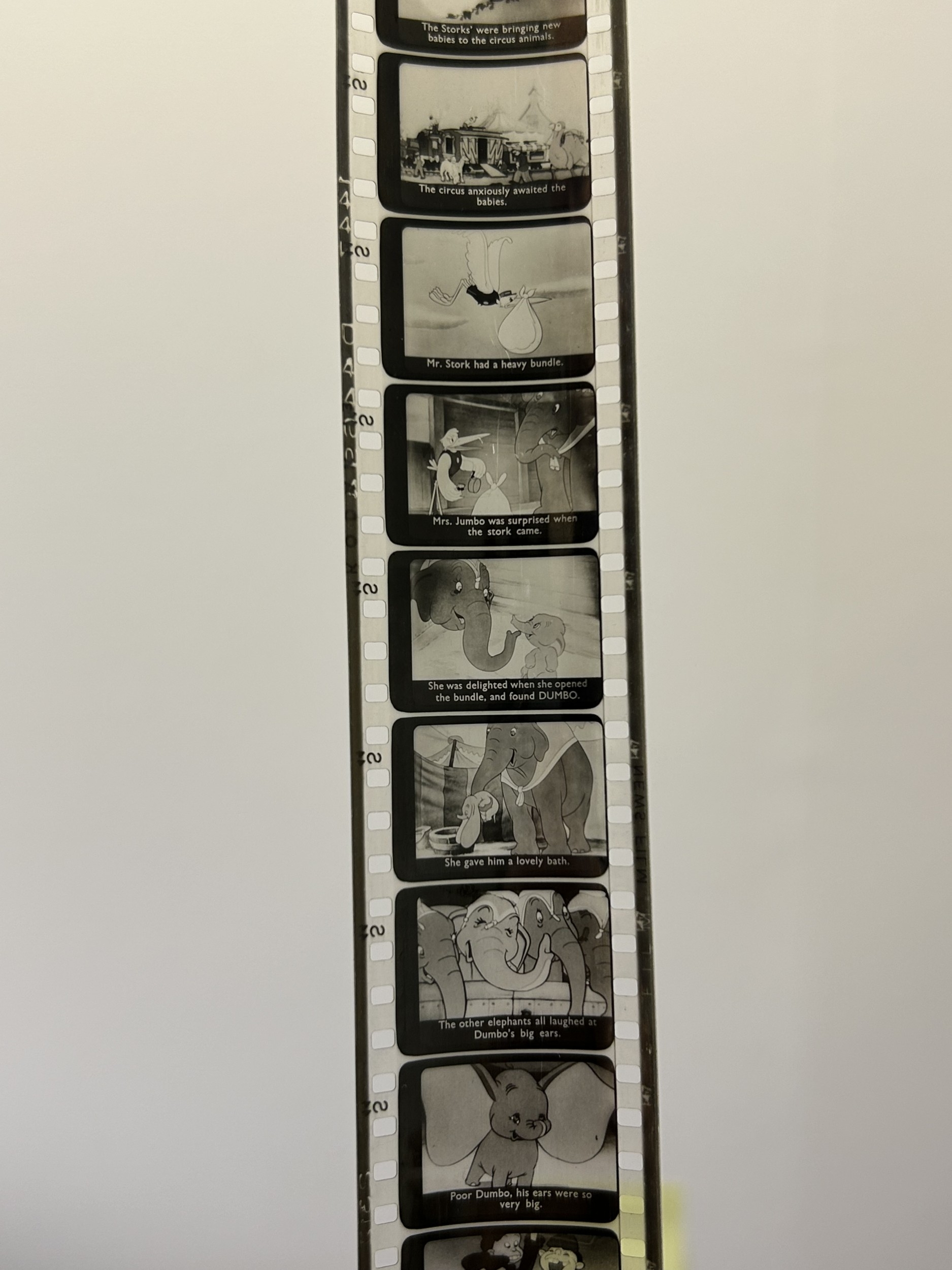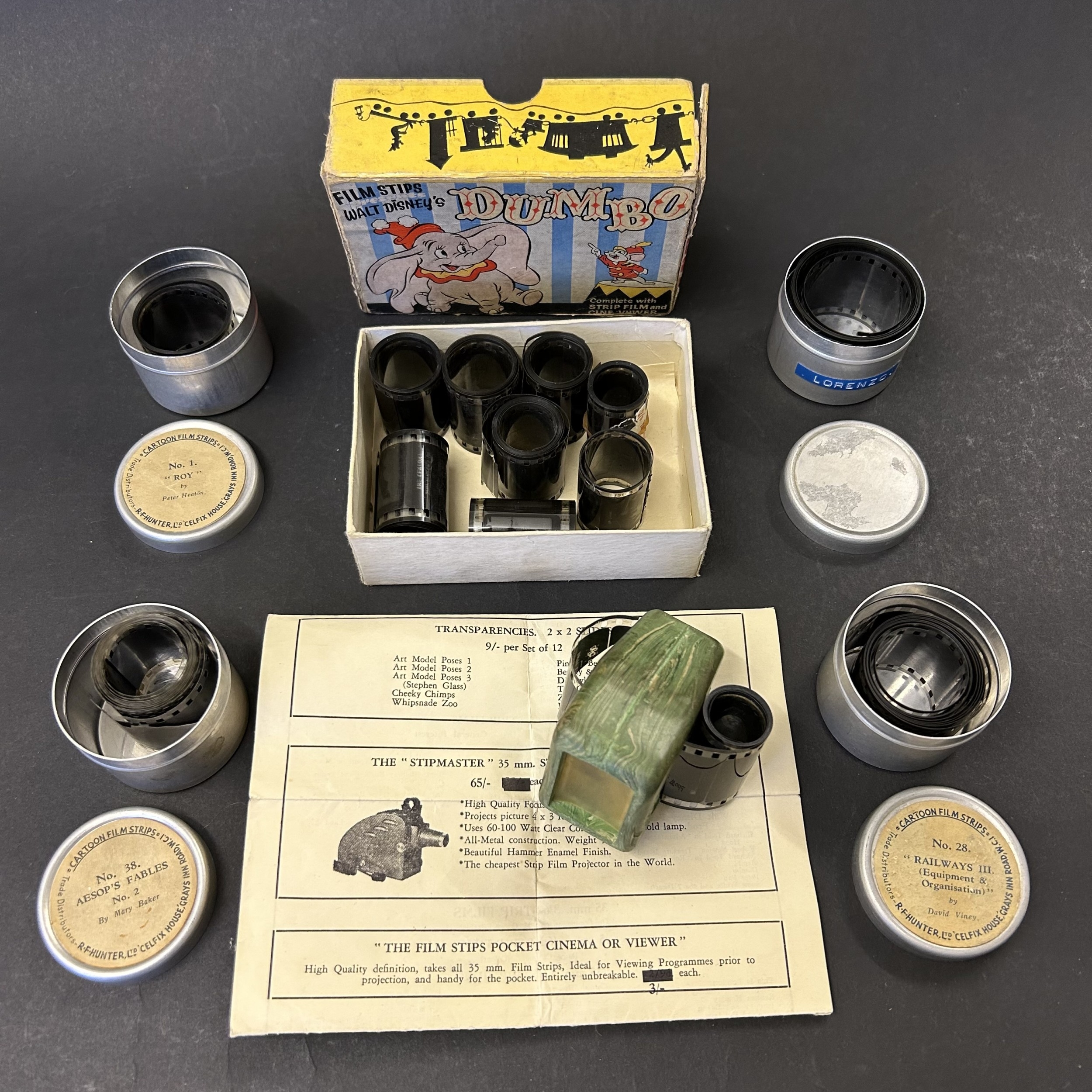 A vintage Dumbo box with 'film strips' of short rolls of film including Disney Peter Pan, 1960 Royal Wedding of Princess Margaret, ships, helicopters, Dumbo etc together with a viewer (used condition)