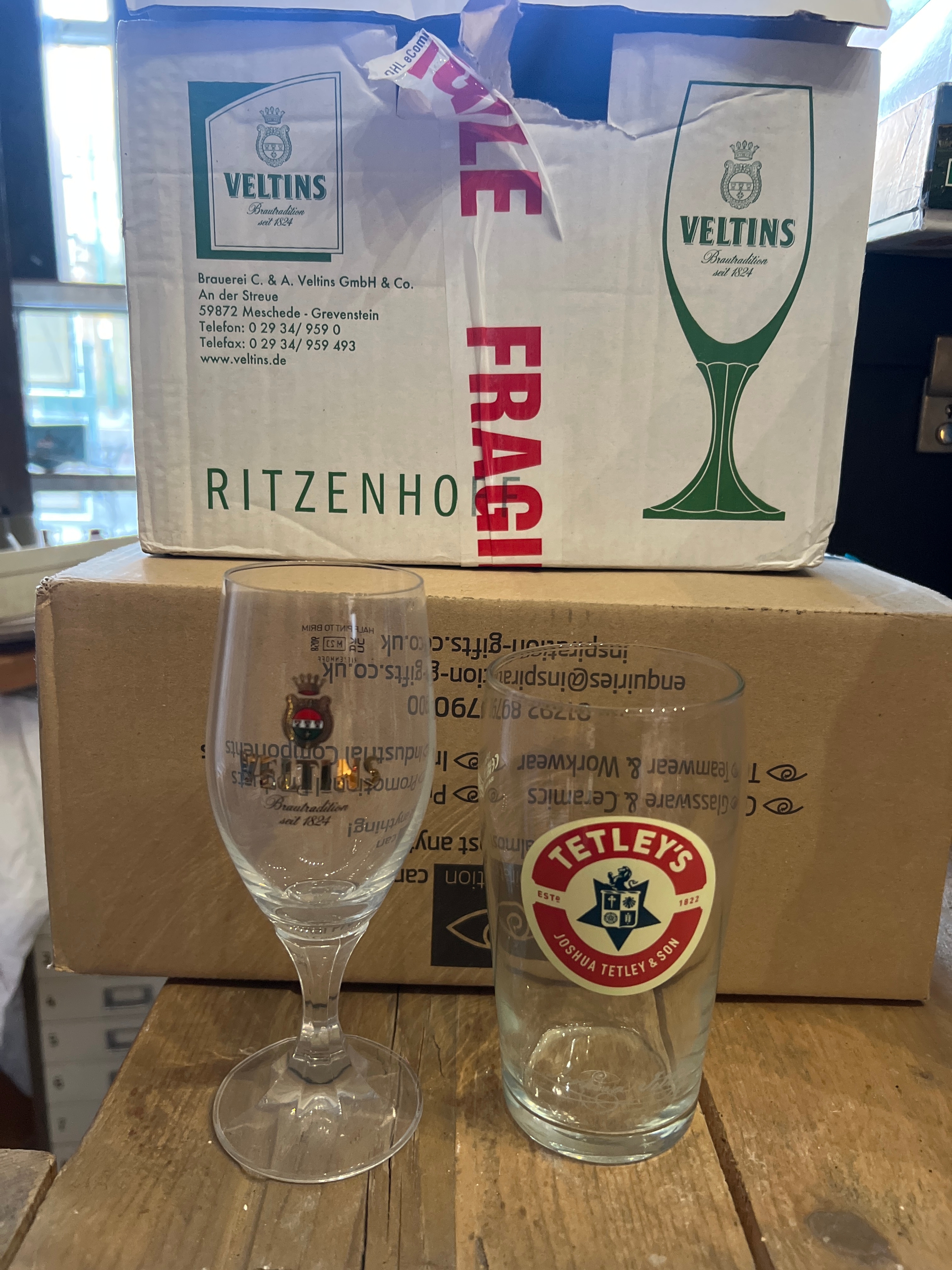 12 tetley pint glasses and 12 veltins halves