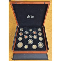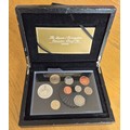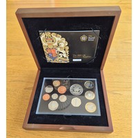 Elizabeth II, 2013 Queens Coronation Executive Proof set, 9 coins, Crown, £2, £1, 50p, 20p, 10p, 5p 2p and 1p, in case of issue, with certificate. The leather case has dried and cracked and shows some loss