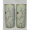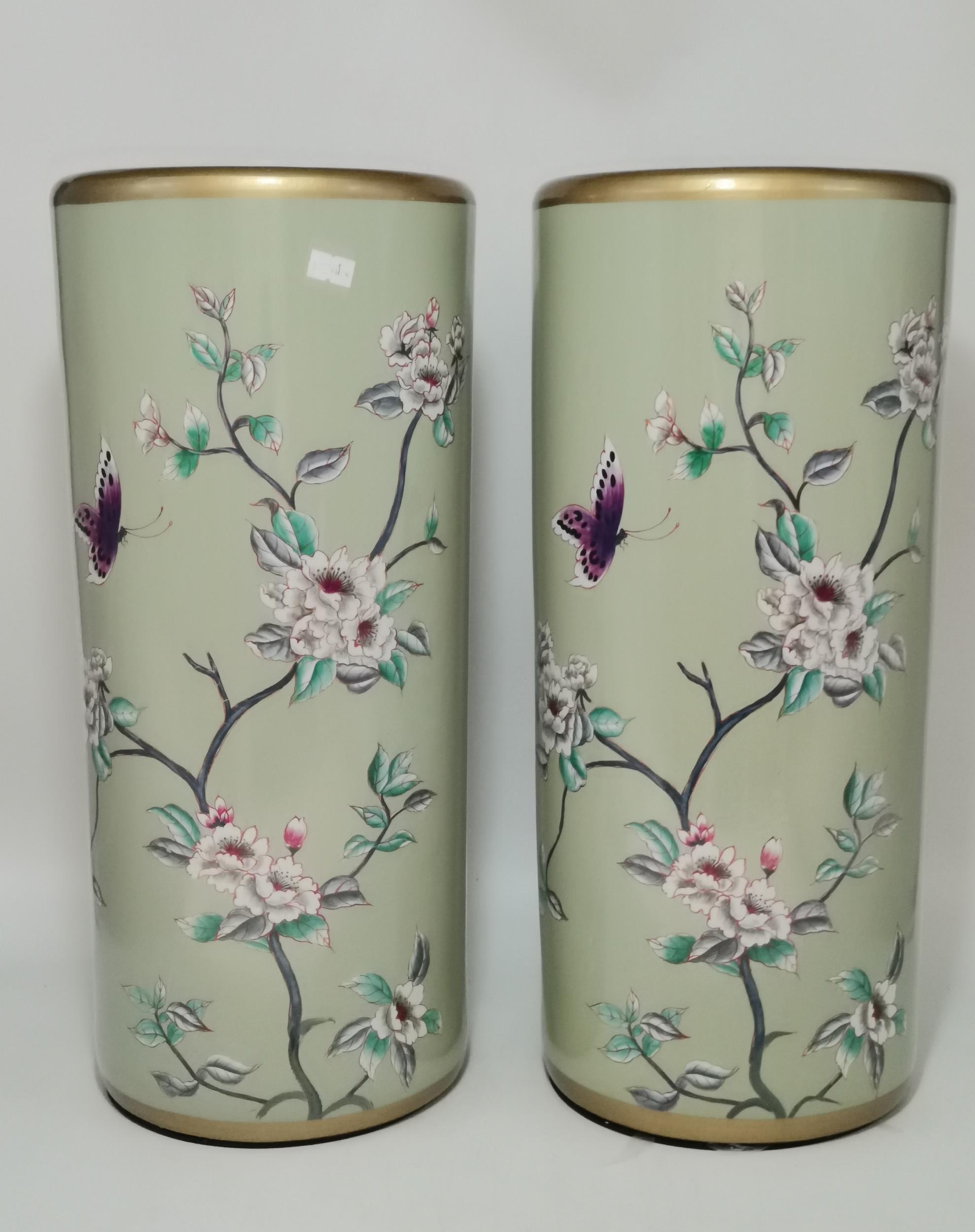 A pair of modern umbrella / stick stands, with gilt rims, decorated with butterflies and flowering branches to a green ground. (2) 47cm high