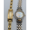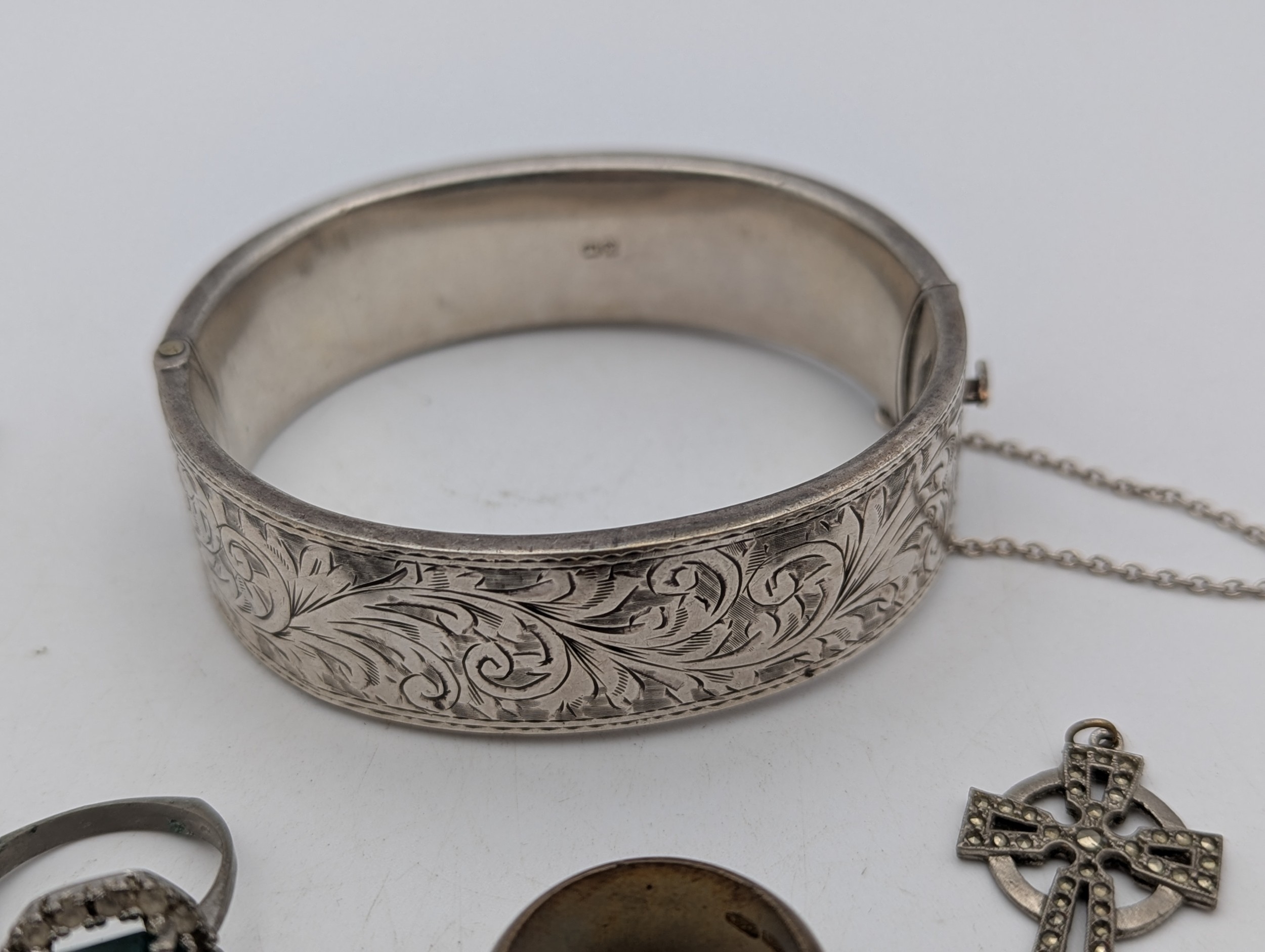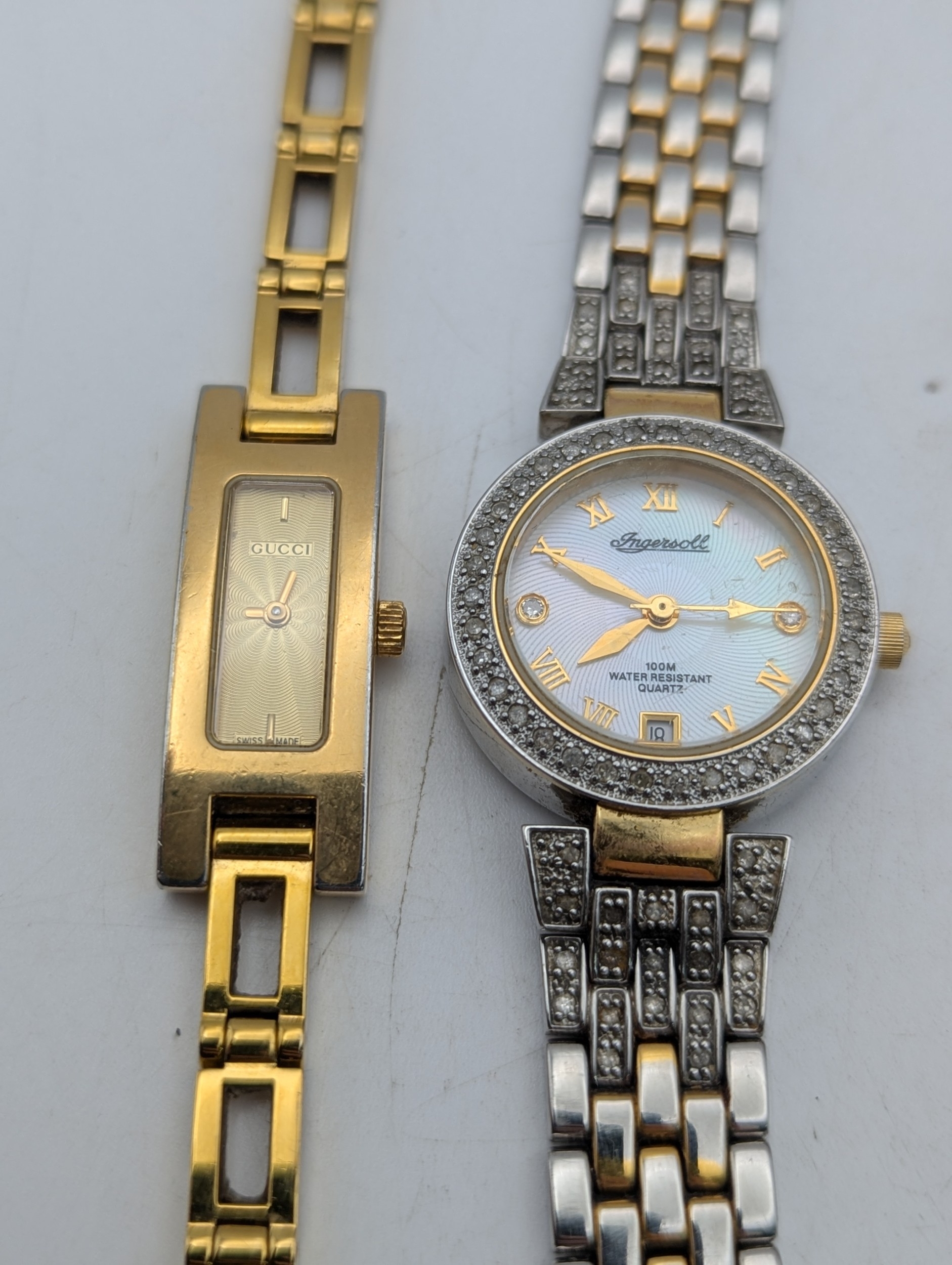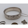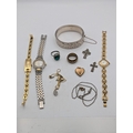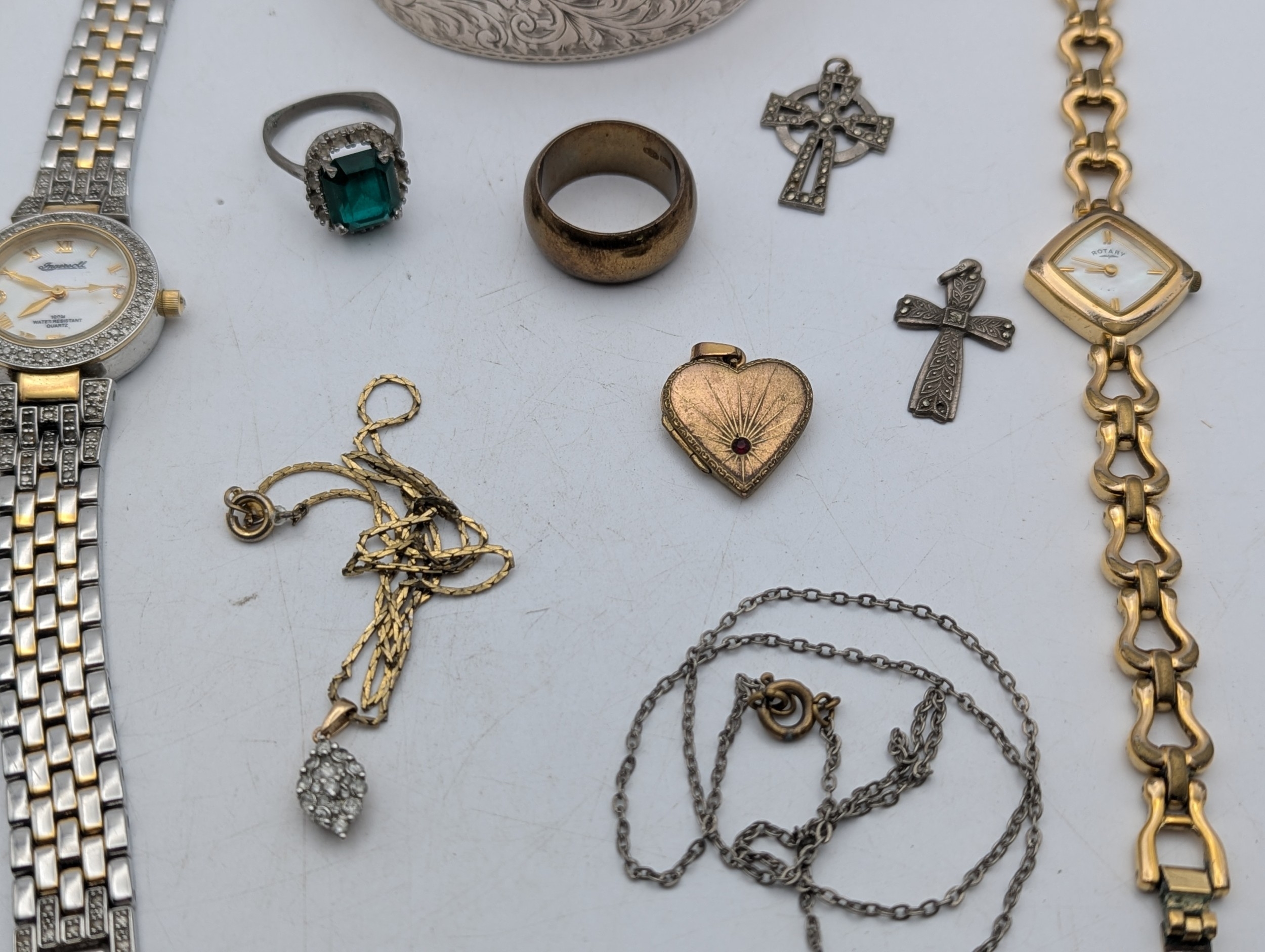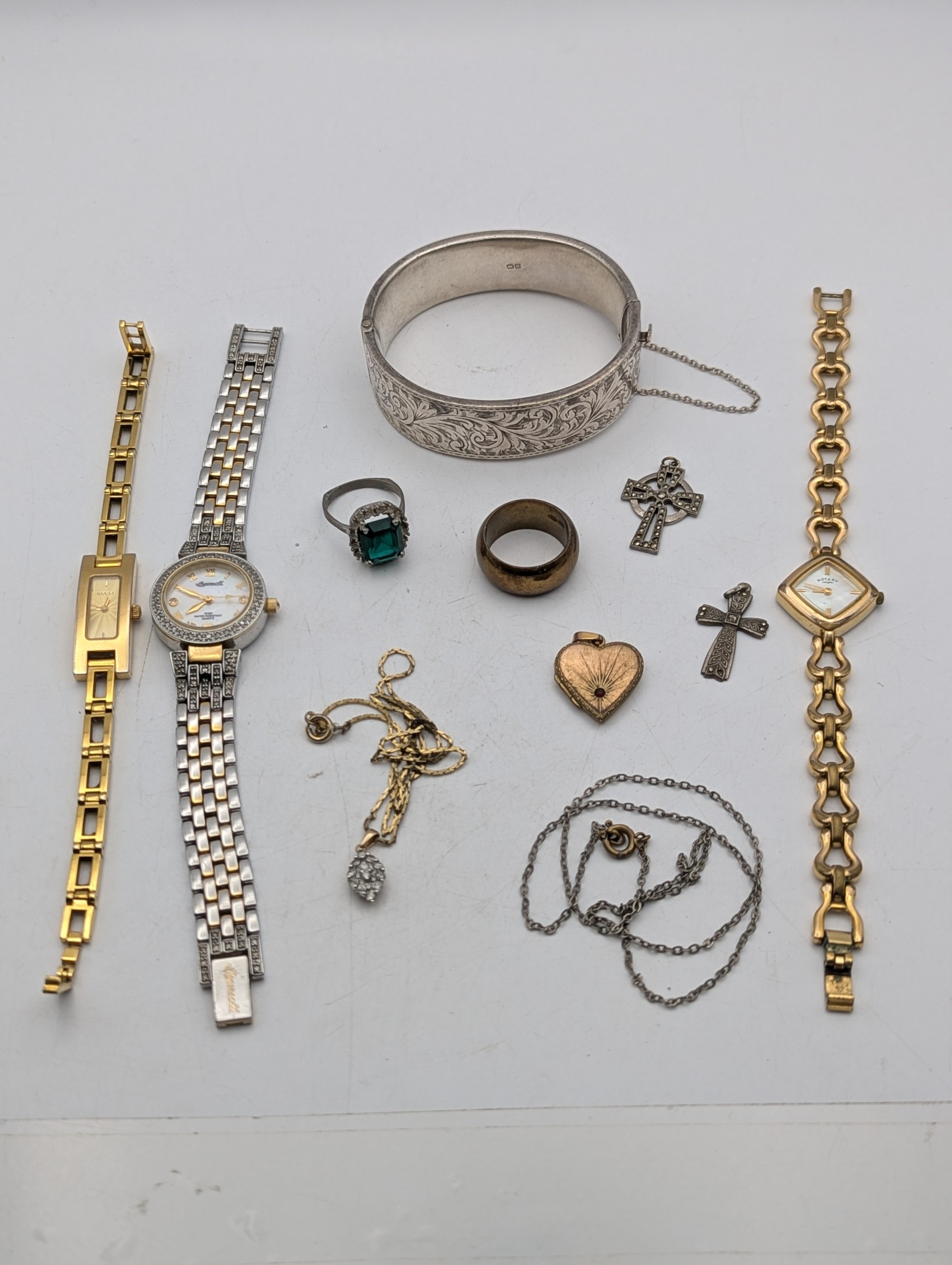 A mixed group of jewellery and three ladies wristwatches to include a silver bangle, 28.6g, gold plated love heart shaped locket, crucifix pendant, a Gucci watch, Rotary and one other