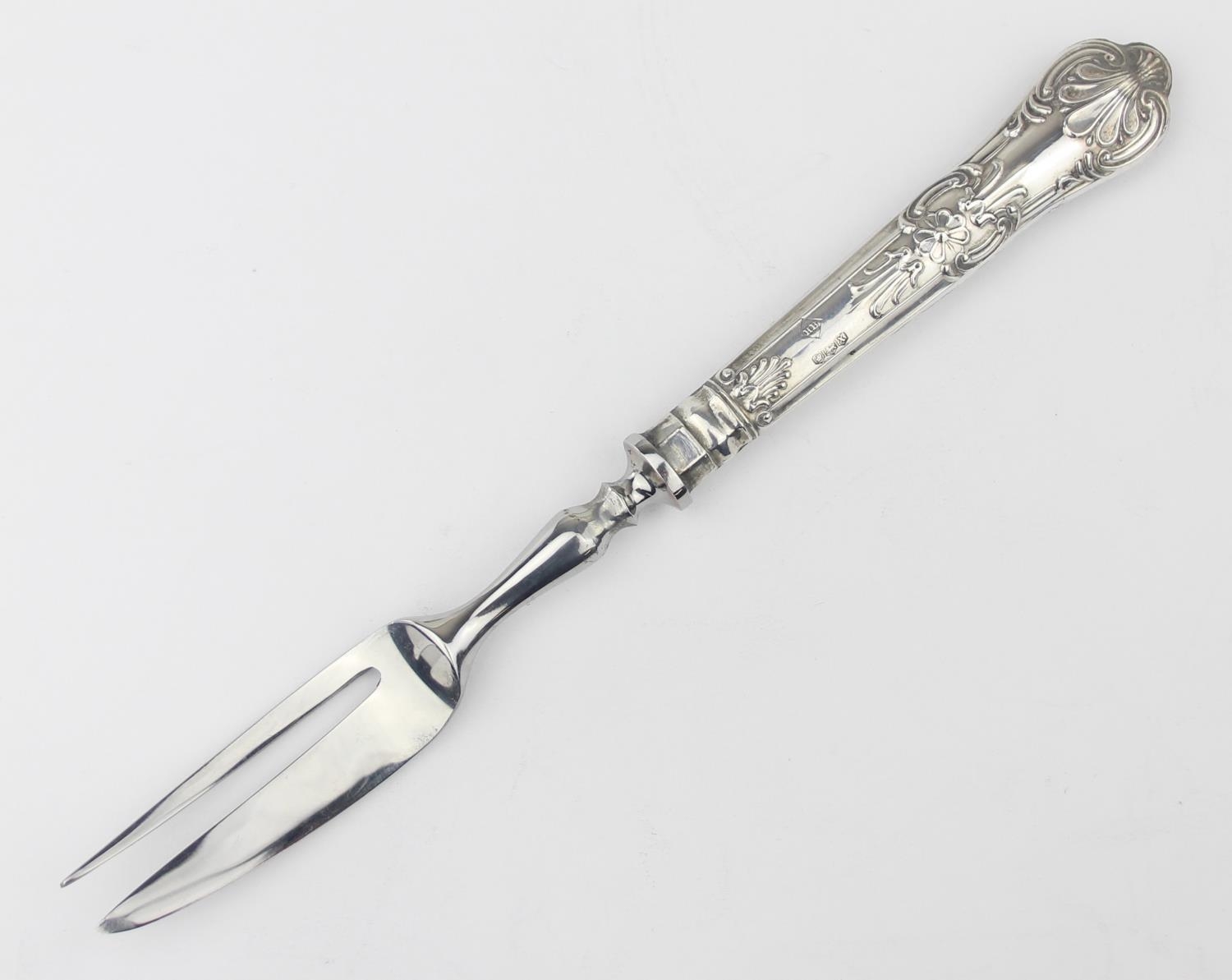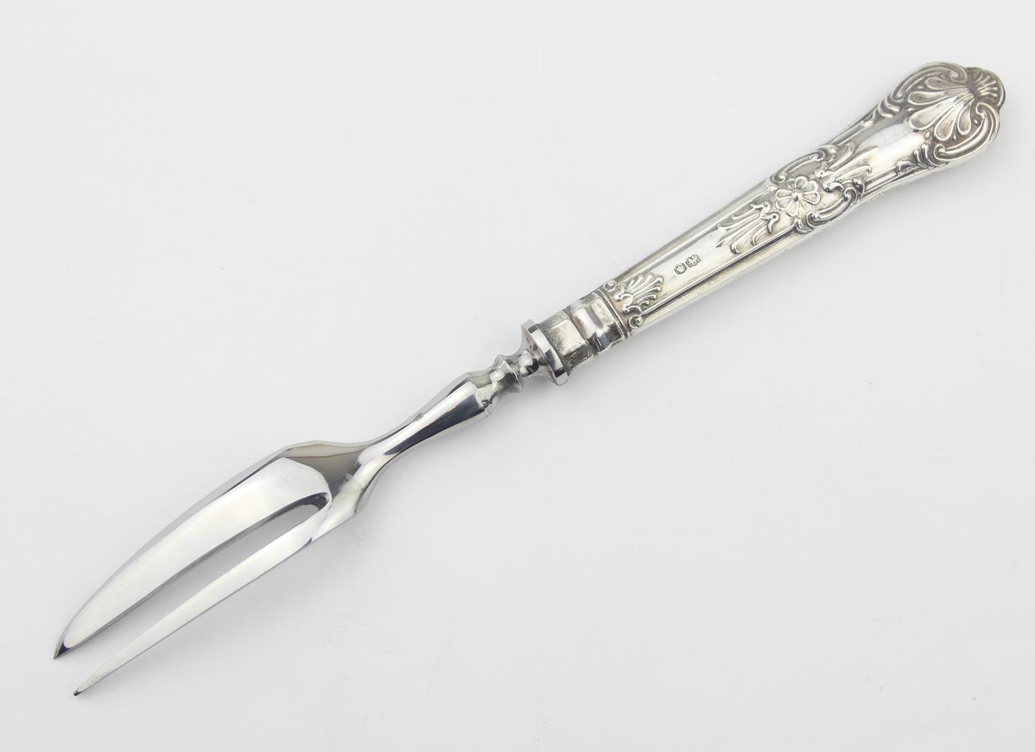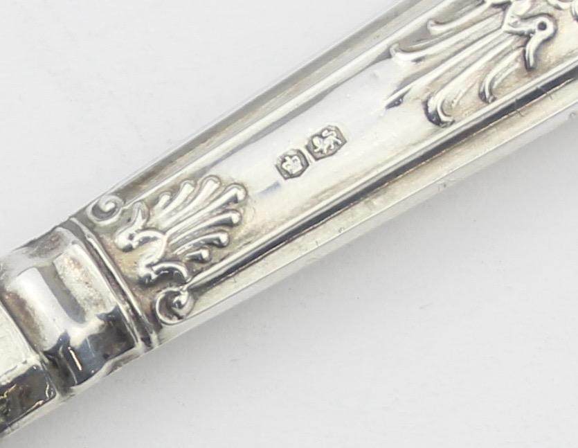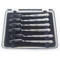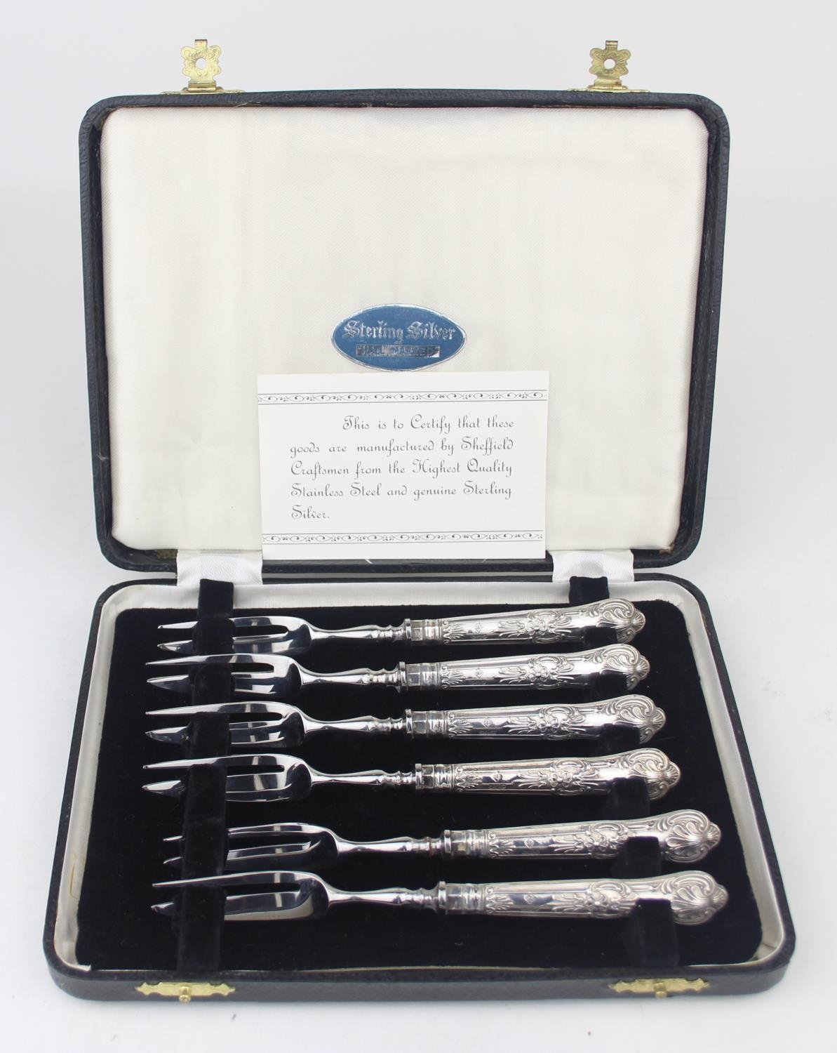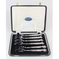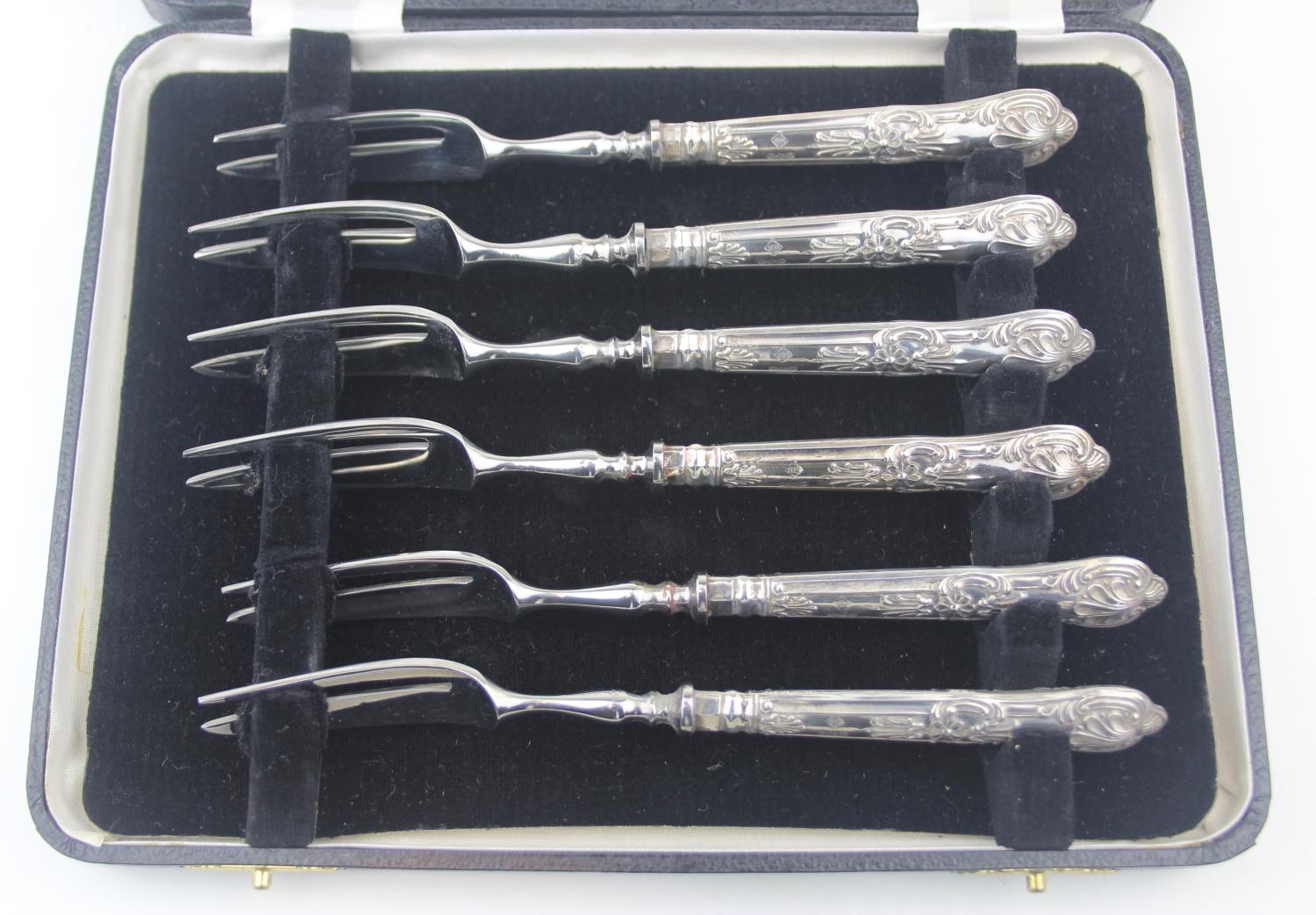 A boxed set of six silver handled cake forks, marked for Sheffield 1965 by Harrison Brothers, boxed with original paperwork, seemingly never used